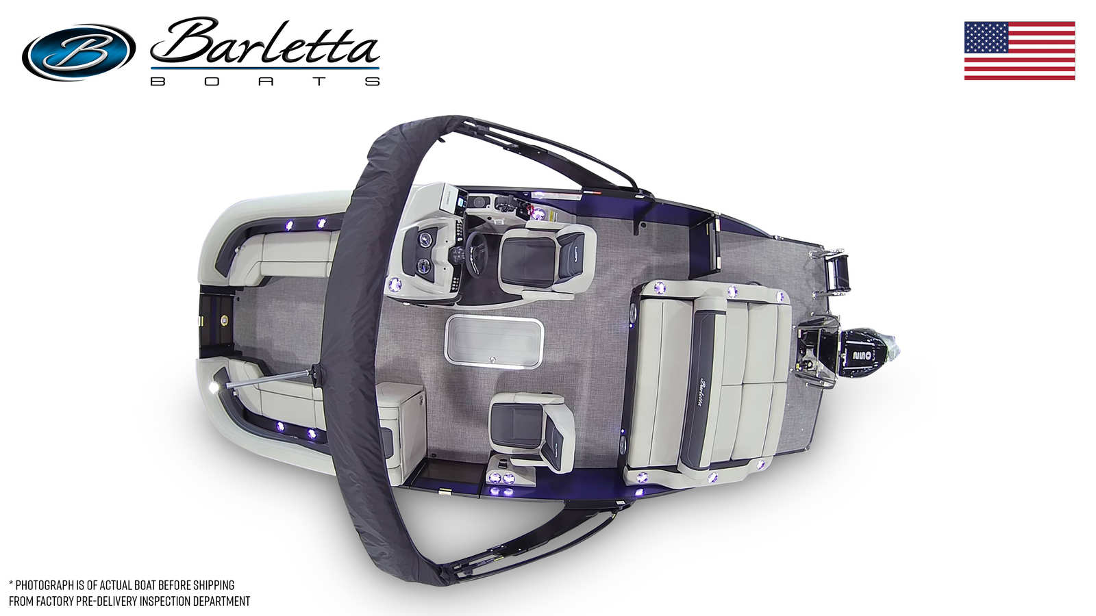 Step aboard the Barletta Cabrio C24UC and you’ll immediately notice its luxurious flooring in Amore Gray, which adds a touch of elegance and comfort underfoot. The Marquesan Gray furniture with Onyx accents creates a sophisticated and inviting atmosphere, perfect for socializing or unwinding. The Railskin color accent in Bohemian Blue provides a striking visual contrast, ensuring your pontoon stands out wherever you go.One of the standout features is the Interior RGB Lighting Package Cabrio, allowing you to customize the ambiance to suit any mood or occasion. Whether you’re hosting a lively gathering or enjoying a quiet evening cruise, the lighting package sets the perfect tone. The Triple Toon Package with midship storage maximizes stability and performance, while also offering convenient storage solutions for gear and essentials.Navigation and entertainment are elevated with the Simrad 7" G07 XSR Chartplotter/Multifunction Display, providing intuitive access to maps, navigation tools, and system controls. The stainless steel flag pole with an American flag adds a patriotic touch, while the onboard battery charger for two batteries ensures you’re always powered up and ready to go.
