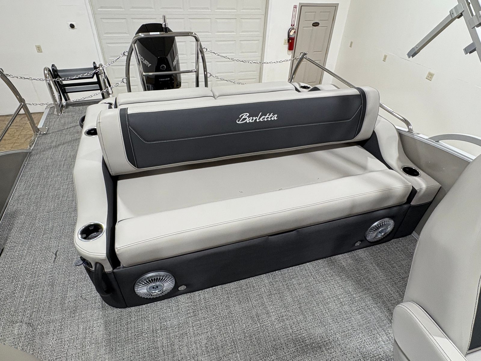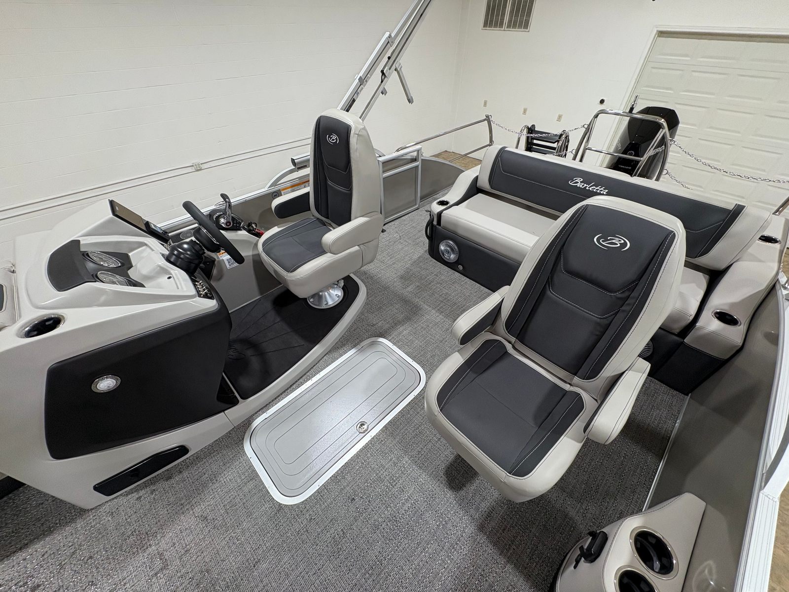 Step aboard the Barletta Cabrio C24UC and discover a world of premium features designed to elevate your time on the water. The Railskin Color in Gray Moonstone, accented with Champagne, gives the exterior a sophisticated and contemporary look. Inside, the Marquesan Gray furniture with Onyx accents offers plush seating and a refined ambiance, complemented by Amore Gray flooring that’s both stylish and easy to maintain.The Triple Toon Package with midship storage is a standout feature, providing enhanced stability, improved handling, and ample space for storing gear, water toys, or picnic essentials. The Mercury Digital DTS Pre-Rig and Vessel Link system ensure that your engine is ready for peak performance, while hydraulic and power assist steering make every journey smooth and effortless. Digital gauges keep you informed and in control, and the rigged engine with a stainless steel prop delivers reliable power and efficiency.On the exterior, you’ll find thoughtful touches like a stainless steel flag pole with an American flag, adding a patriotic flair, and stainless steel safety stanchions with chains for added security and peace of mind. Every detail of this pontoon boat has been carefully considered to maximize comfort, safety, and enjoyment.