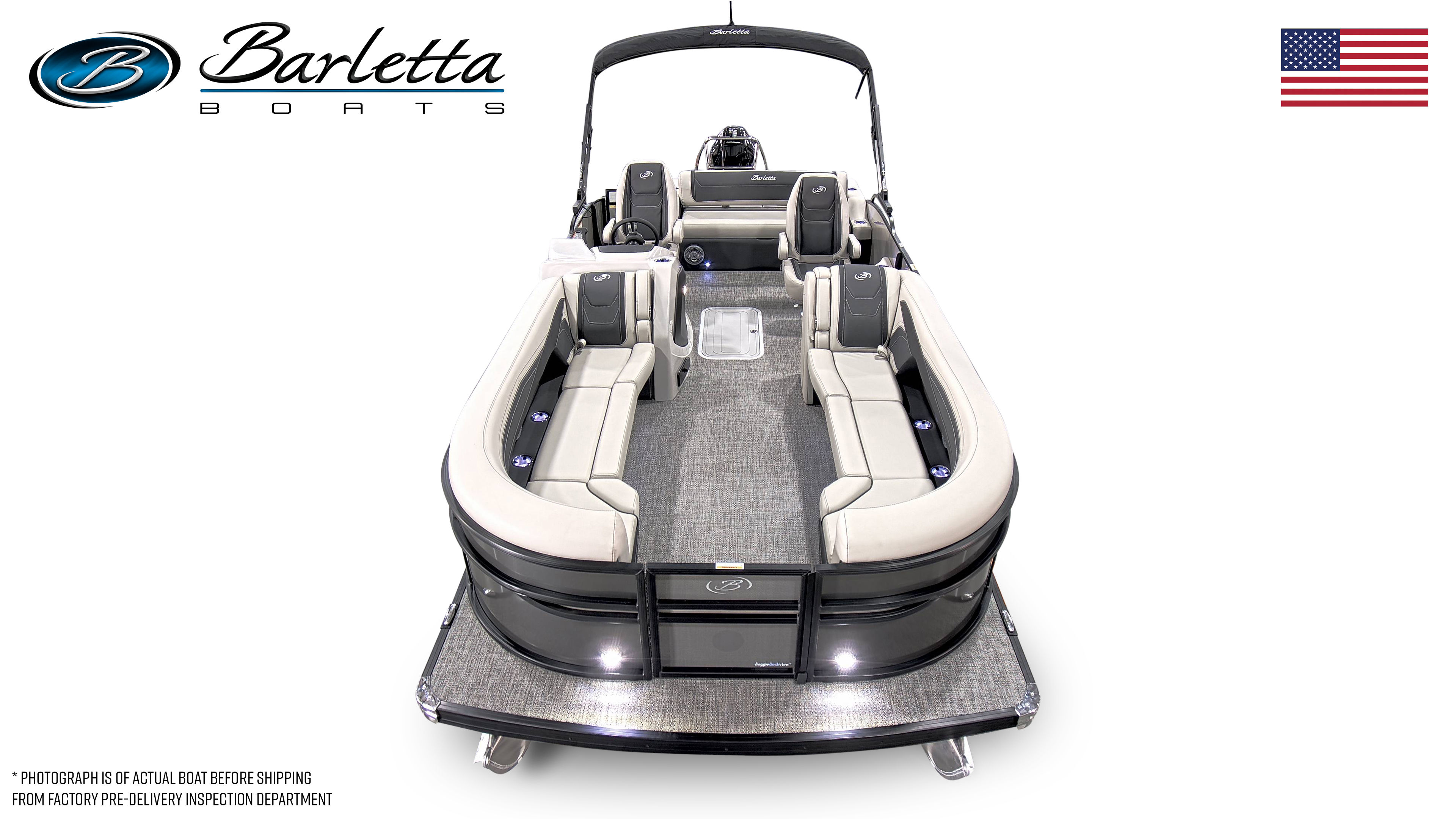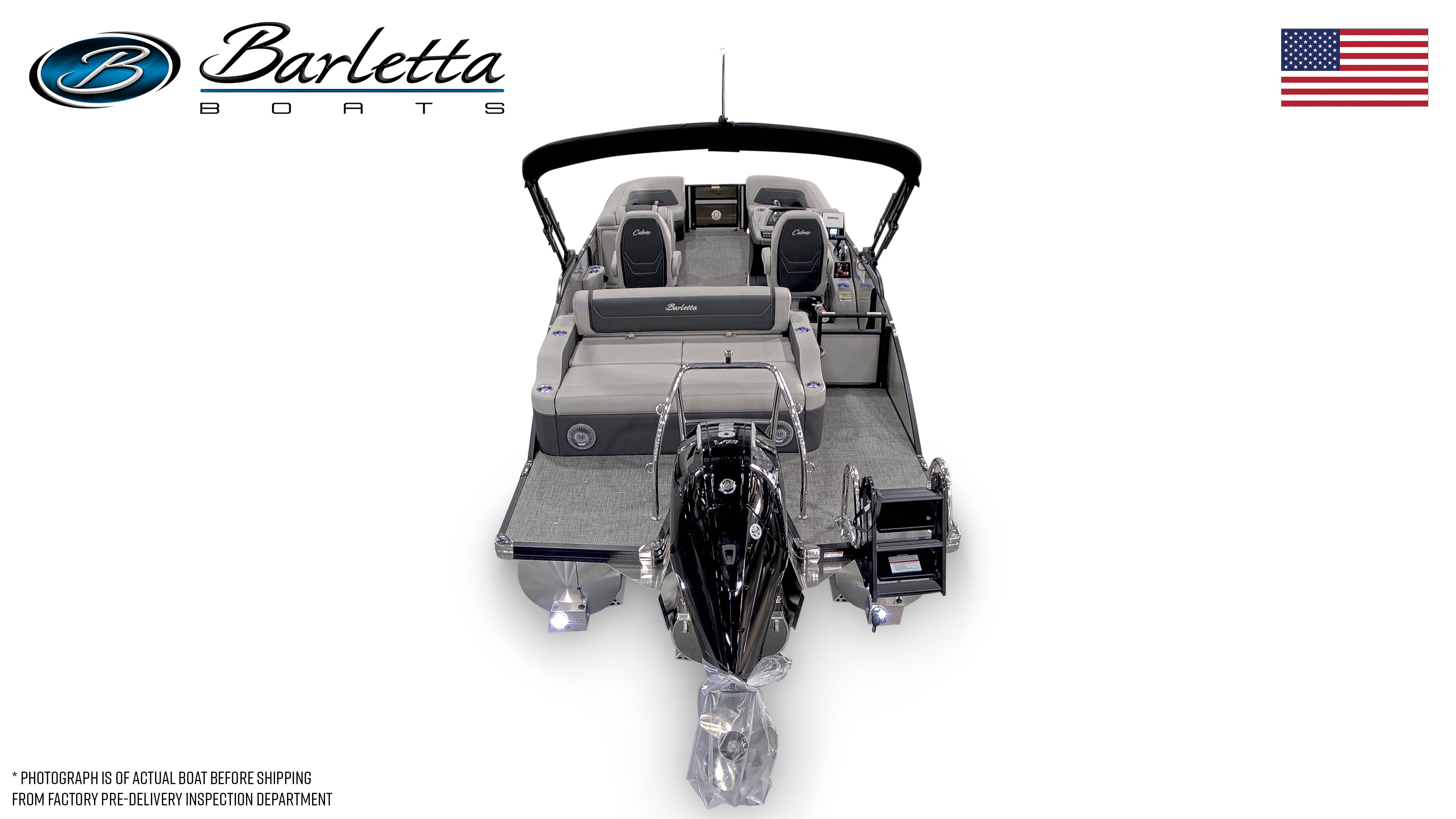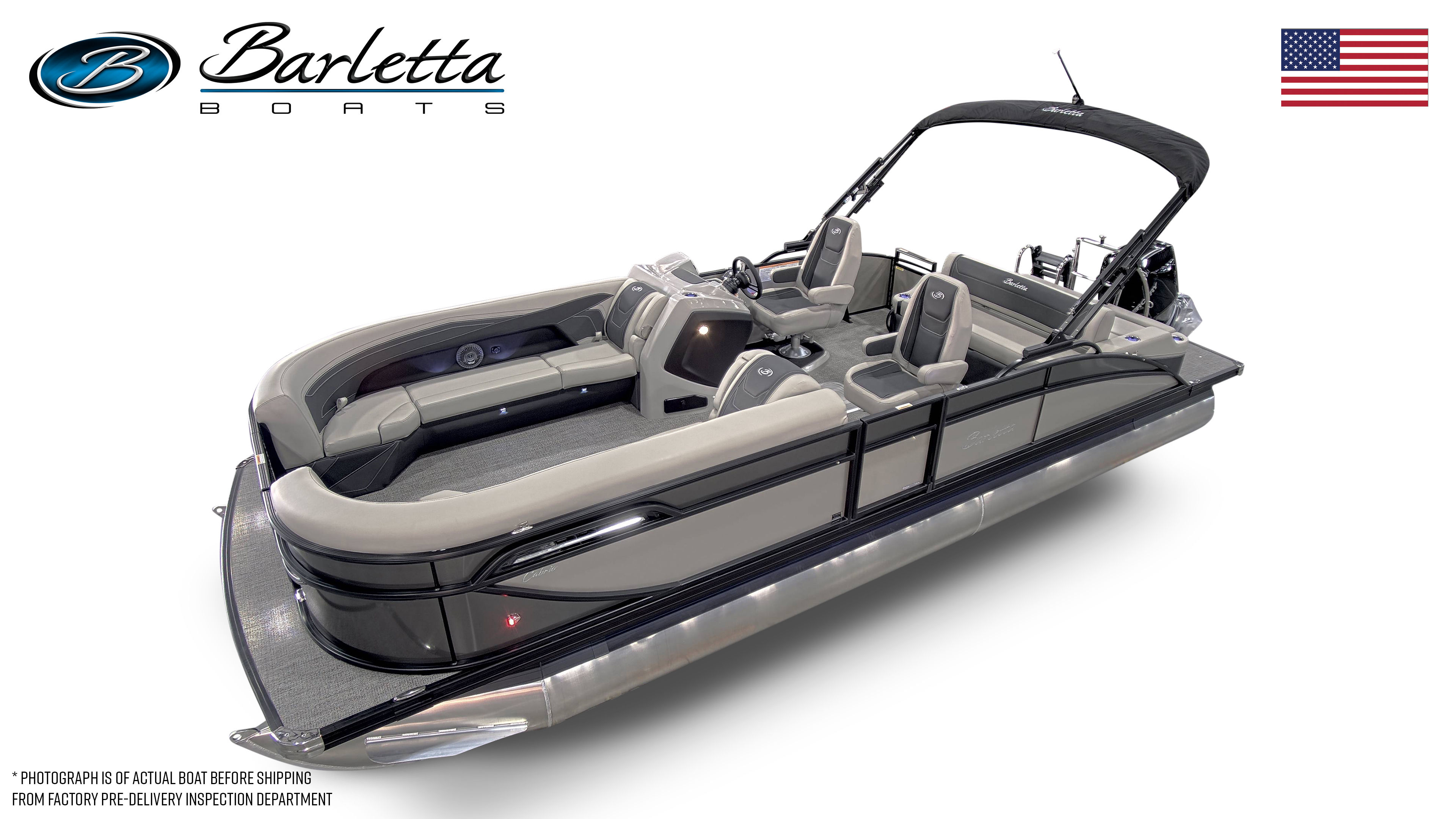 The Barletta Cabrio C24UC is loaded with special features that set it apart from other pontoon boats for sale. The striking Railskin in Gray Moonstone, accented with Champagne, gives the boat a sophisticated and modern appearance. The Blackout Package Cabrio adds a bold touch, making this pontoon a true head-turner on the water. Inside, the Marquesan Gray furniture with Onyx accents creates a luxurious and inviting atmosphere, while the Amore Gray flooring offers both style and durability.One of the standout features is the Triple Toon Package with midship storage, providing enhanced stability, improved handling, and additional storage space for all your gear. The stainless steel flag pole with an American flag adds a patriotic flair to your boating adventures, making every outing feel special. The rigged engine with a stainless steel prop ensures long-lasting performance and reliability, so you can focus on enjoying your time on the water.