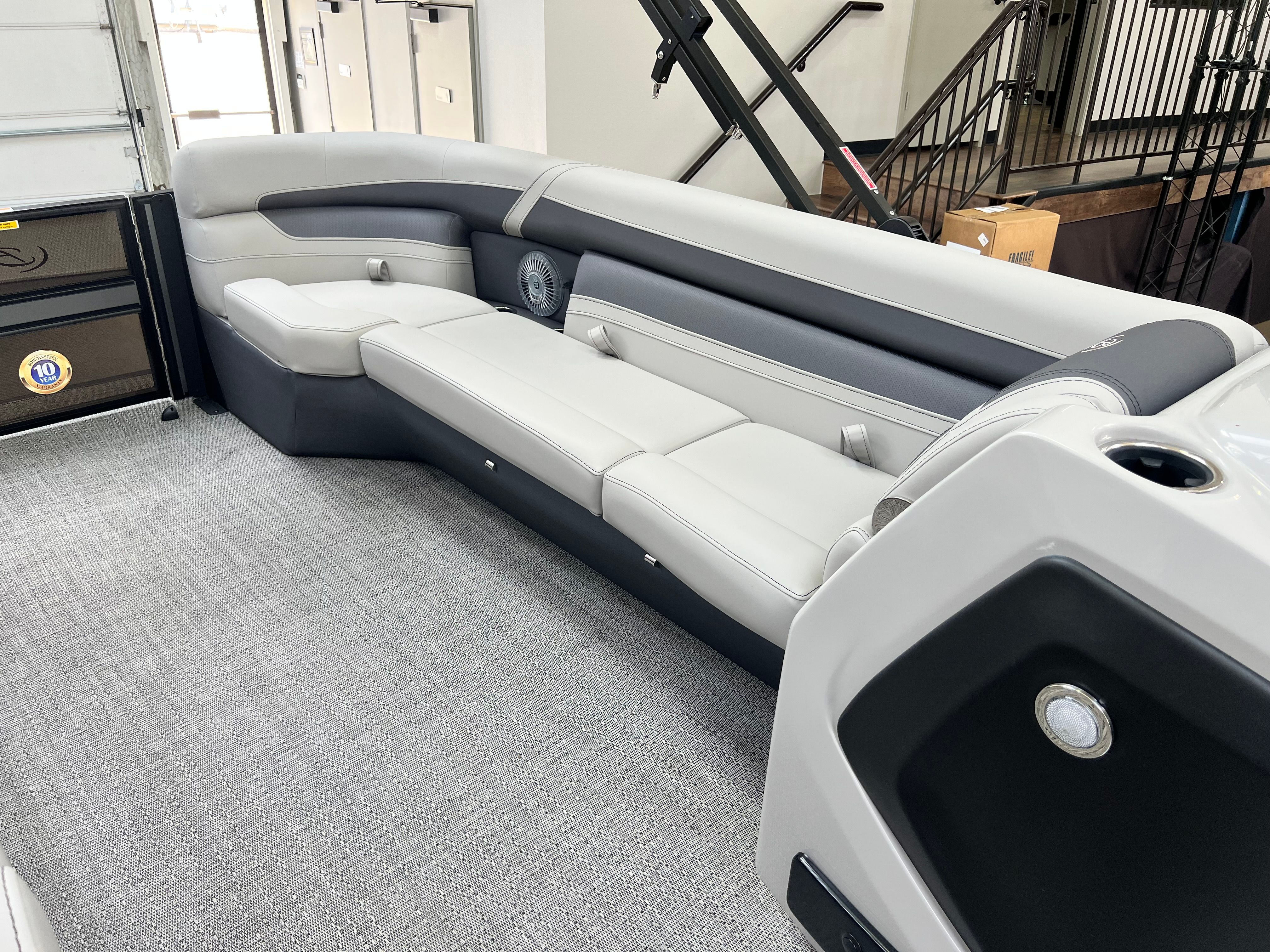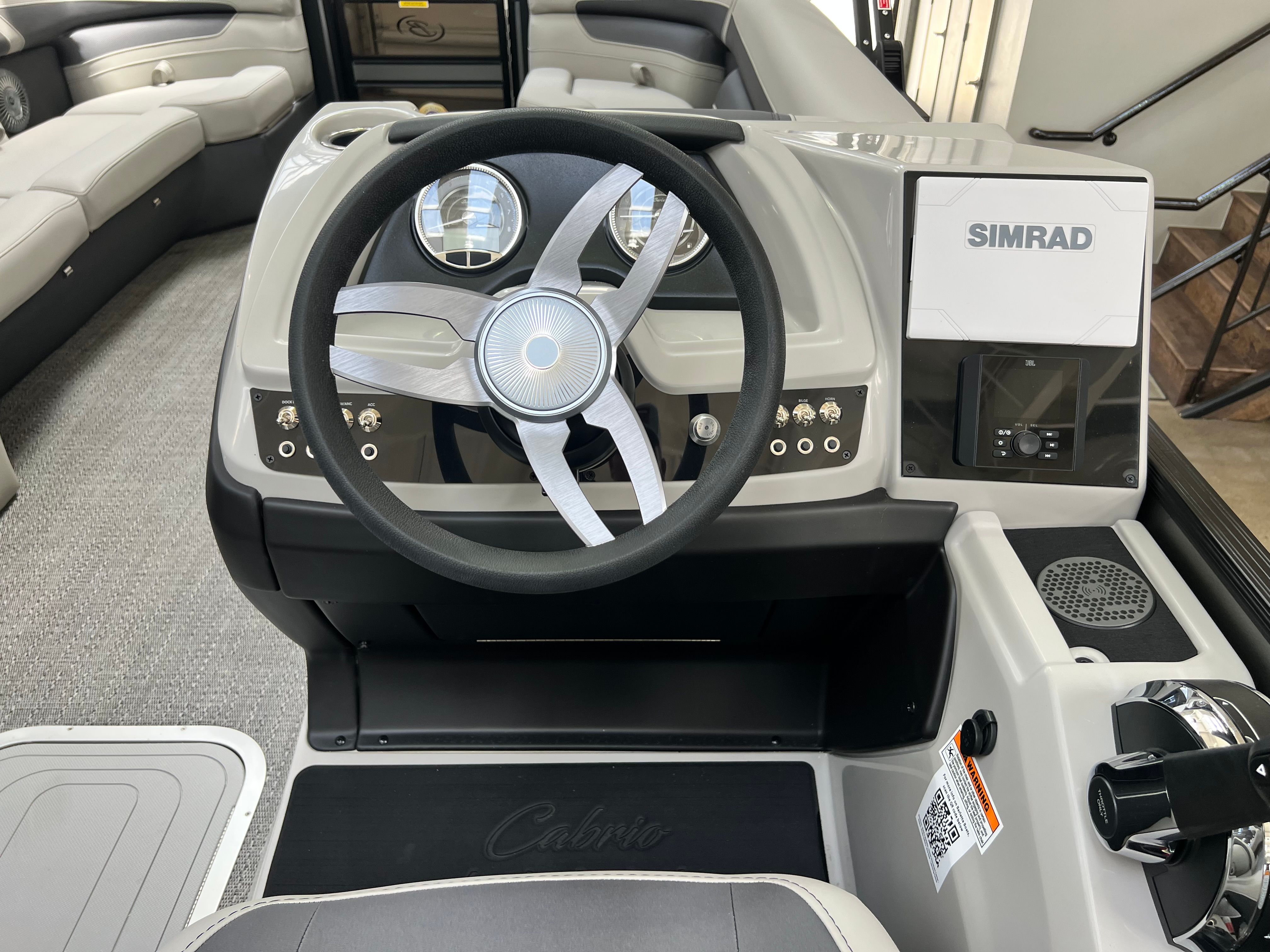 The Cabrio C24UC is loaded with premium features designed to enhance your boating experience. The Metal Jacket Protectant on the exterior provides added durability and protection against the elements, keeping your pontoon looking pristine. The Blackout Package Cabrio railskin adds a touch of sophistication and modern flair, while the Amore Gray flooring offers both comfort and style underfoot.Inside, the Marquesan Gray furniture with charcoal accents creates a welcoming and upscale atmosphere, perfect for relaxing or entertaining guests. The helm is equipped with a Simrad 7 G07 XSR Chartplotter/Multifunction Display, offering advanced navigation and system monitoring at your fingertips. For added convenience, the interior features a table, pedestal, and base with Yeti-ready cupholders, making it easy to enjoy snacks and drinks while you cruise. The stainless steel flag pole with an American flag adds a patriotic touch to your pontoon’s exterior, making a statement wherever you go.