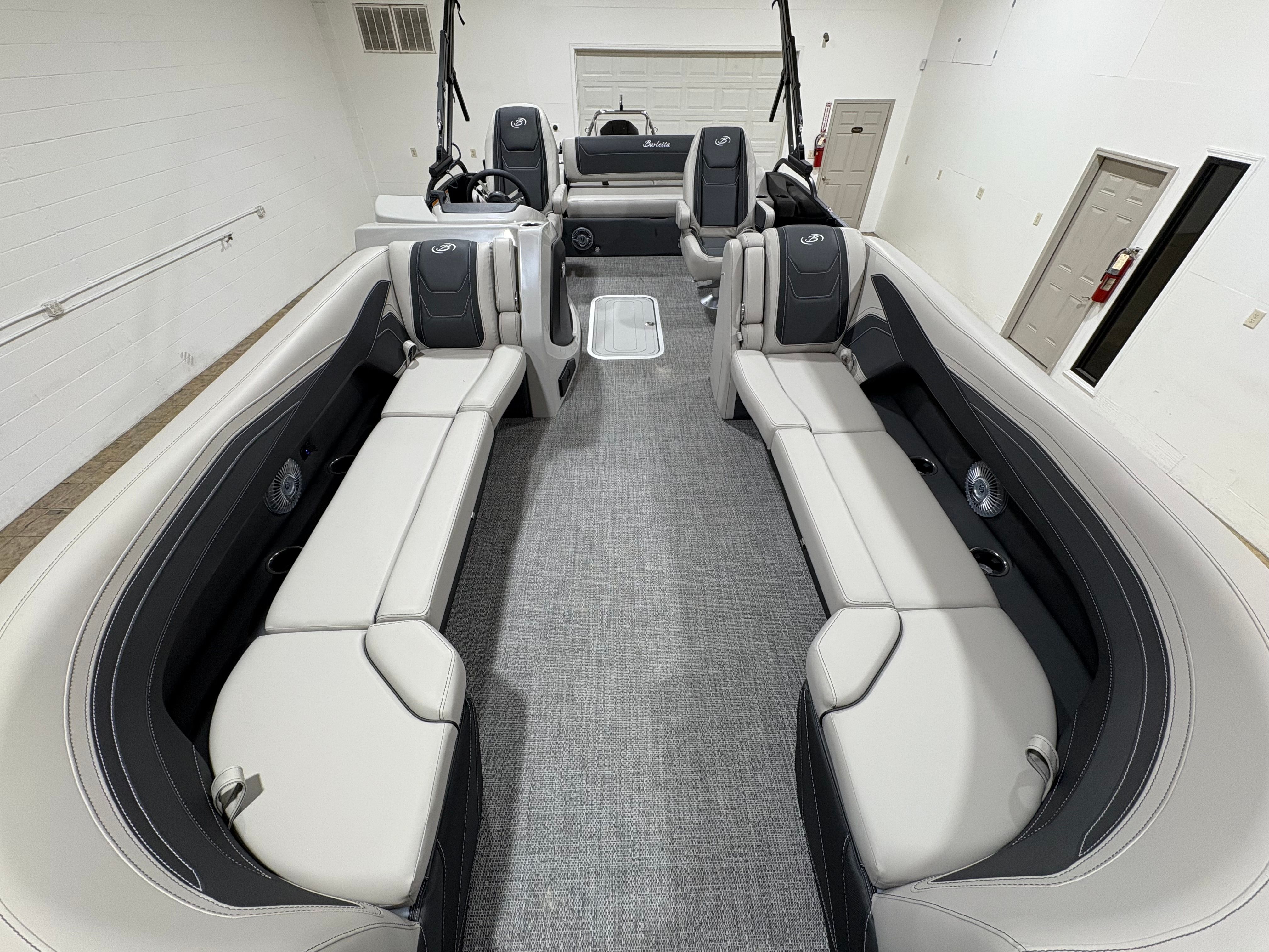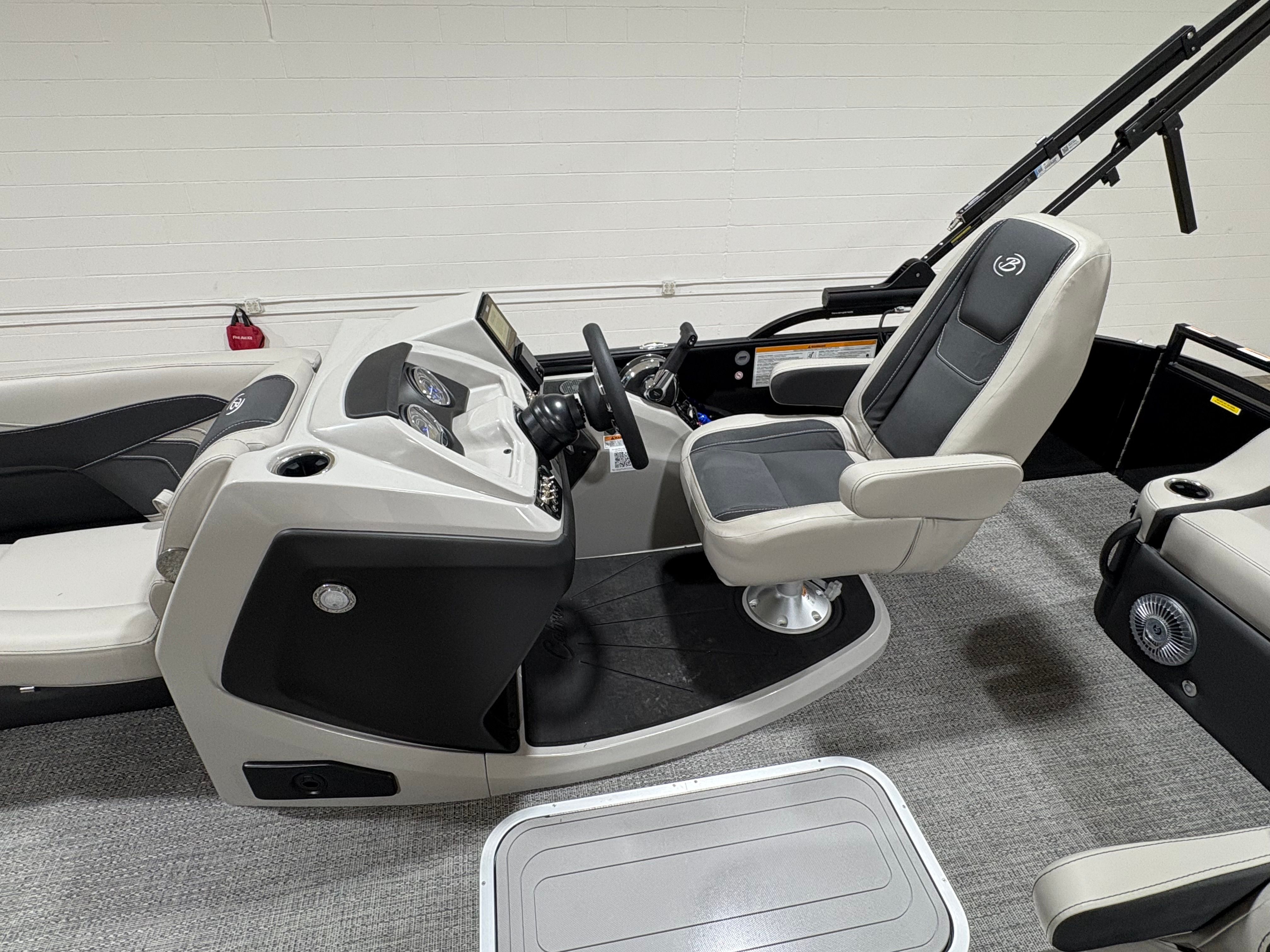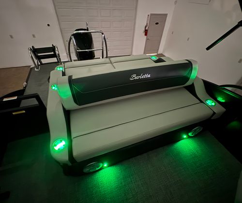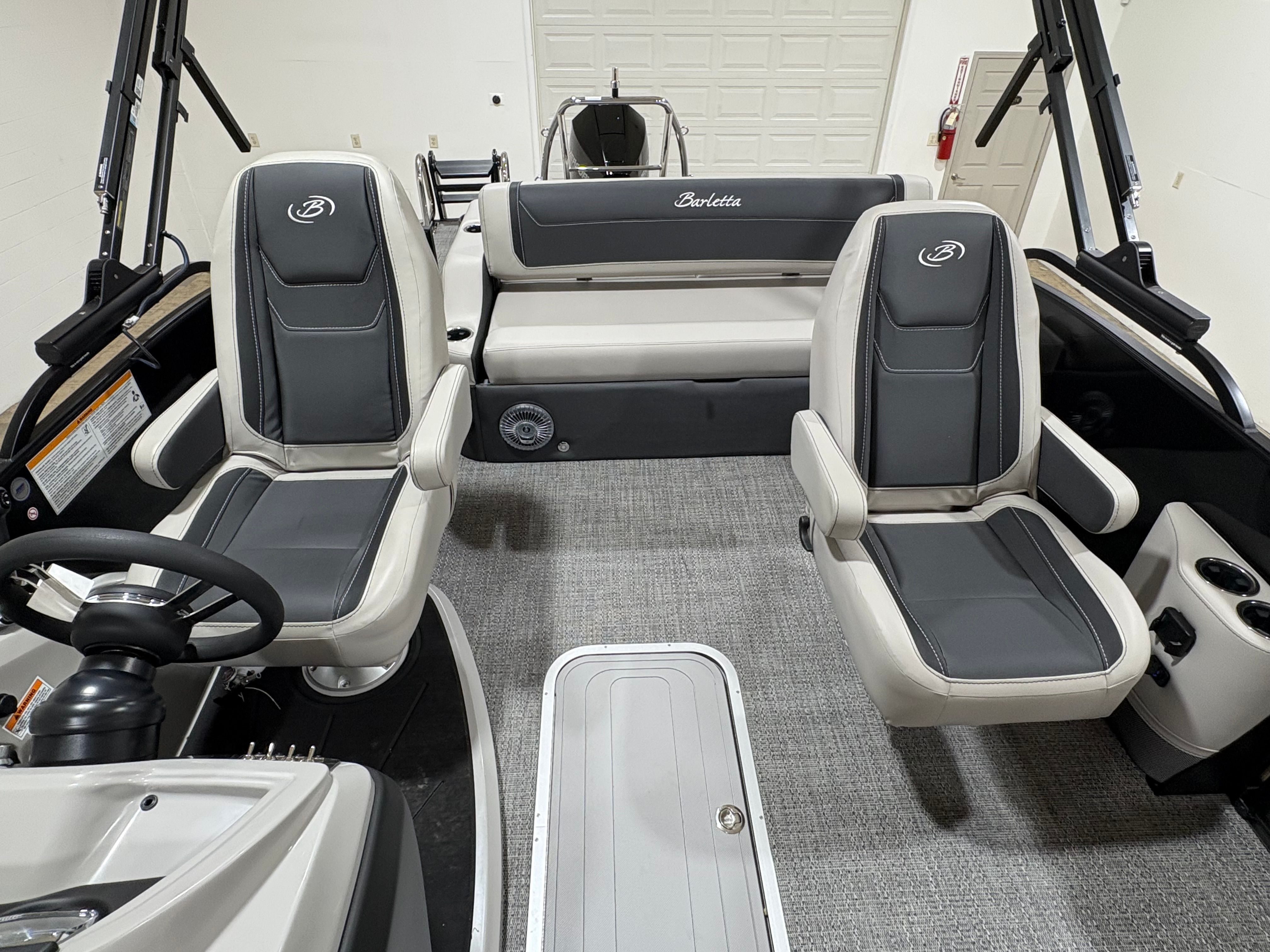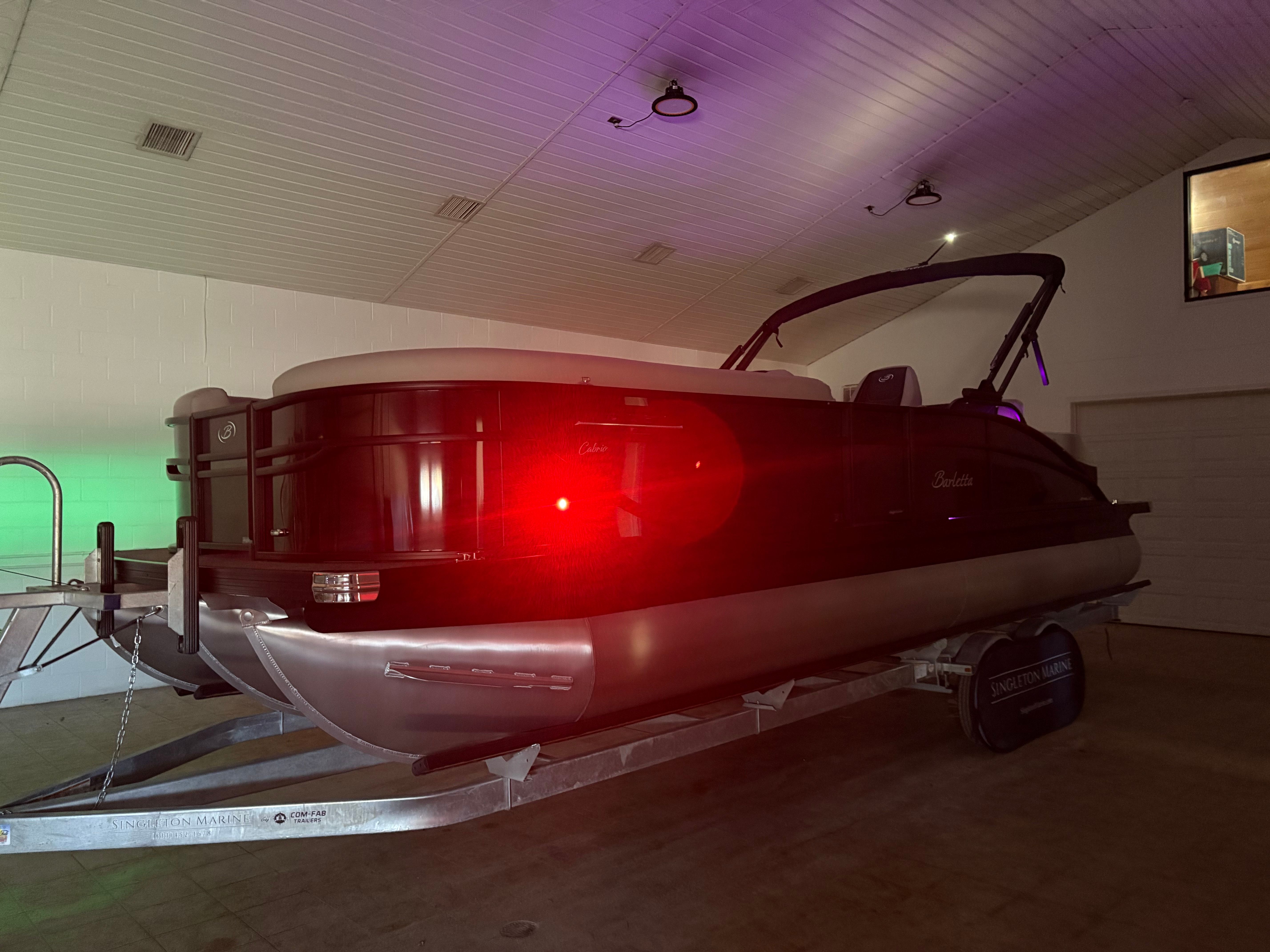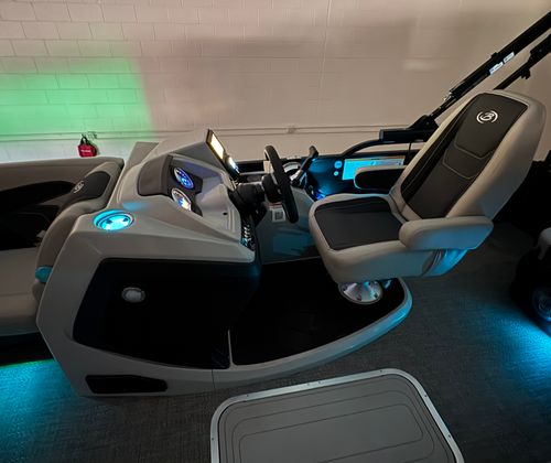 The Barletta Cabrio C24UC is packed with premium features that elevate your boating experience. The Triple Toon Package with midship storage offers superior stability and ample space for gear, ensuring you’re always prepared for a day on the water. The interior RGB lighting package creates a vibrant and customizable ambiance, perfect for evening cruises or lively gatherings. The stainless steel flag pole with an American flag adds a touch of patriotic flair to your pontoon, while the Blackout Package Cabrio enhances the boat’s sleek and modern aesthetic. Every detail, from the Marquesan Gray with Onyx furniture to the Amore Gray flooring, is designed to maximize comfort and style.