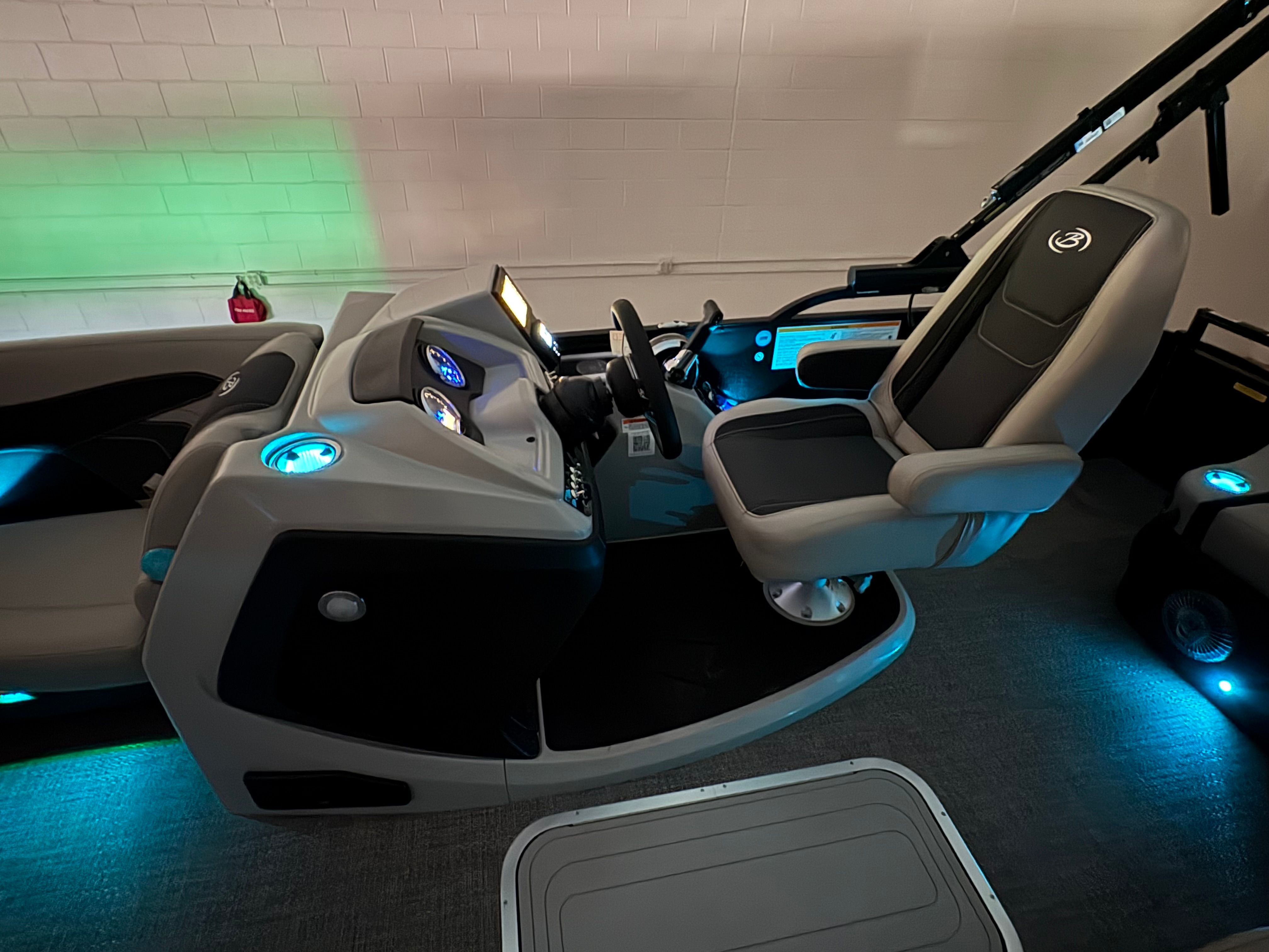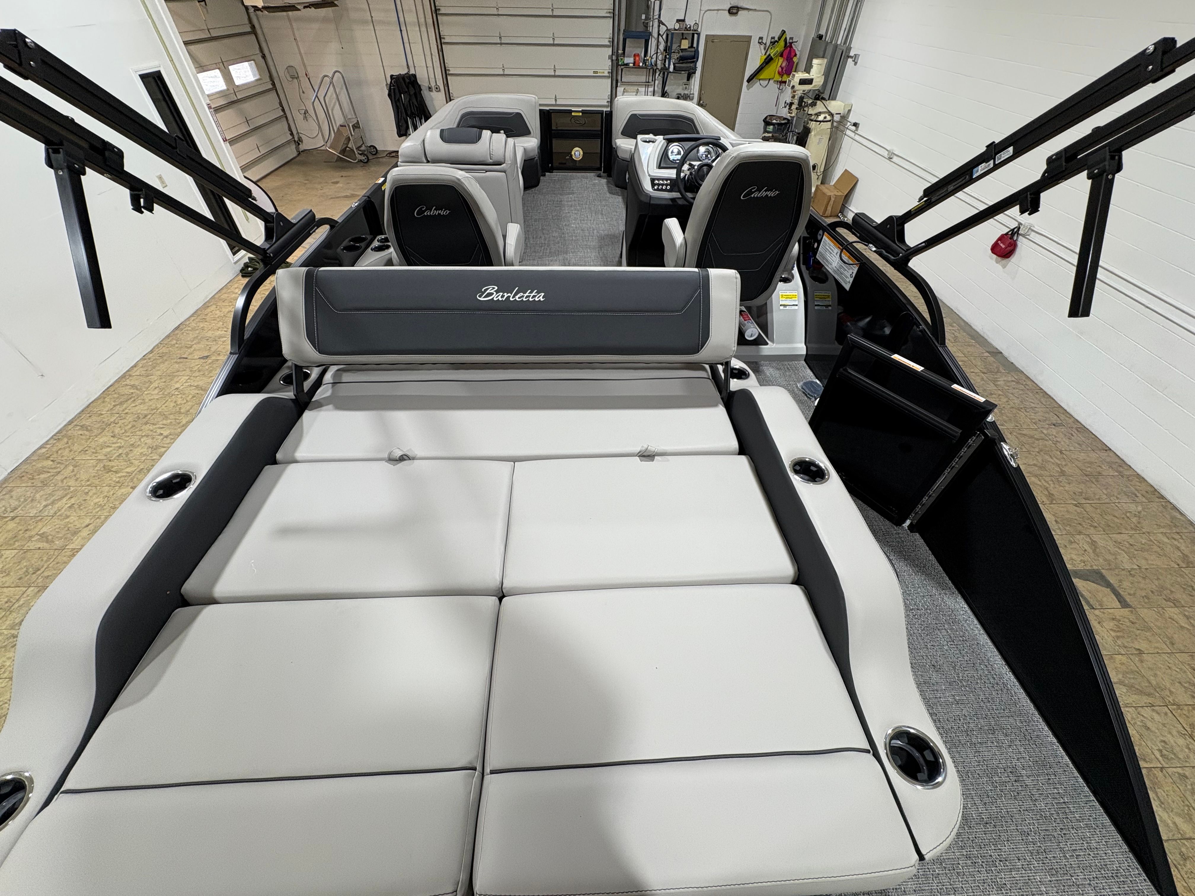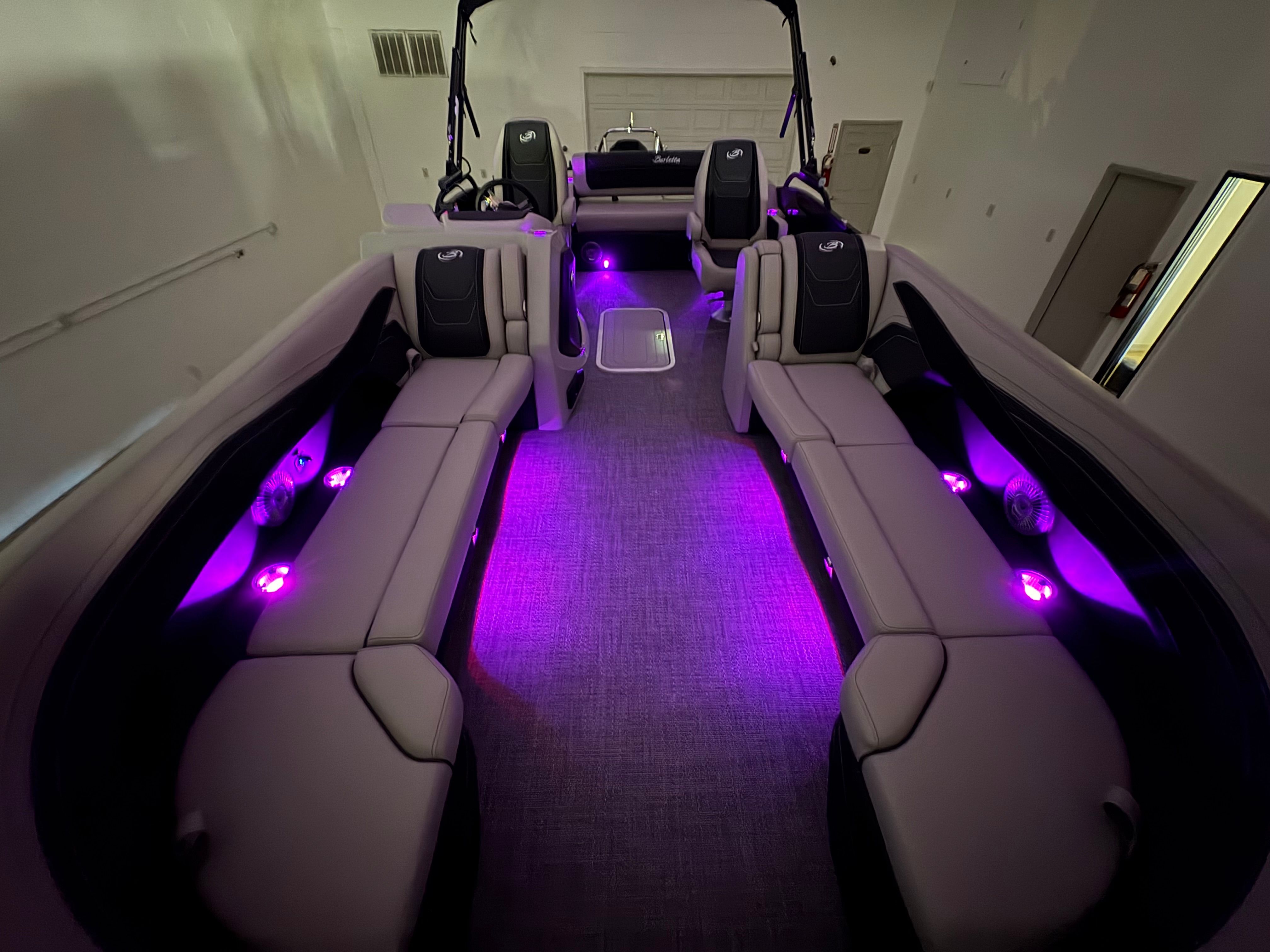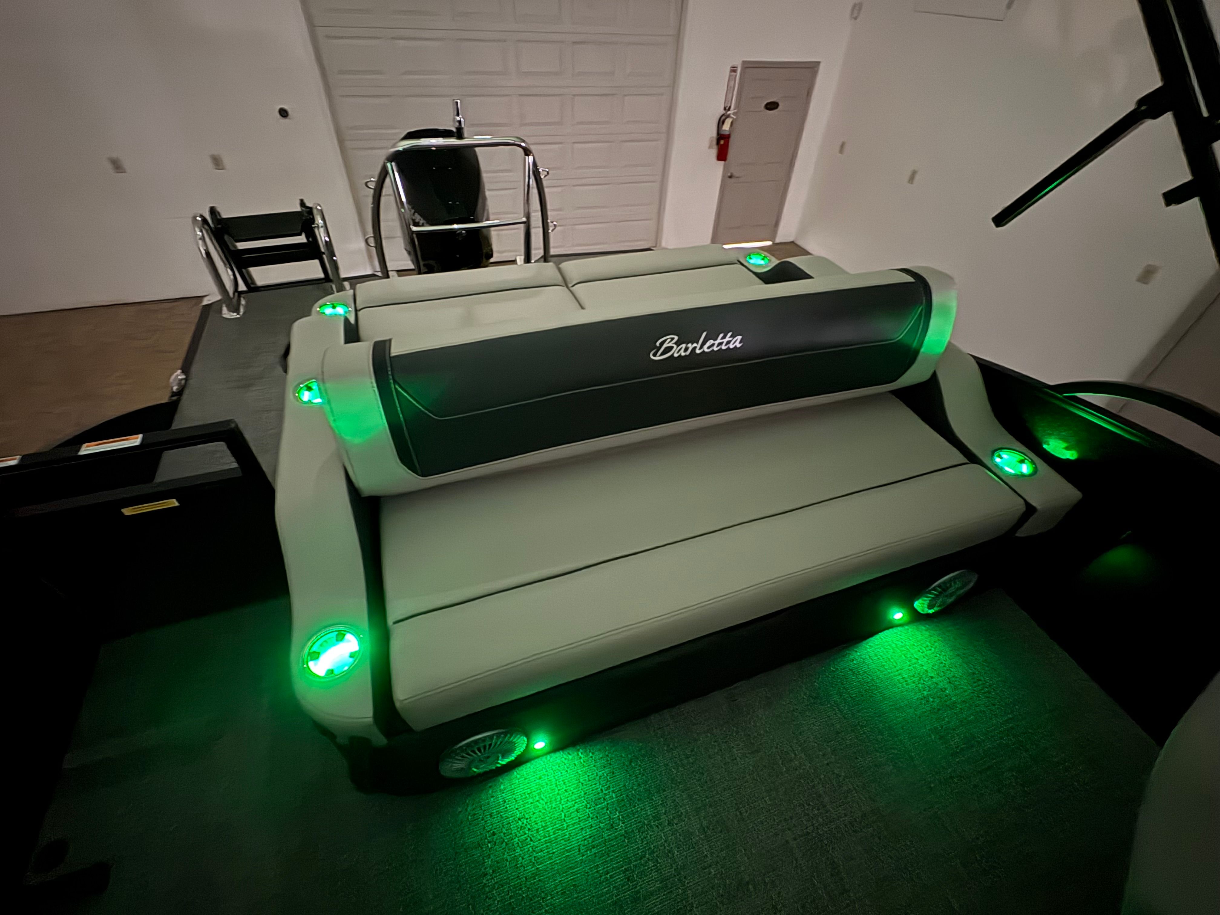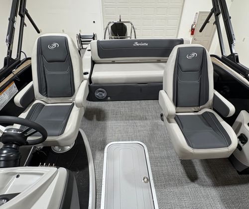 The Barletta Cabrio C24UC is packed with premium features that elevate your boating experience. The Triple Toon Package with midship storage offers superior stability and ample space for gear, ensuring you’re always prepared for a day on the water. The interior RGB lighting package creates a vibrant and customizable ambiance, perfect for evening cruises or lively gatherings. The stainless steel flag pole with an American flag adds a touch of patriotic flair to your pontoon, while the Blackout Package Cabrio enhances the boat’s sleek and modern aesthetic. Every detail, from the Marquesan Gray with Onyx furniture to the Amore Gray flooring, is designed to maximize comfort and style.