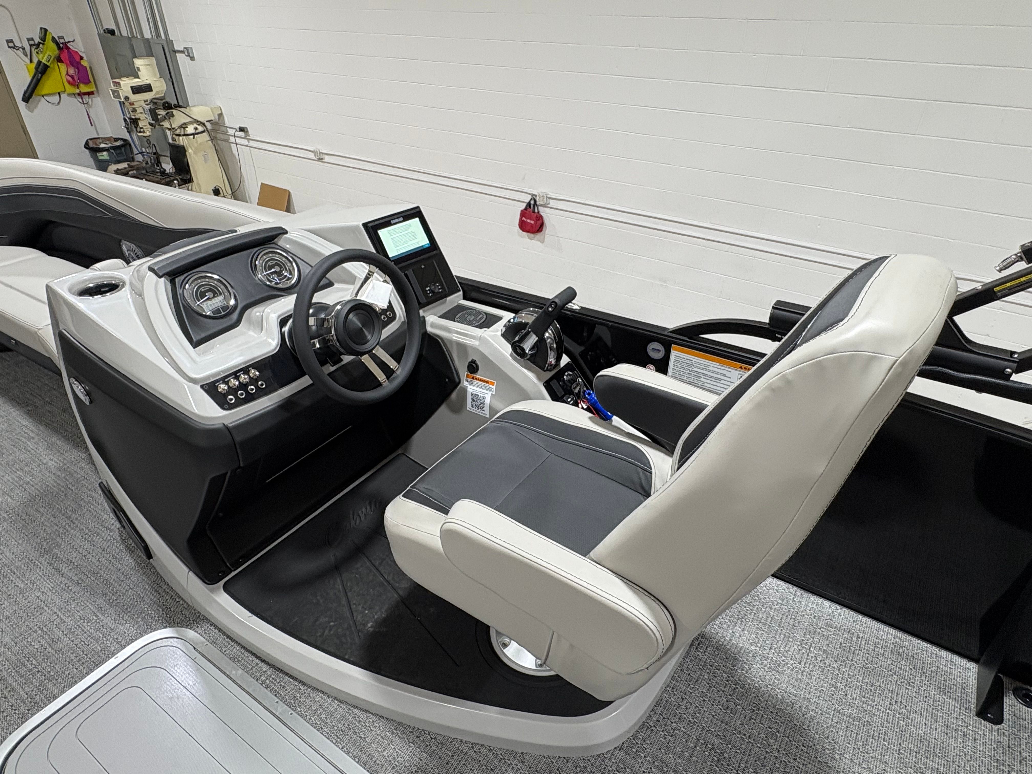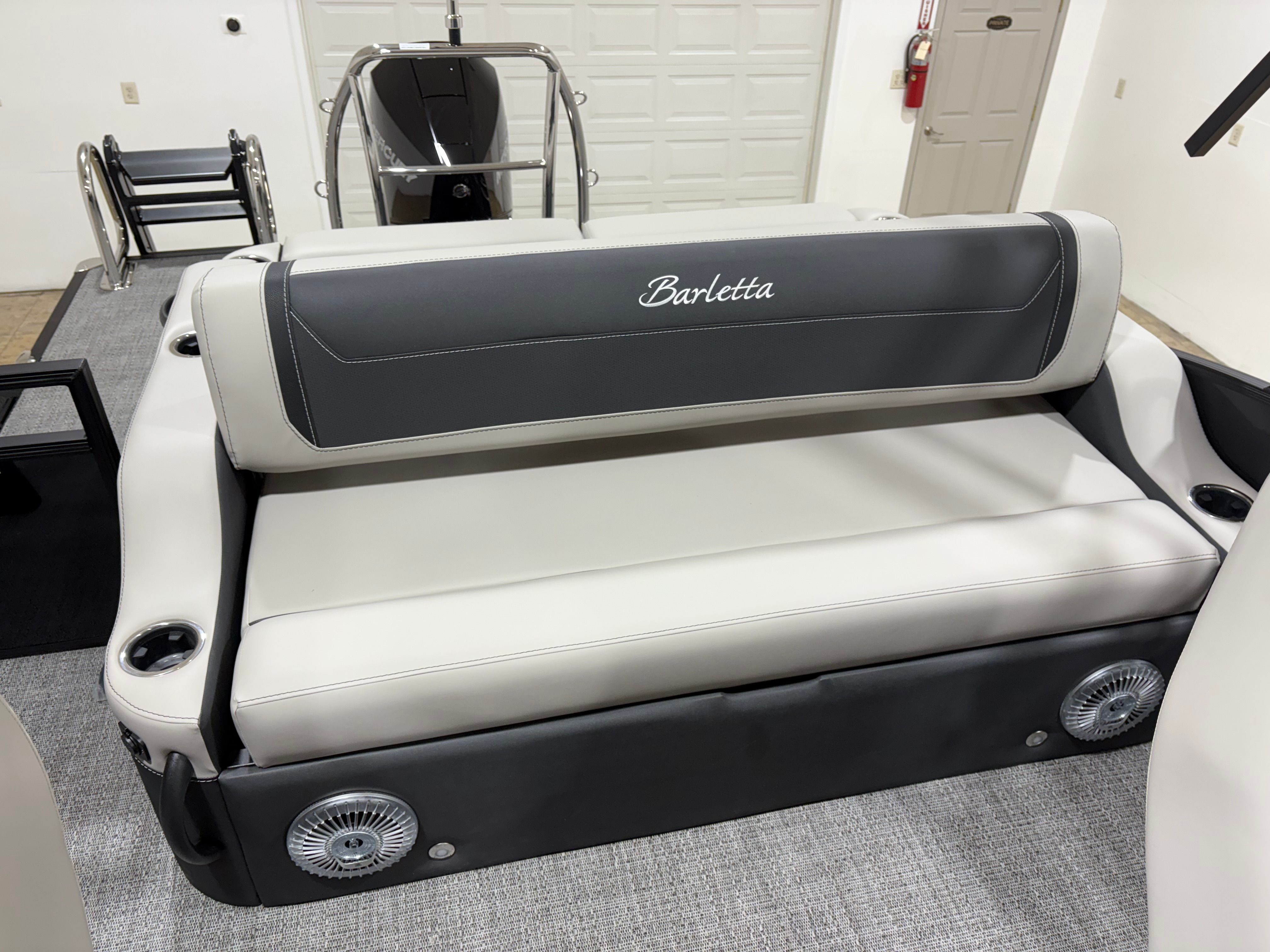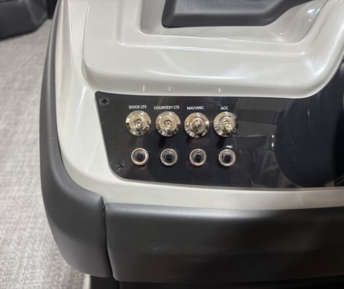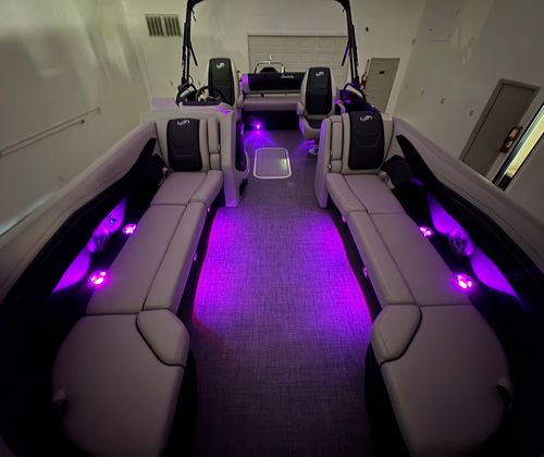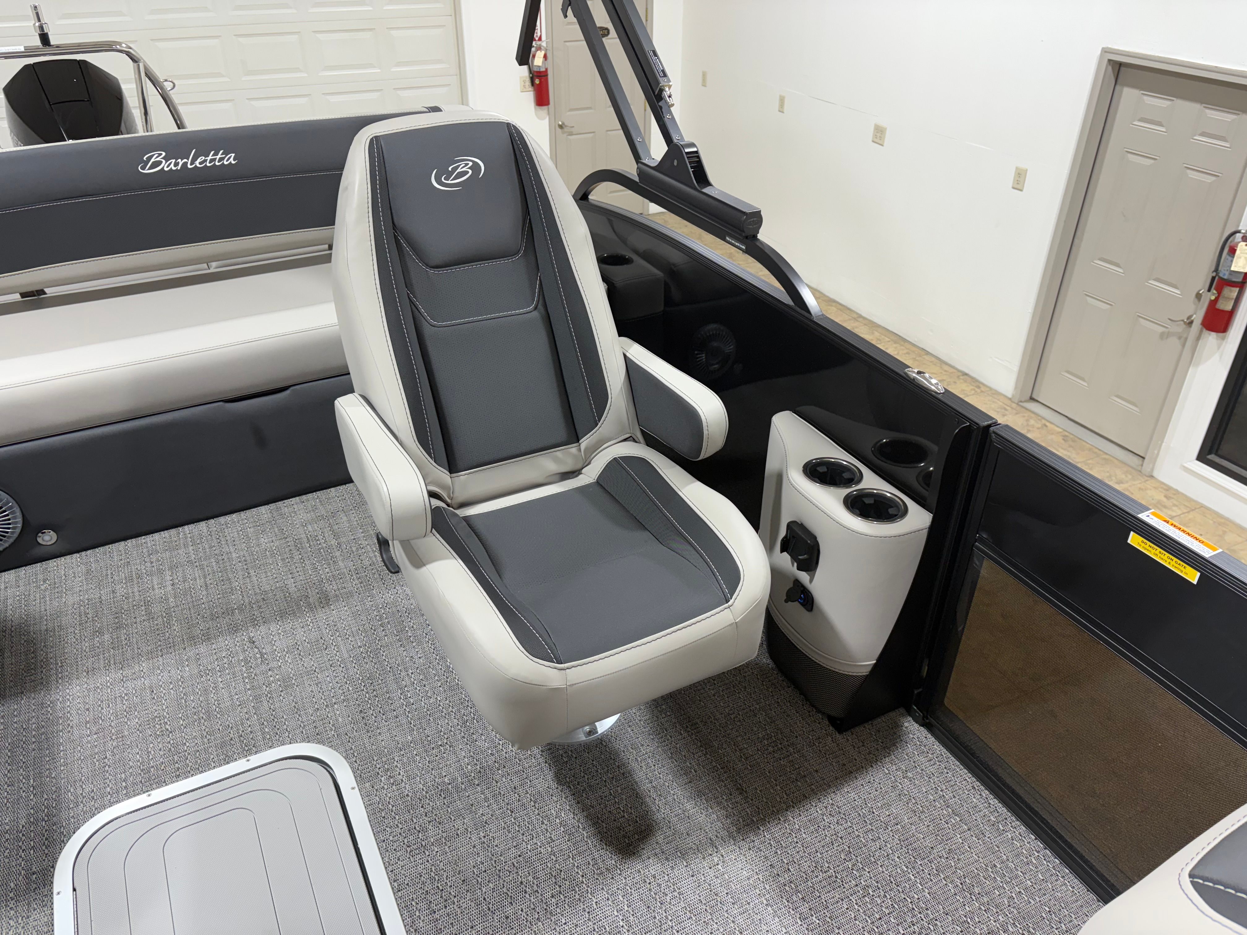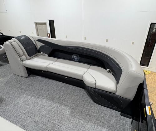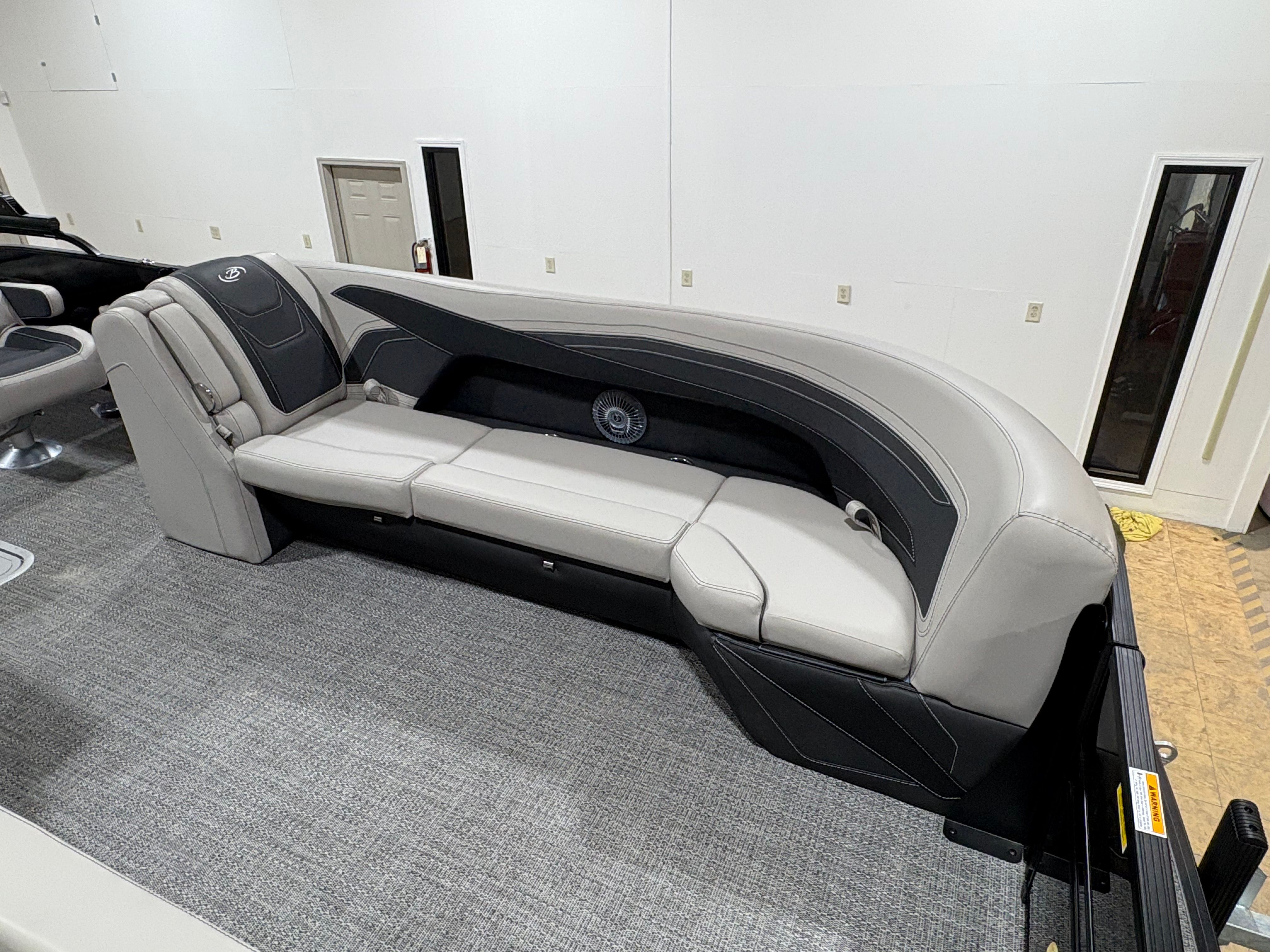 The Barletta Cabrio C24UC is packed with premium features that elevate your boating experience. The Triple Toon Package with midship storage offers superior stability and ample space for gear, ensuring you’re always prepared for a day on the water. The interior RGB lighting package creates a vibrant and customizable ambiance, perfect for evening cruises or lively gatherings. The stainless steel flag pole with an American flag adds a touch of patriotic flair to your pontoon, while the Blackout Package Cabrio enhances the boat’s sleek and modern aesthetic. Every detail, from the Marquesan Gray with Onyx furniture to the Amore Gray flooring, is designed to maximize comfort and style.