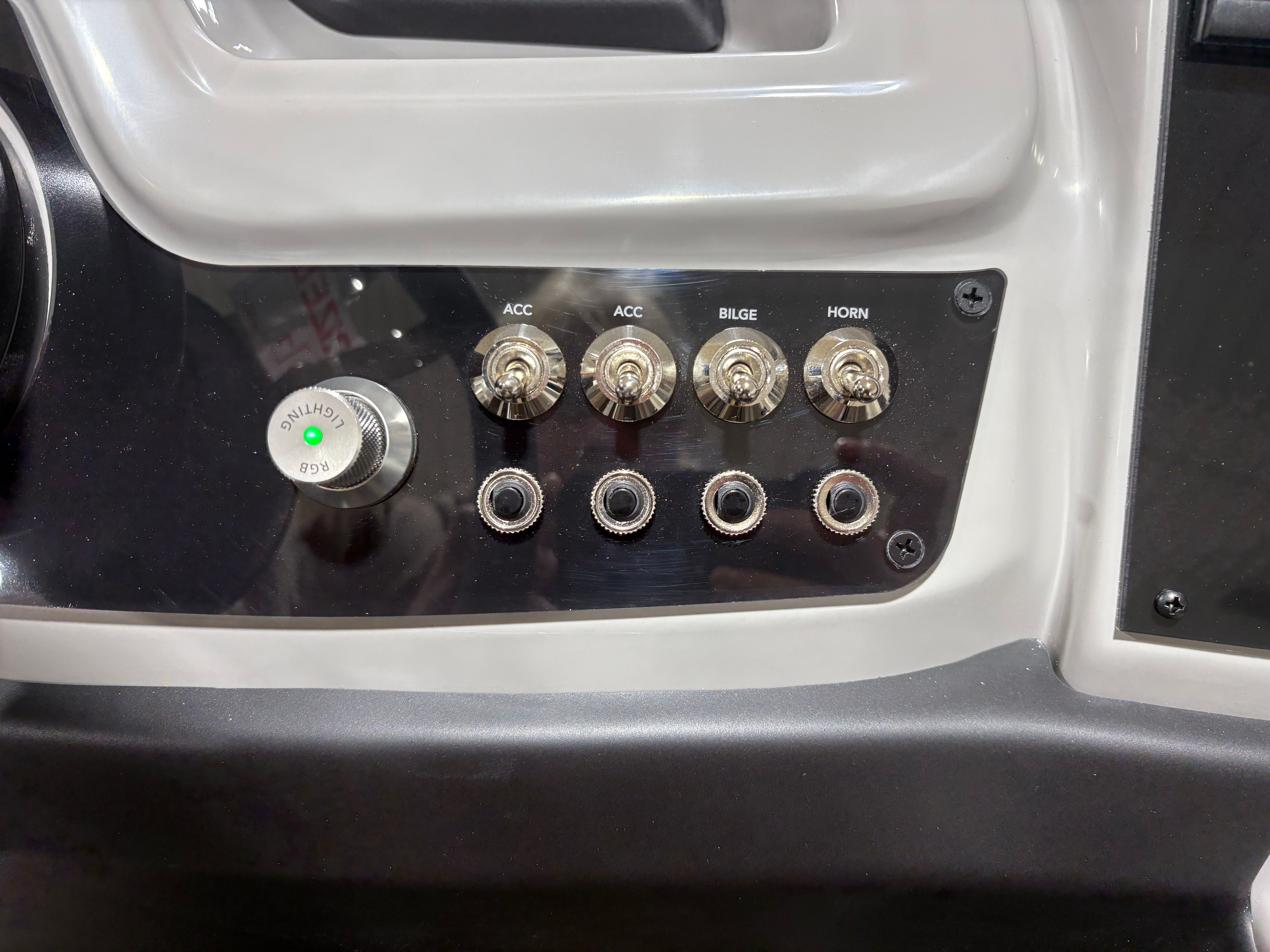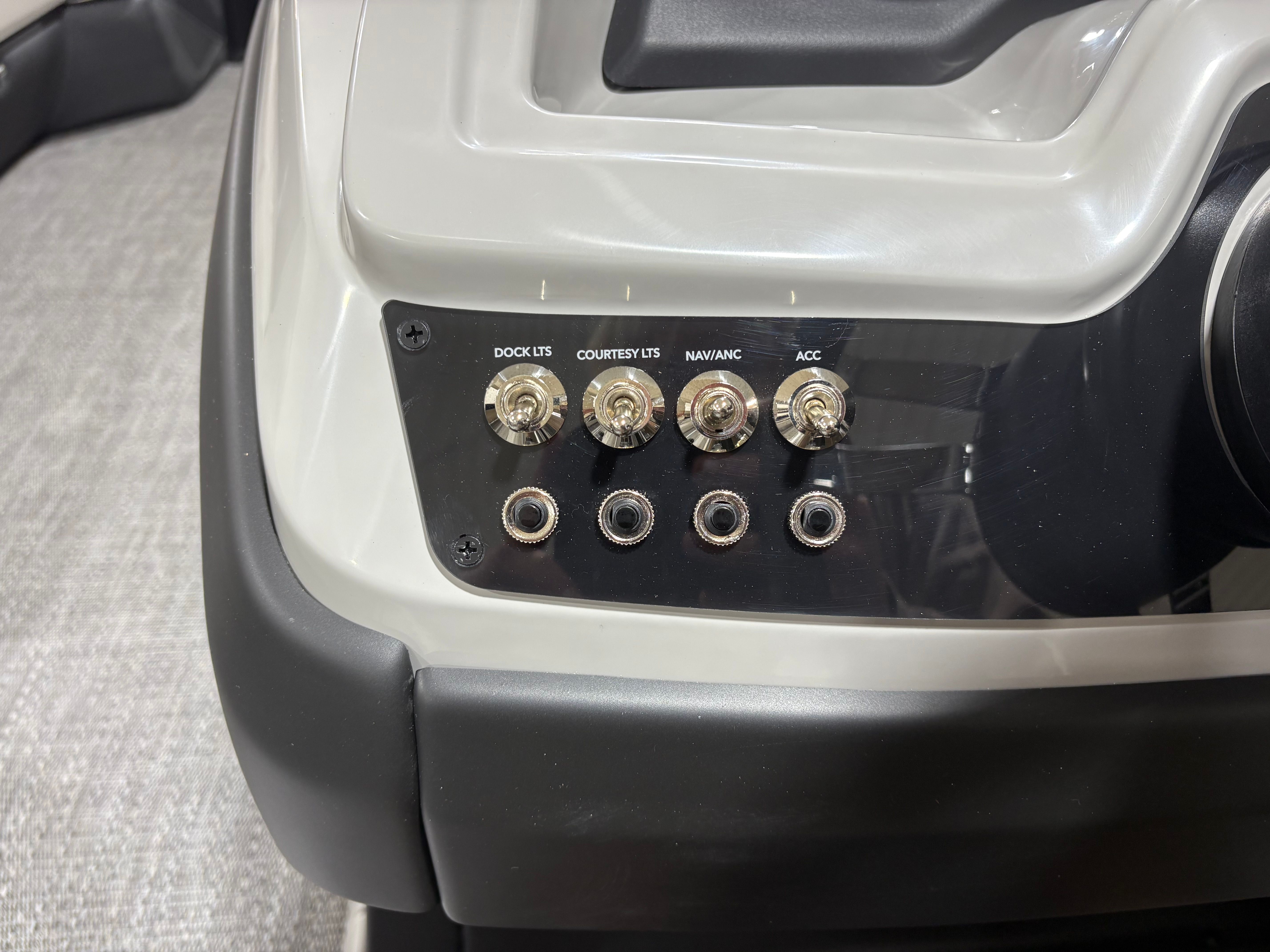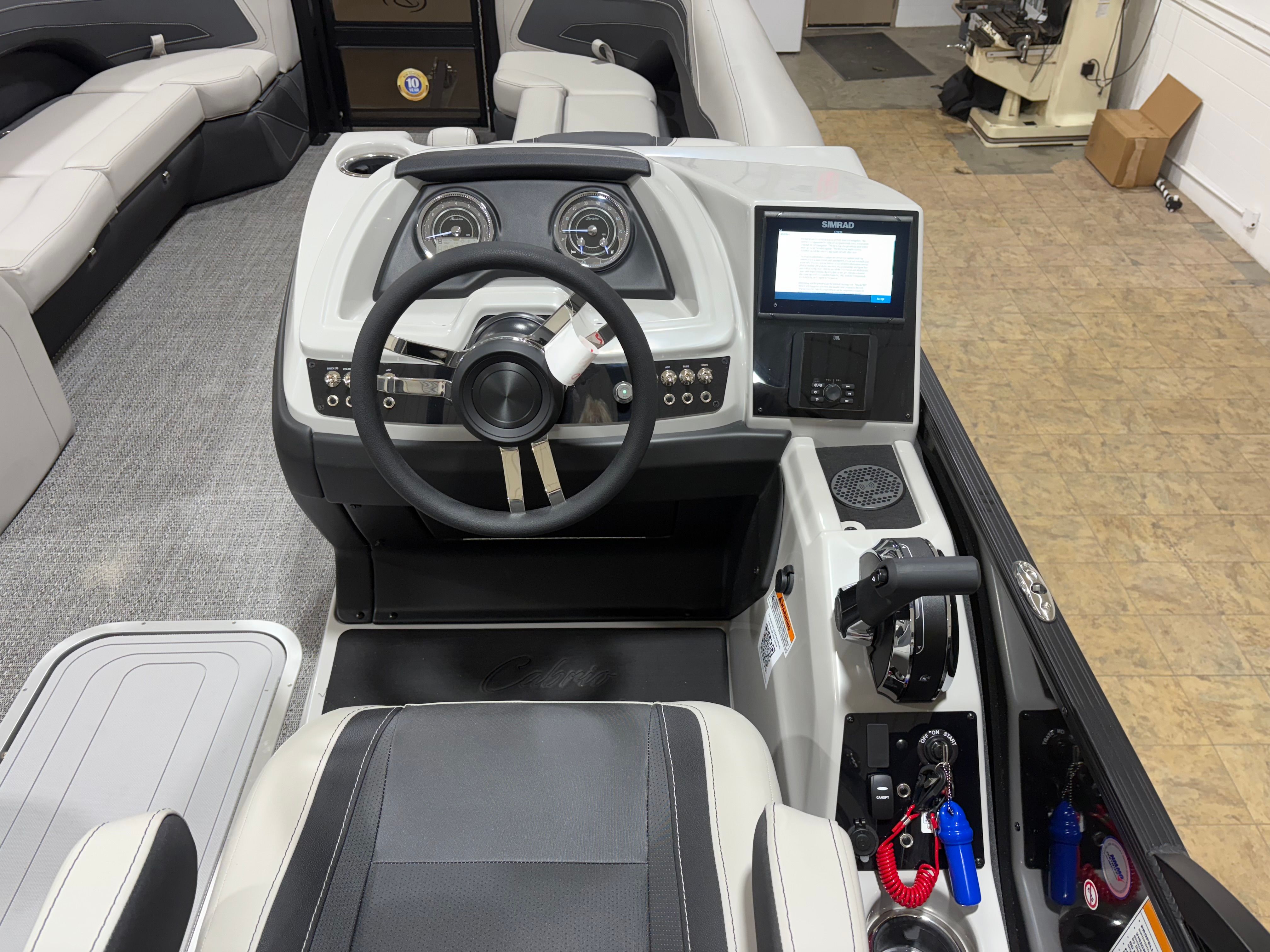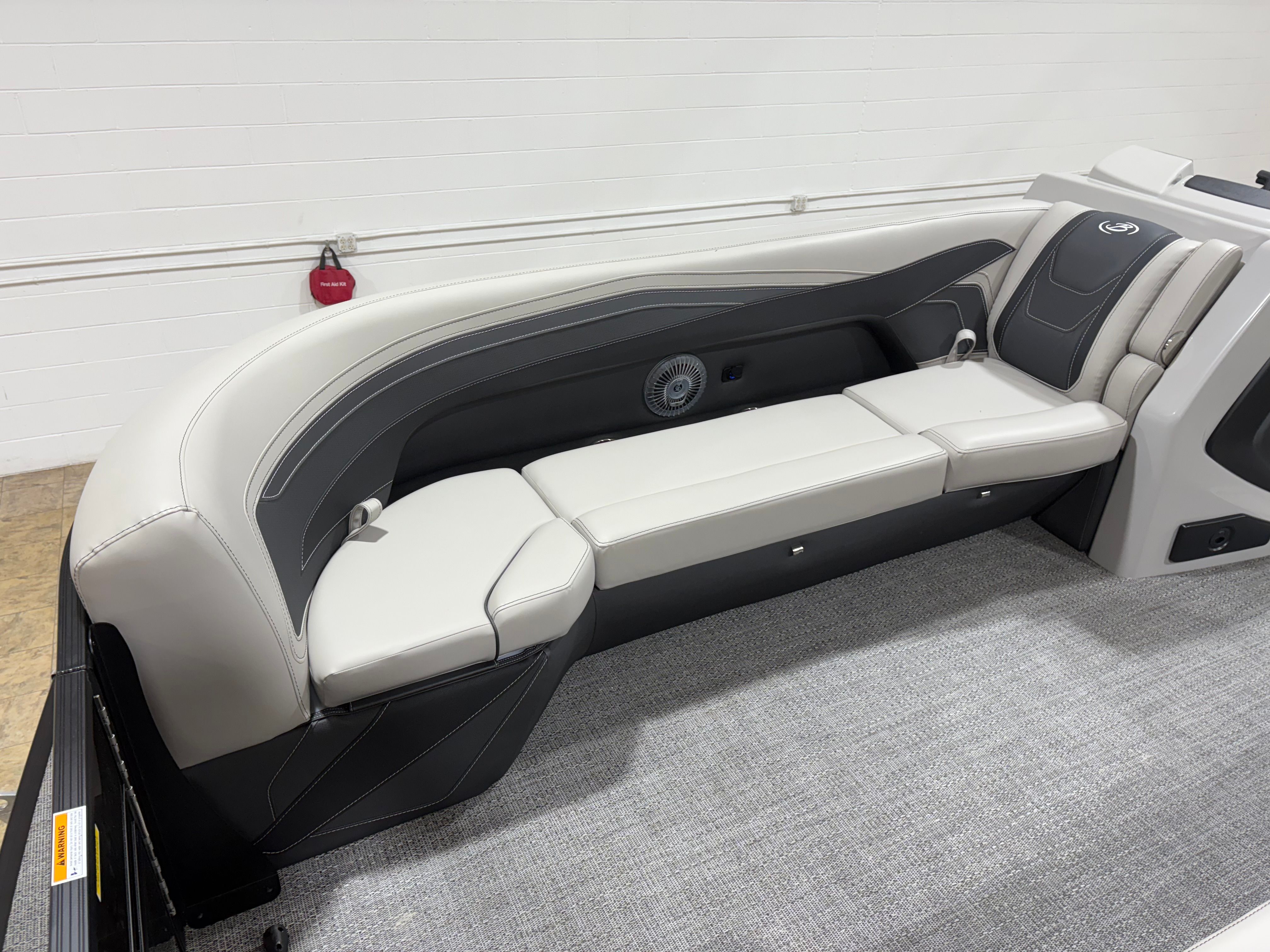 The Barletta Cabrio C24UC is packed with premium features that elevate your boating experience. The Triple Toon Package with midship storage offers superior stability and ample space for gear, ensuring you’re always prepared for a day on the water. The interior RGB lighting package creates a vibrant and customizable ambiance, perfect for evening cruises or lively gatherings. The stainless steel flag pole with an American flag adds a touch of patriotic flair to your pontoon, while the Blackout Package Cabrio enhances the boat’s sleek and modern aesthetic. Every detail, from the Marquesan Gray with Onyx furniture to the Amore Gray flooring, is designed to maximize comfort and style.