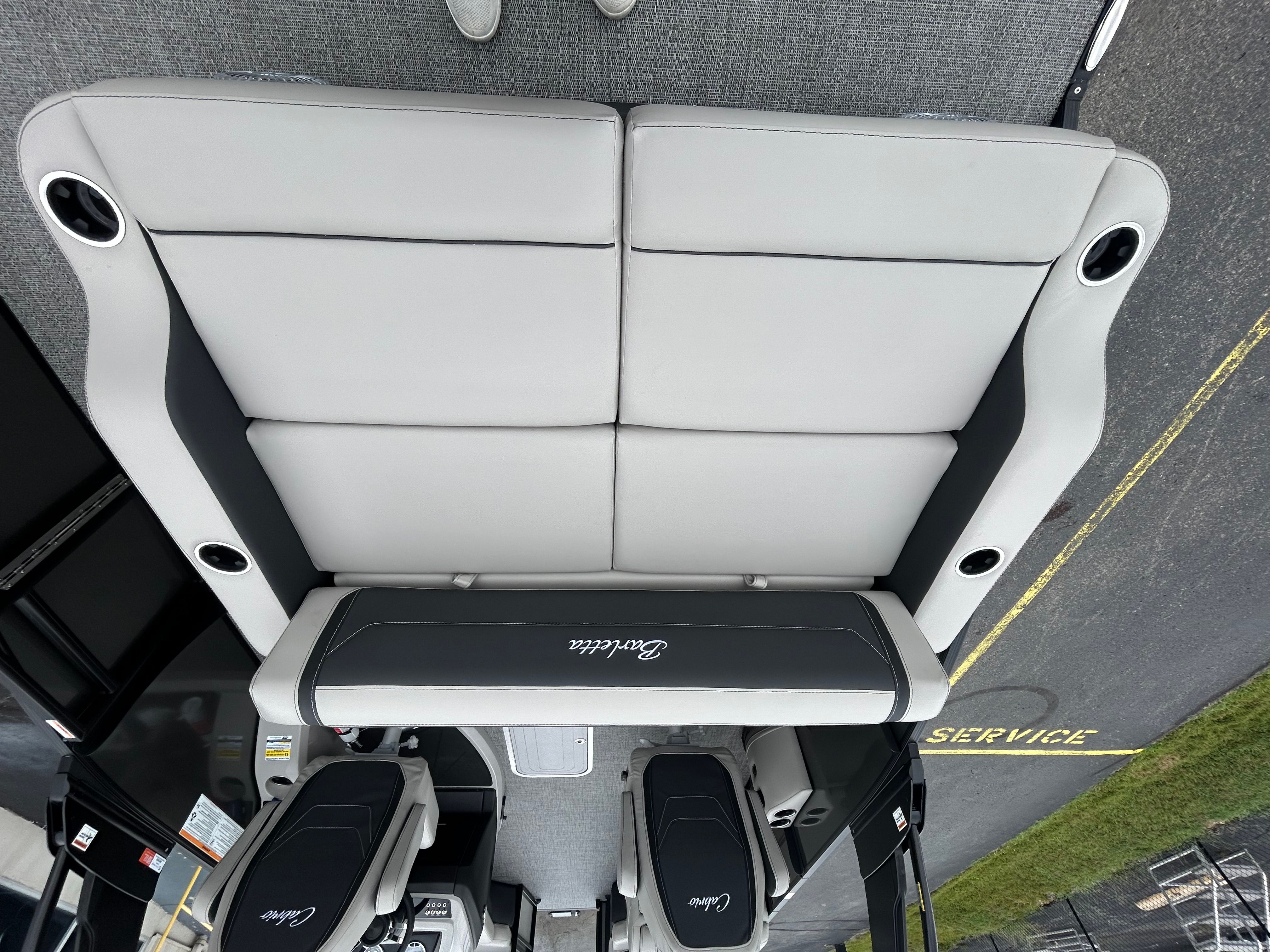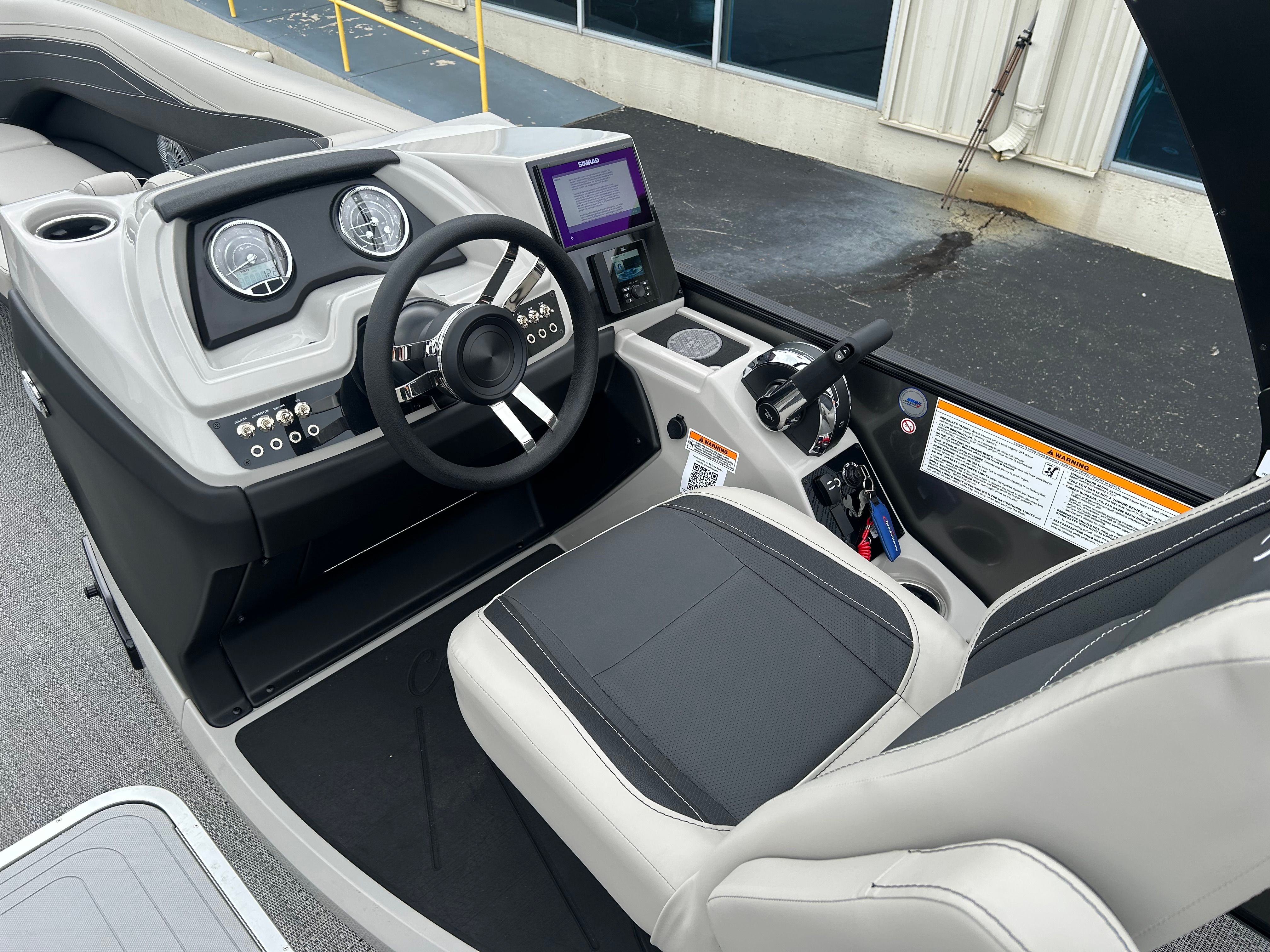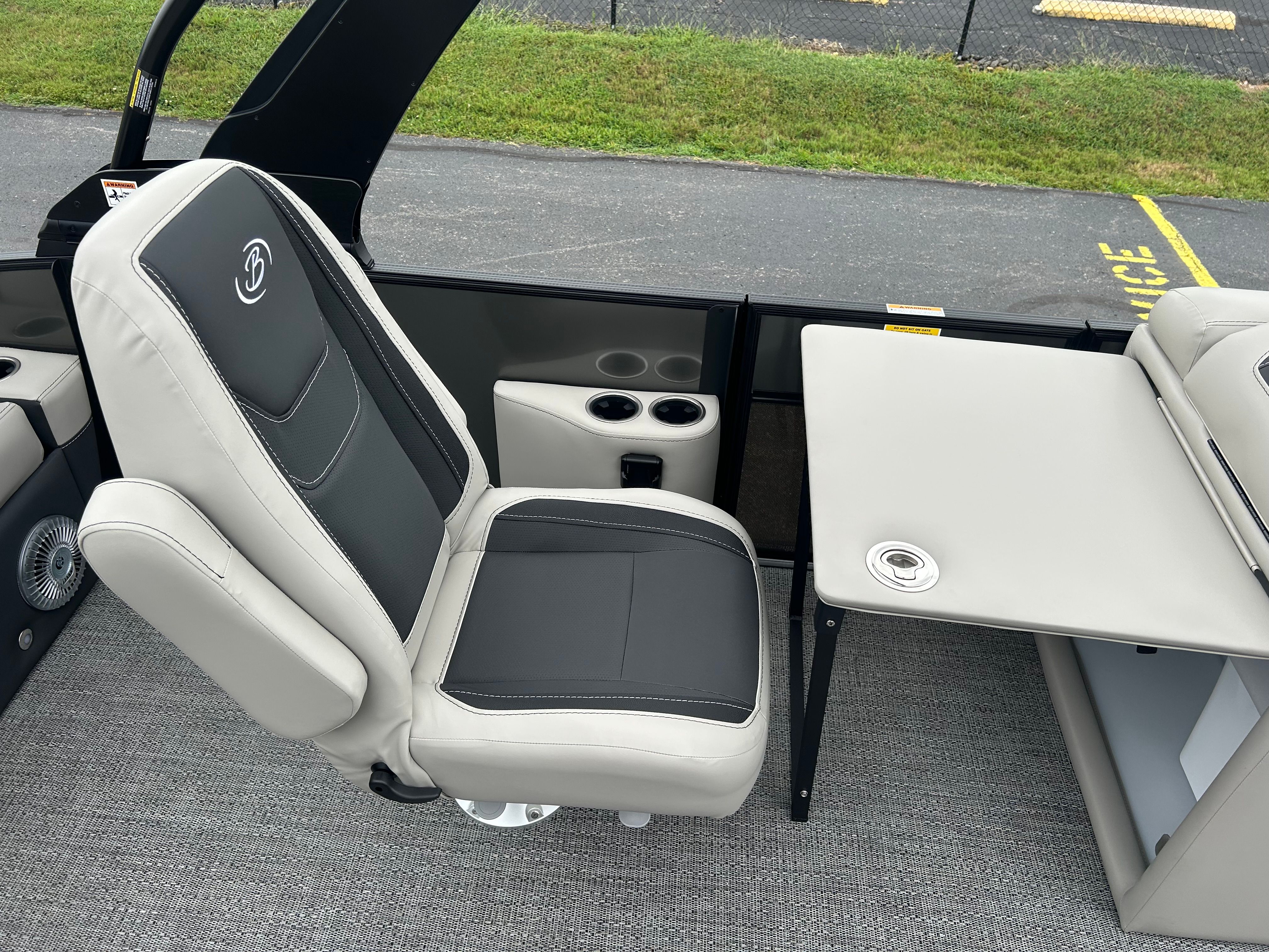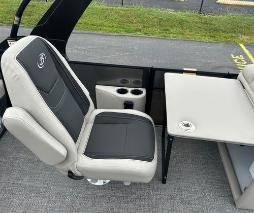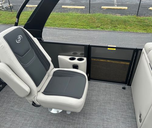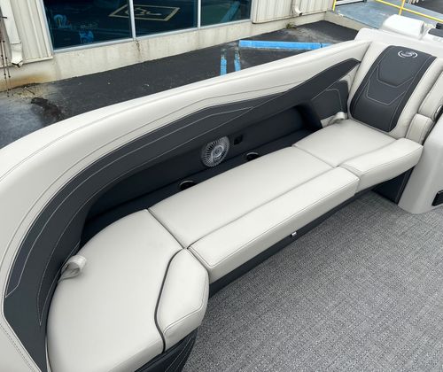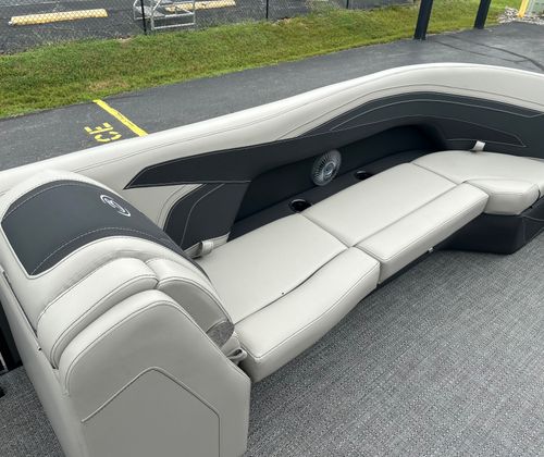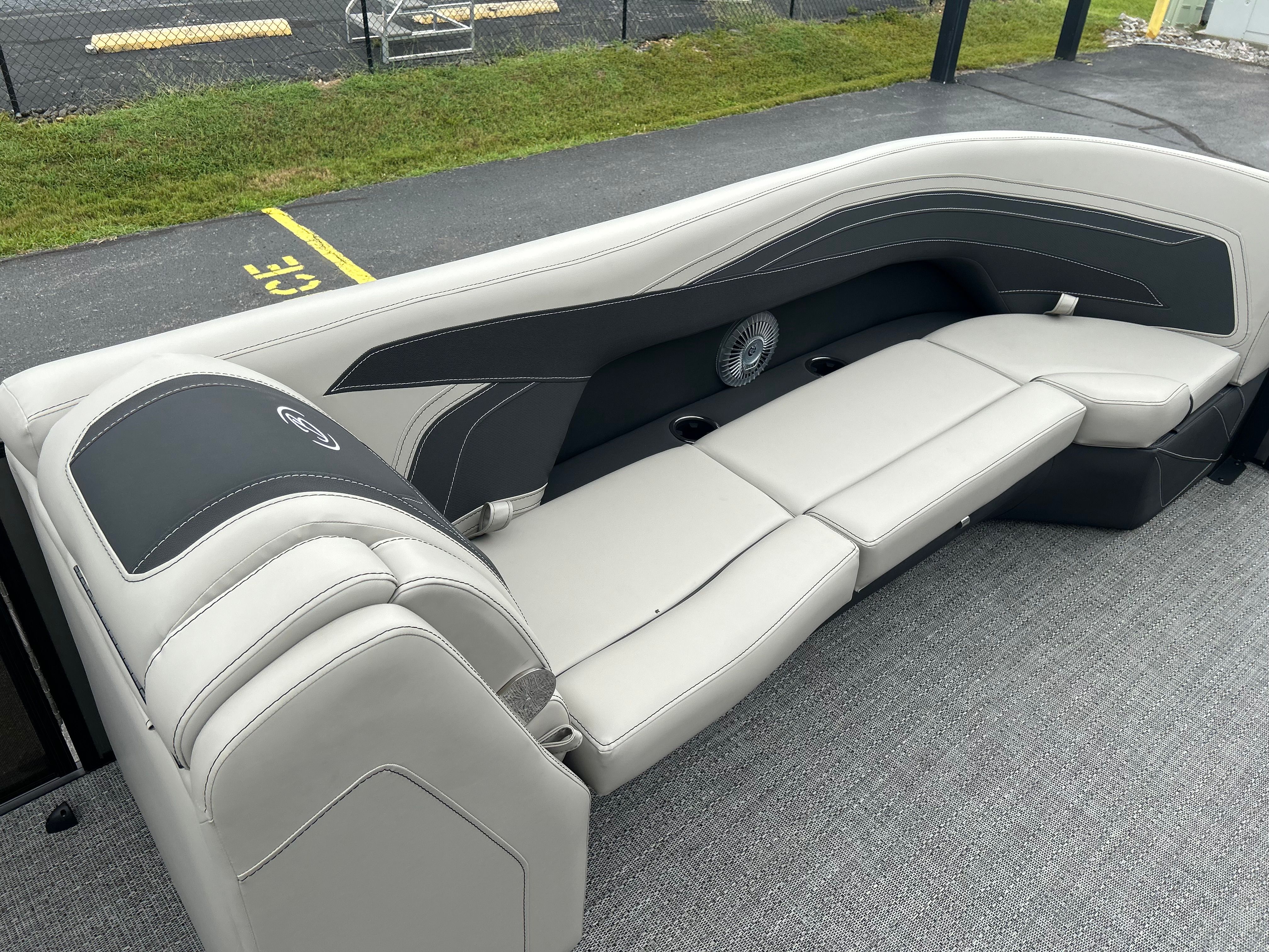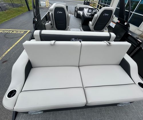 Step aboard and experience the luxury of the Cabrio C24UC’s thoughtfully designed features. The railskin color in Champagne, accented by Gray Moonstone, gives the boat a sophisticated and modern appearance, while the Blackout Package Cabrio adds a sleek, contemporary edge. The furniture, finished in Marquesan Gray/Onyx, offers both comfort and style, creating an inviting atmosphere for relaxation and socializing. The Amore Gray flooring is not only visually appealing but also durable and easy to maintain, ensuring your pontoon stays looking its best season after season.The triple toon package with midship storage provides additional space for gear and essentials, making it easy to keep the deck clutter-free. The sport bimini, installed in place of the standard bimini, offers enhanced shade and protection from the sun, allowing you to enjoy longer days on the water in comfort. Every detail of the Cabrio C24UC is designed to maximize enjoyment and convenience, making it a top choice for those seeking a Barletta boat for sale that goes above and beyond.