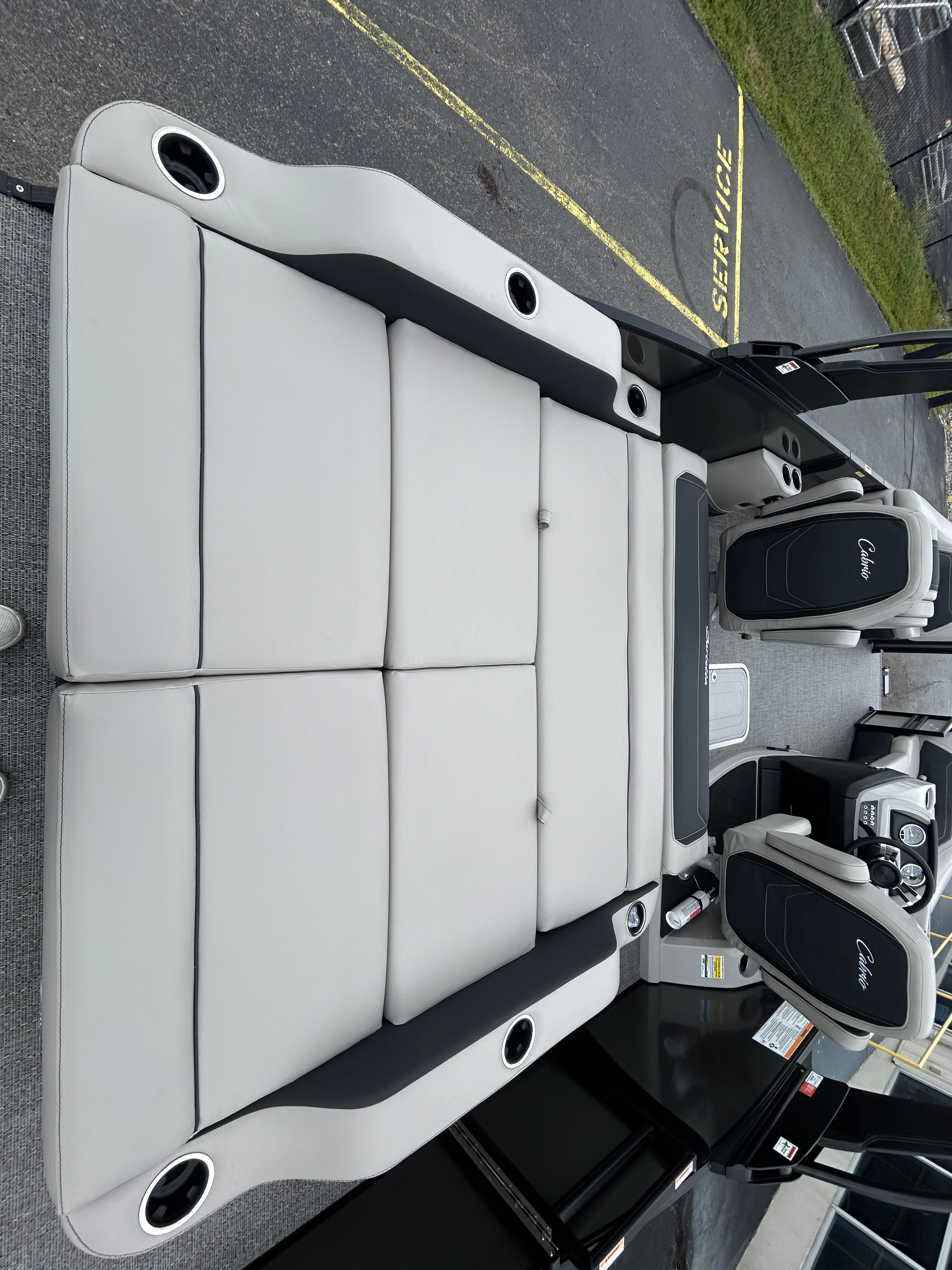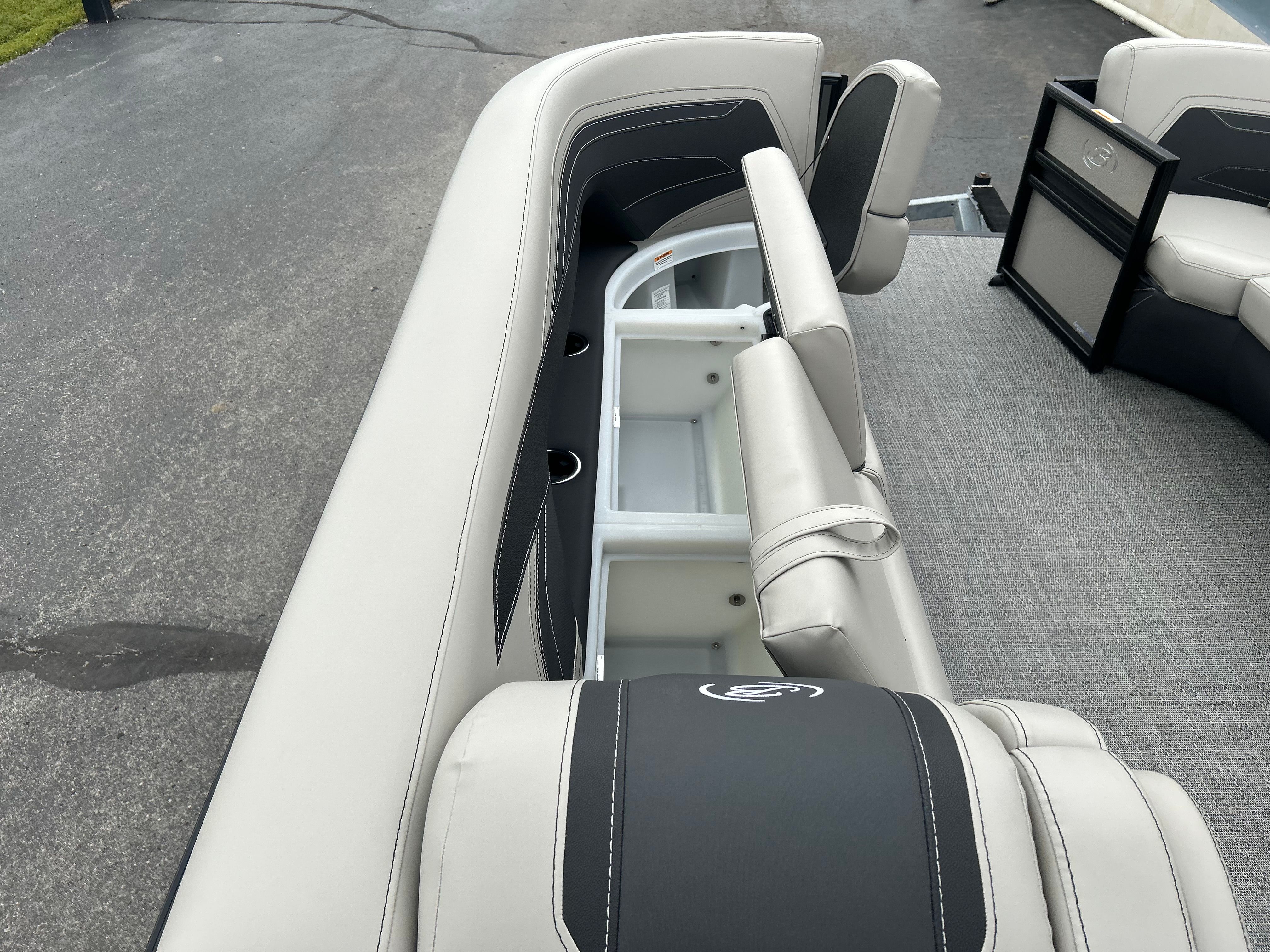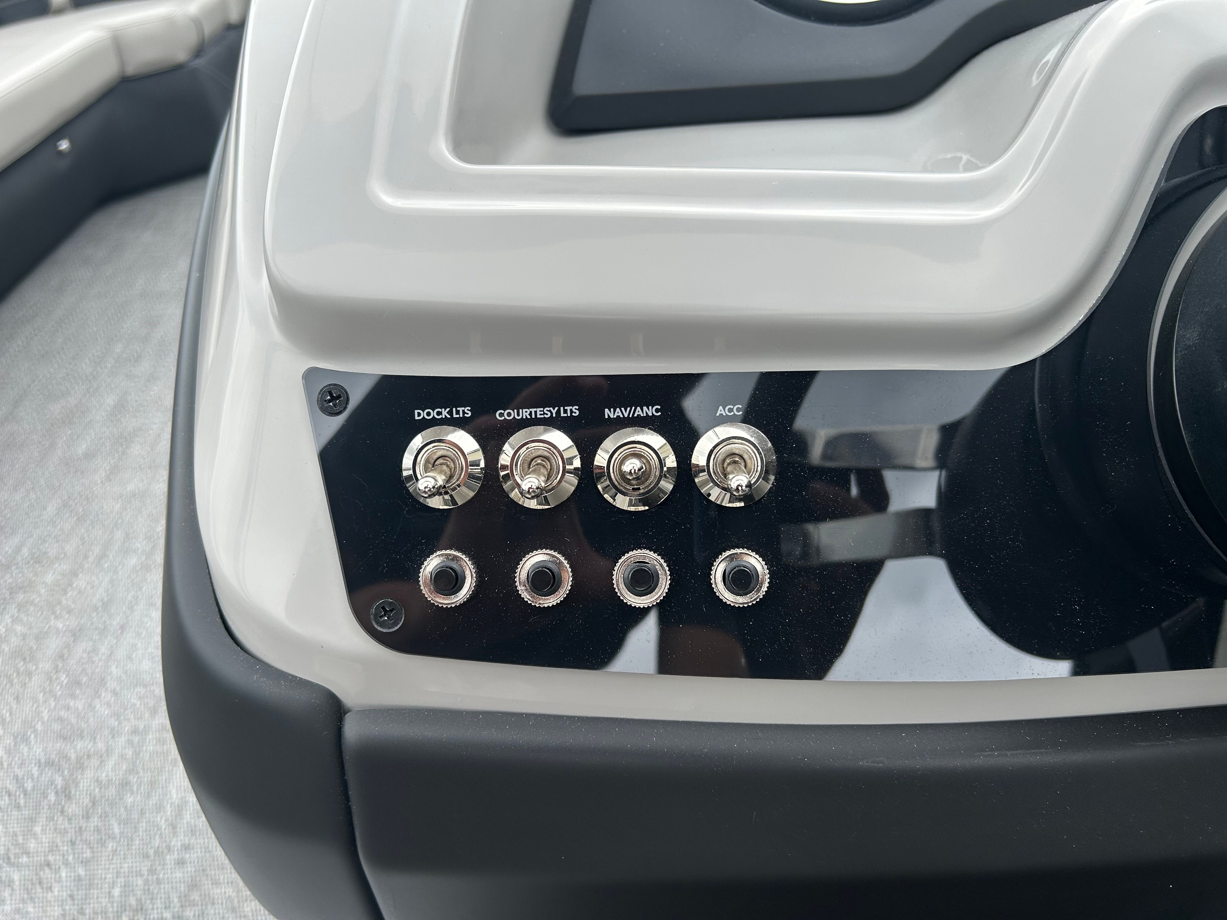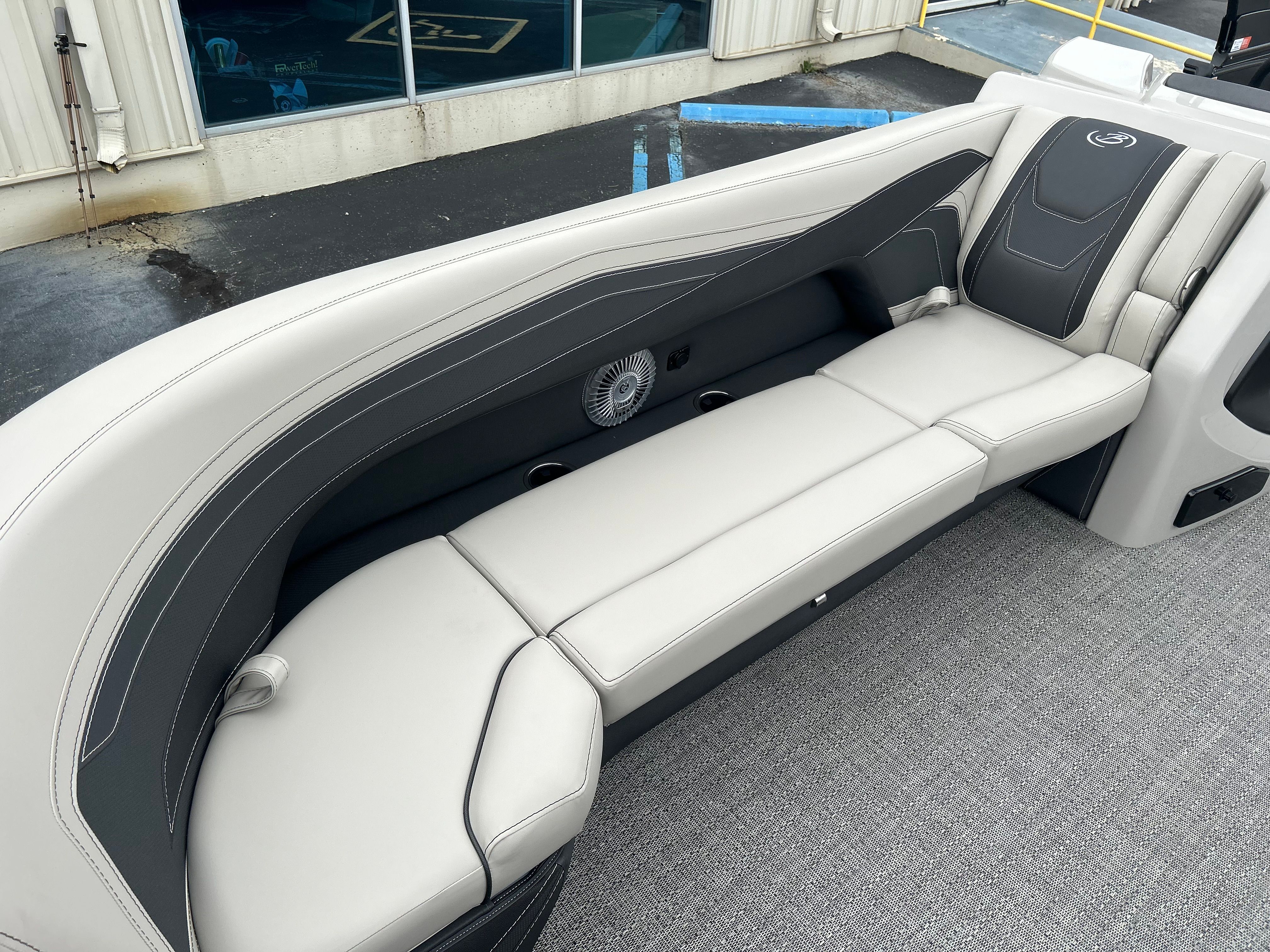 Step aboard and experience the luxury of the Cabrio C24UC’s thoughtfully designed features. The railskin color in Champagne, accented by Gray Moonstone, gives the boat a sophisticated and modern appearance, while the Blackout Package Cabrio adds a sleek, contemporary edge. The furniture, finished in Marquesan Gray/Onyx, offers both comfort and style, creating an inviting atmosphere for relaxation and socializing. The Amore Gray flooring is not only visually appealing but also durable and easy to maintain, ensuring your pontoon stays looking its best season after season.The triple toon package with midship storage provides additional space for gear and essentials, making it easy to keep the deck clutter-free. The sport bimini, installed in place of the standard bimini, offers enhanced shade and protection from the sun, allowing you to enjoy longer days on the water in comfort. Every detail of the Cabrio C24UC is designed to maximize enjoyment and convenience, making it a top choice for those seeking a Barletta boat for sale that goes above and beyond.