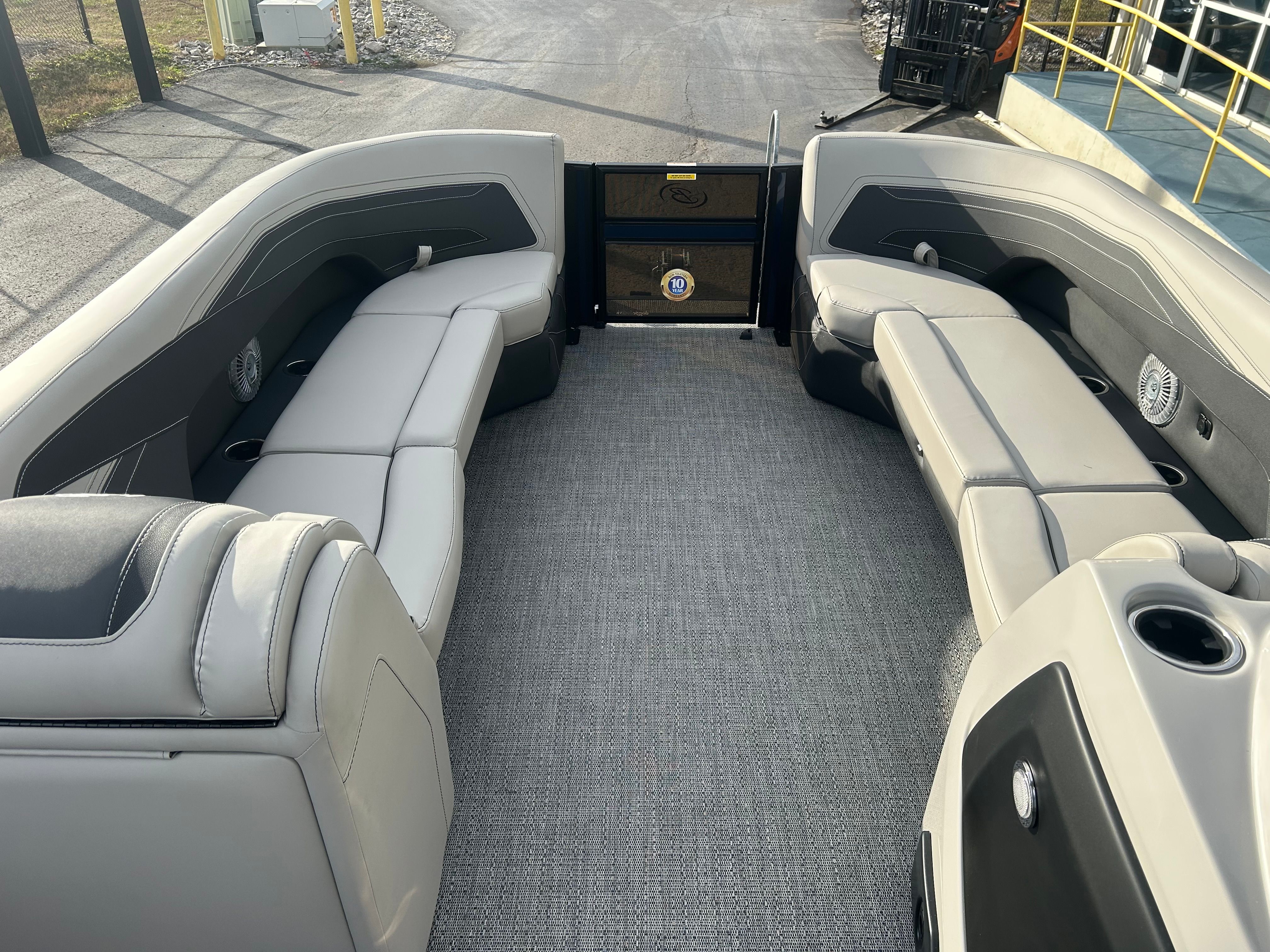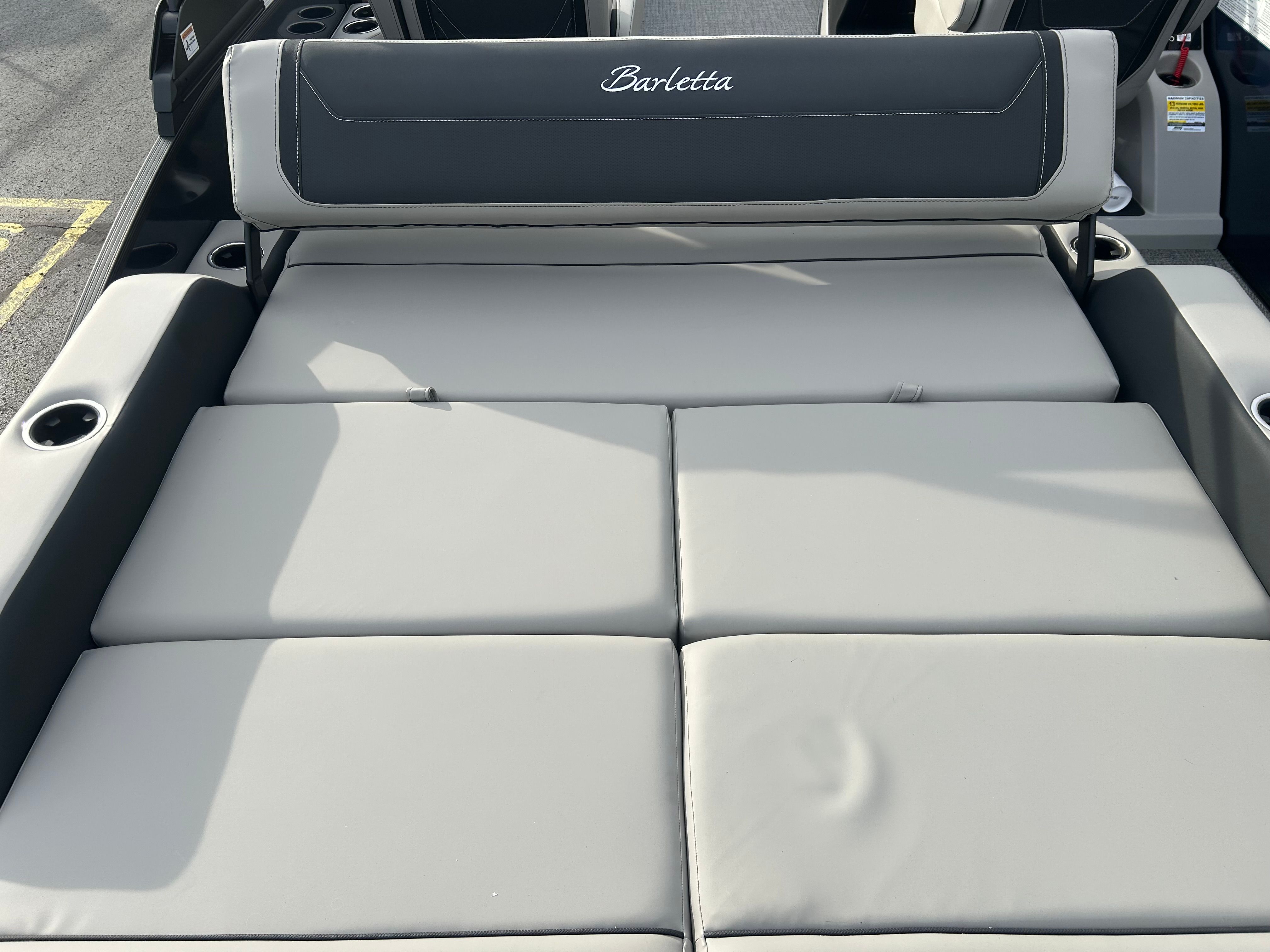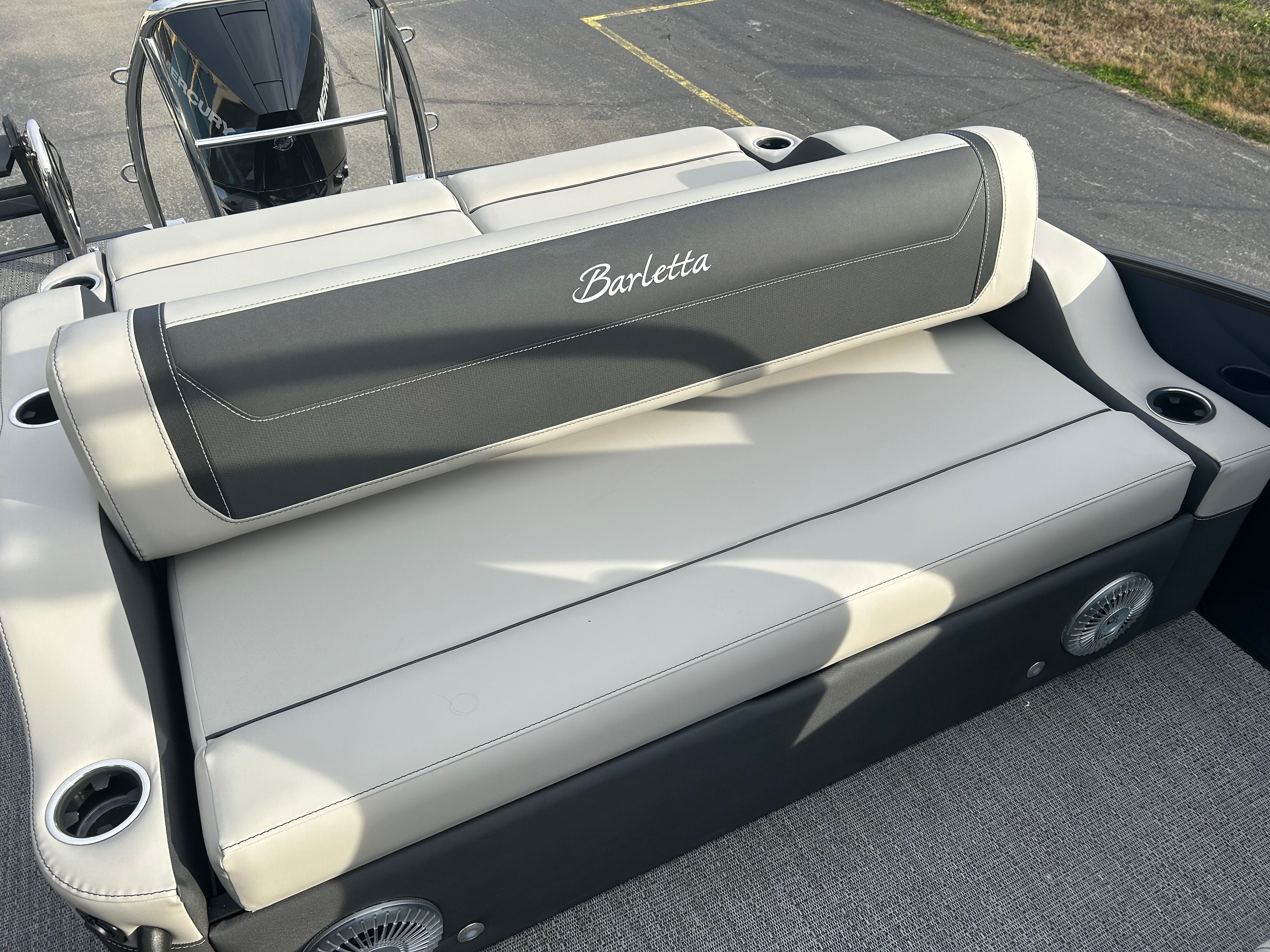 The Barletta Cabrio C24UC is as practical as it is luxurious. The midship storage compartment keeps your gear organized and out of the way, while the triple toon design enhances stability for safe and confident navigation. Docking is a breeze thanks to the responsive handling and power assist steering, making it easy for boaters of all experience levels to maneuver in tight spaces. The efficient engine and thoughtfully designed hull contribute to excellent fuel economy, so you can spend more time on the water and less time refueling.The onboard battery charger with dual batteries ensures your electronics and accessories are always ready for use, whether you are listening to music, using navigation equipment, or keeping your devices charged. The durable flooring and high-quality upholstery are built to withstand the rigors of active boating, ensuring your investment looks great season after season.