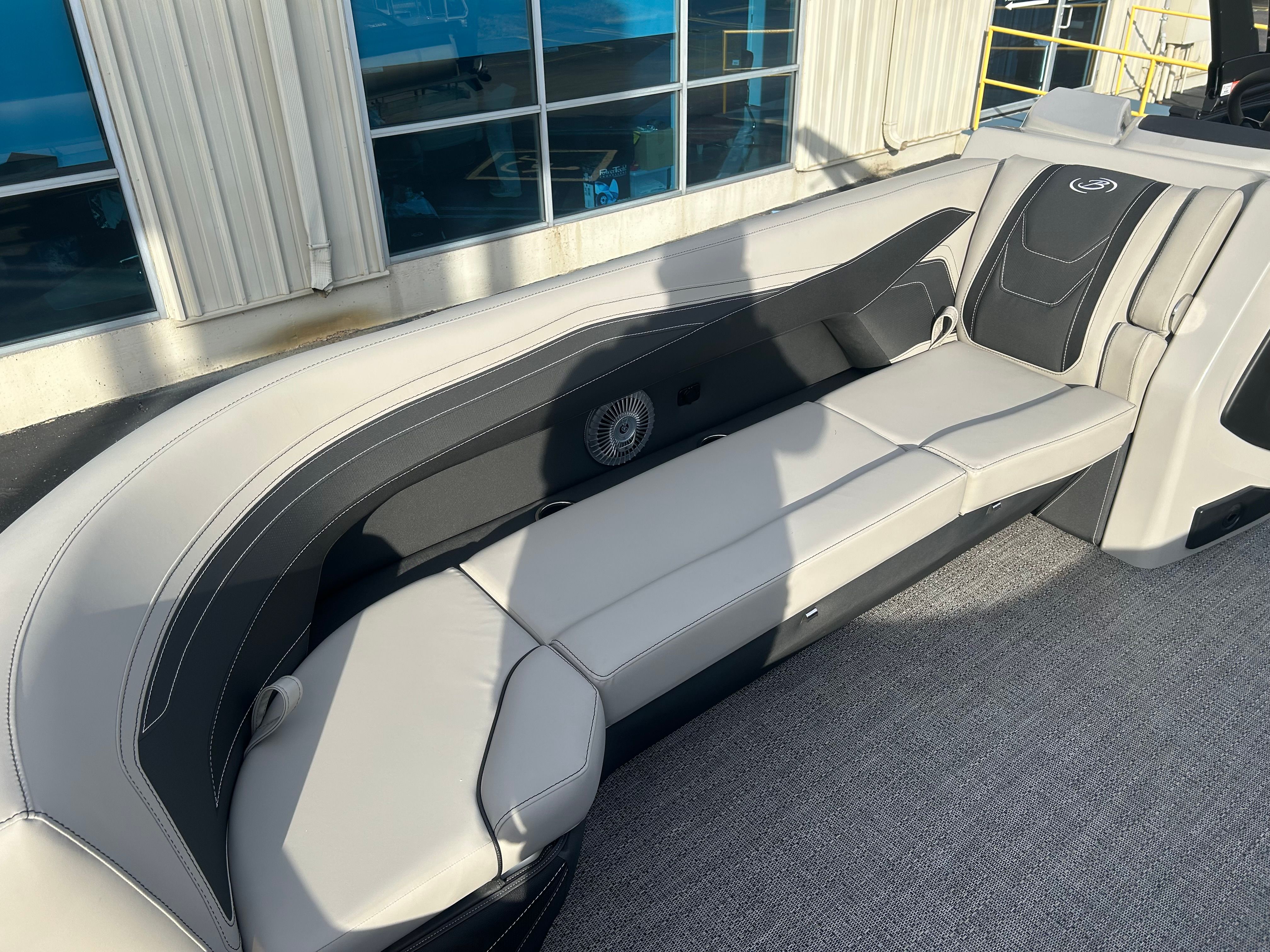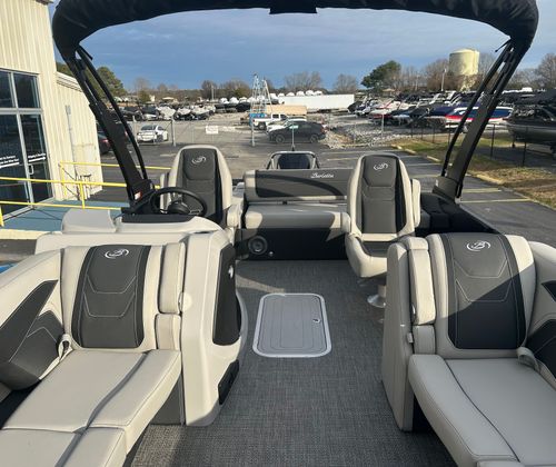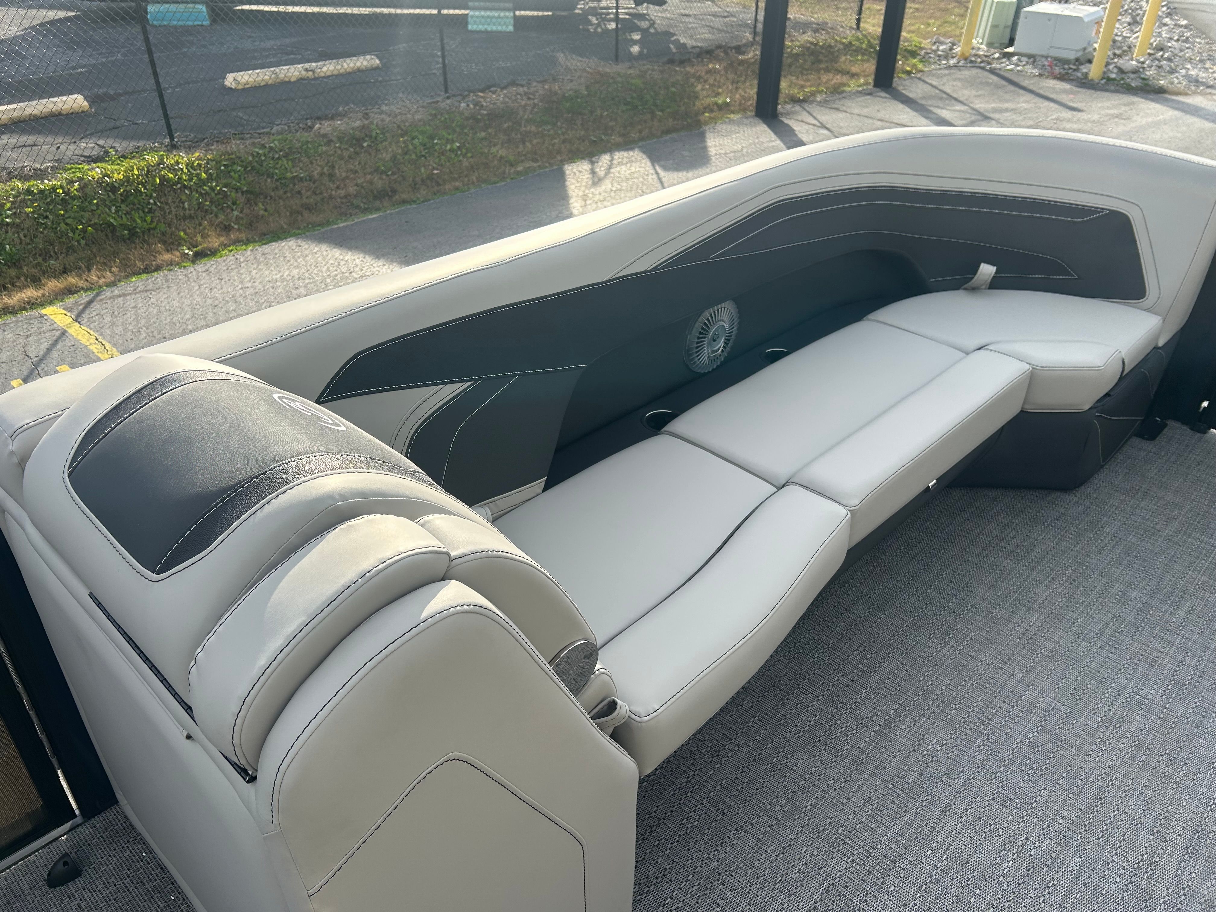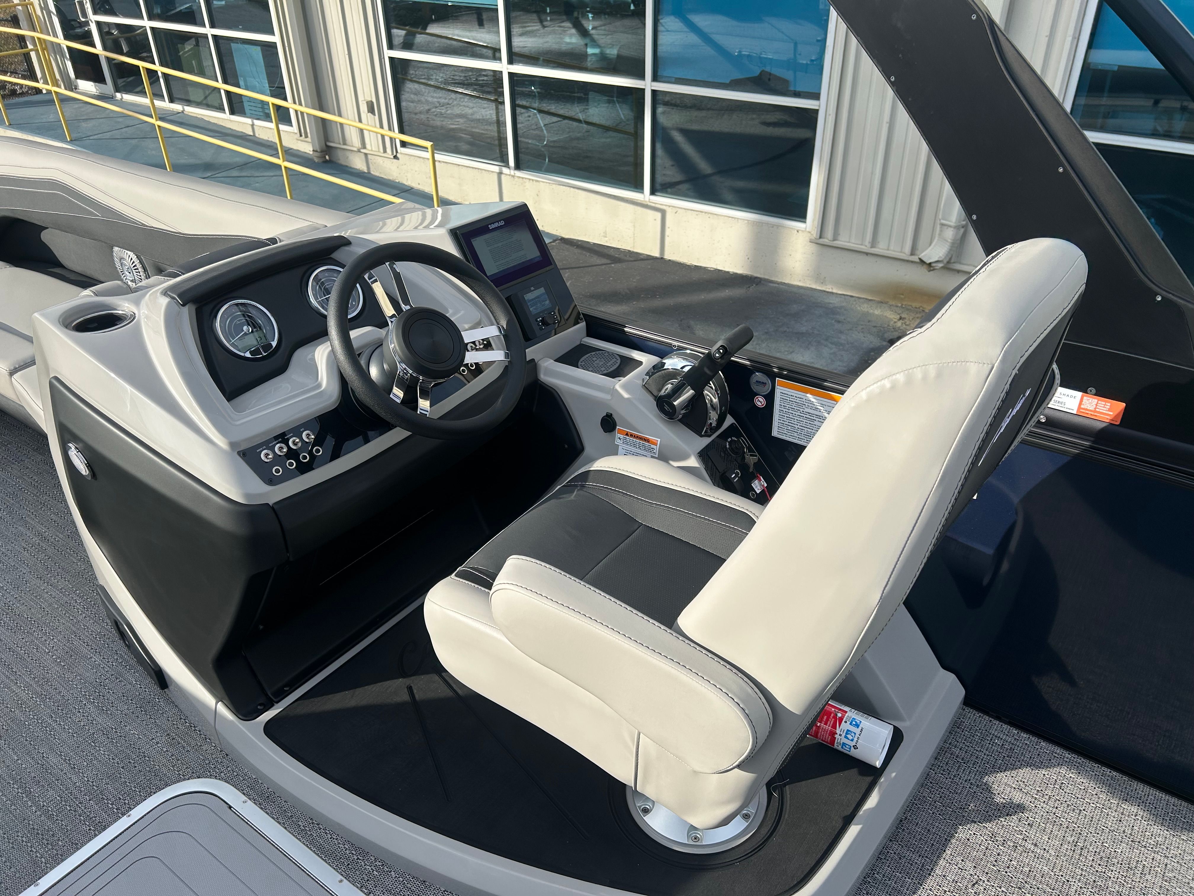 The Barletta Cabrio C24UC is as practical as it is luxurious. The midship storage compartment keeps your gear organized and out of the way, while the triple toon design enhances stability for safe and confident navigation. Docking is a breeze thanks to the responsive handling and power assist steering, making it easy for boaters of all experience levels to maneuver in tight spaces. The efficient engine and thoughtfully designed hull contribute to excellent fuel economy, so you can spend more time on the water and less time refueling.The onboard battery charger with dual batteries ensures your electronics and accessories are always ready for use, whether you are listening to music, using navigation equipment, or keeping your devices charged. The durable flooring and high-quality upholstery are built to withstand the rigors of active boating, ensuring your investment looks great season after season.