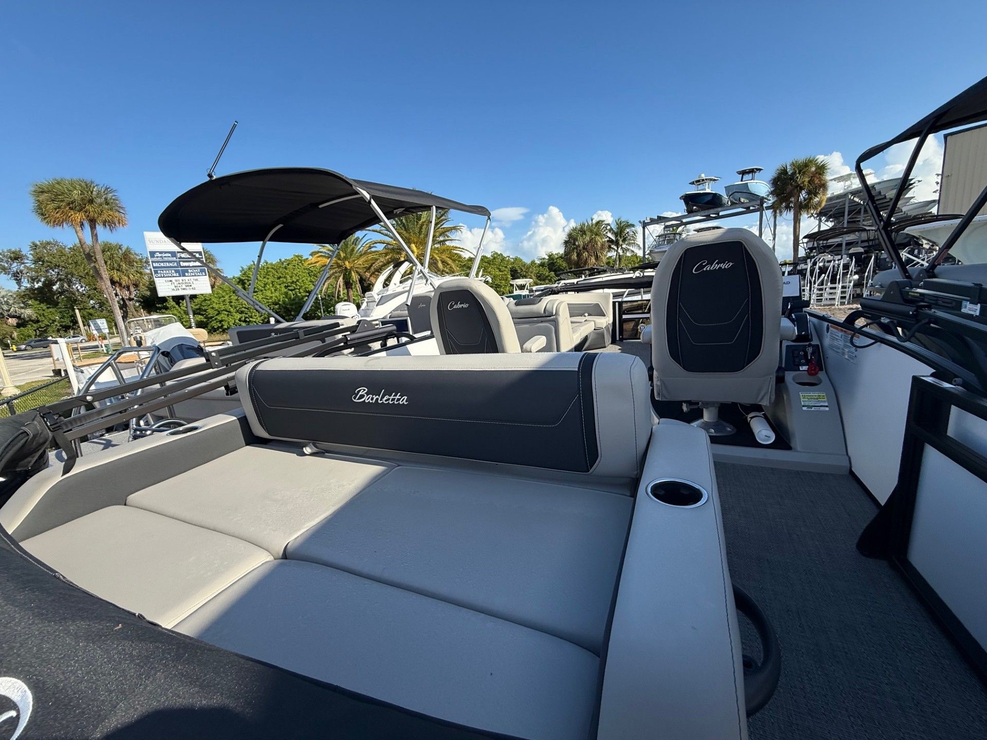 This Barletta boat for sale is loaded with features designed to maximize your enjoyment and convenience on the water. The Triple Toon Package with midship storage not only boosts performance but also provides ample space for stowing gear, water toys, and essentials. The deck mount fender basket adds another layer of practicality, keeping your fenders organized and within easy reach.For those who love to entertain, the Cabrio C24UC comes equipped with an upgraded entertainment system, including a subwoofer and amplifier, ensuring your favorite tunes sound crisp and powerful. The Marquesan Gray/Onyx furniture offers plush, stylish seating for you and your guests, creating a welcoming atmosphere for relaxation and socializing.Navigation and control are a breeze thanks to the Simrad 7" G07 XSR chartplotter/multifunction display at the helm, providing intuitive access to vital information and navigation tools. Exterior lighting, including white underdeck and underwater lights, not only enhances the boat’s visual appeal but also improves safety and ambiance during evening cruises. The stainless steel flag pole with an American flag adds a patriotic touch, while the Blackout Package Cabrio railskin delivers a bold, modern look.