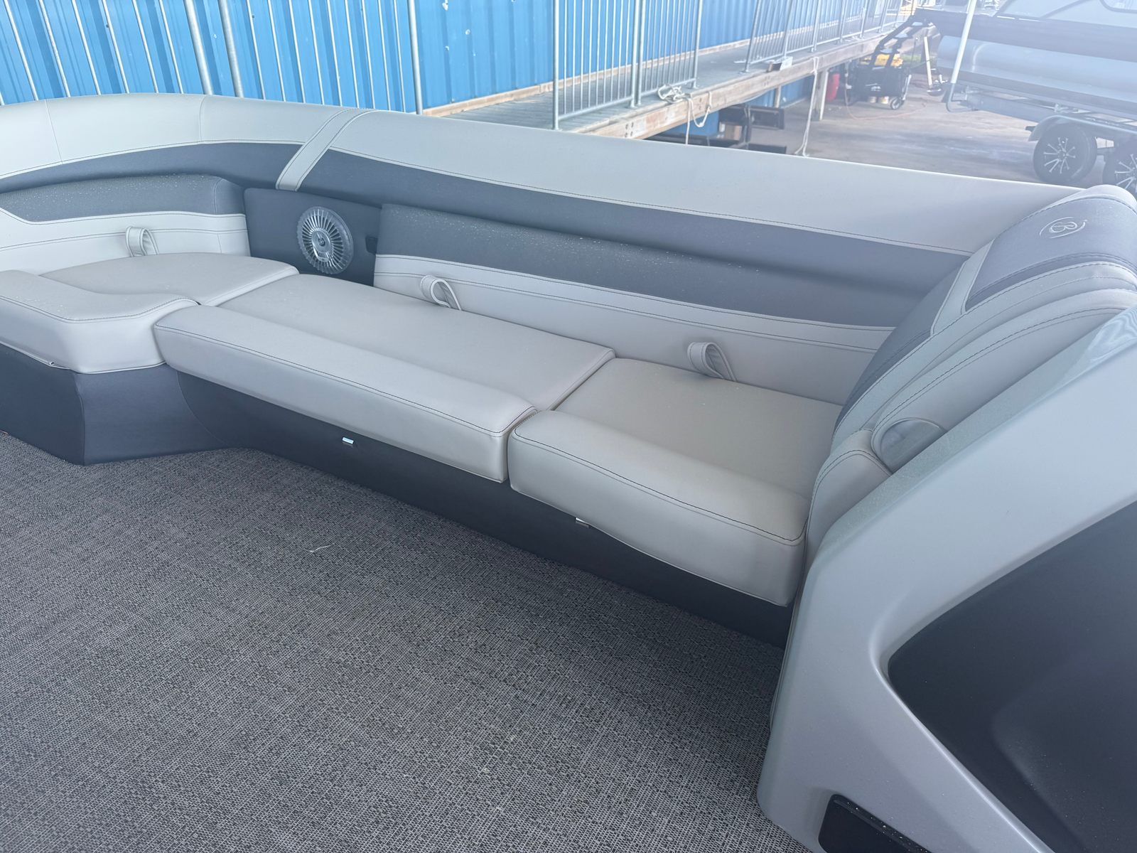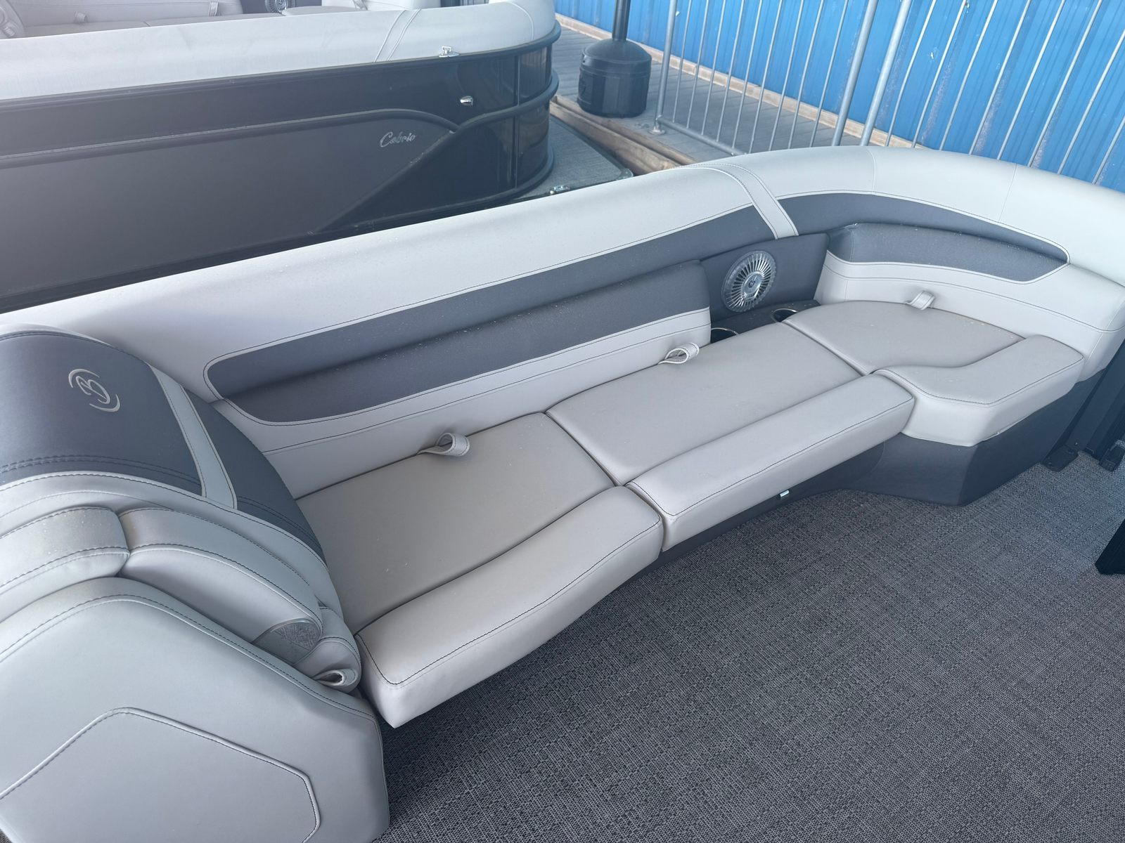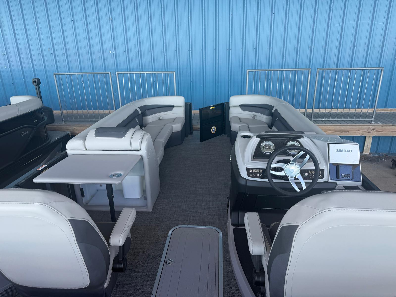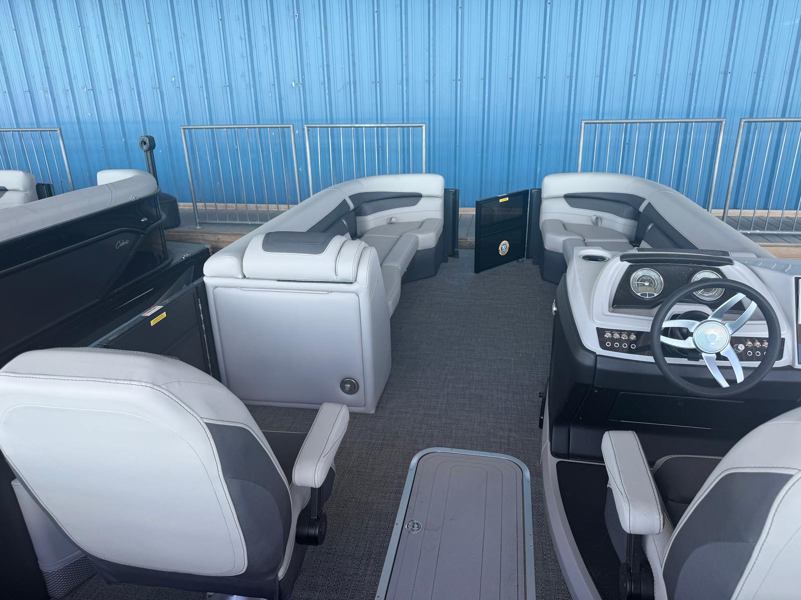 Powering the Cabrio C24UC is a robust 250-horsepower engine, providing the perfect balance of speed, efficiency, and smooth handling. The Drop Ship Engine is paired with a stainless steel prop for enhanced durability and performance, ensuring you have the power you need for water sports, cruising, or simply exploring your favorite waterways. The Triple Toon Package with midship storage adds stability and buoyancy, delivering a smooth and confident ride even when the boat is fully loaded with family and friends. Hydraulic and power assist steering, along with digital gauges, make navigation effortless and precise, allowing you to focus on enjoying your time on the water.