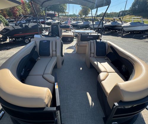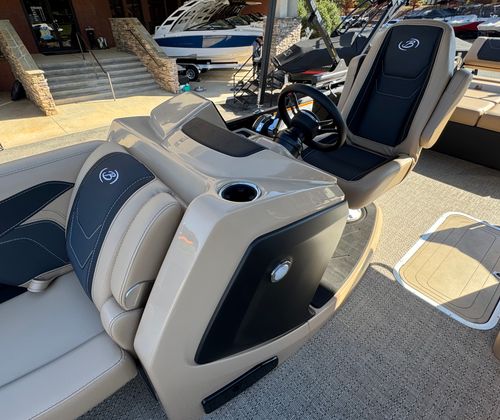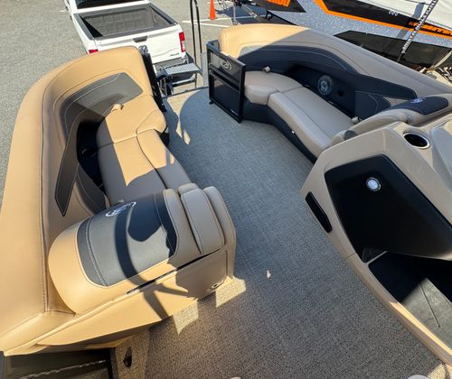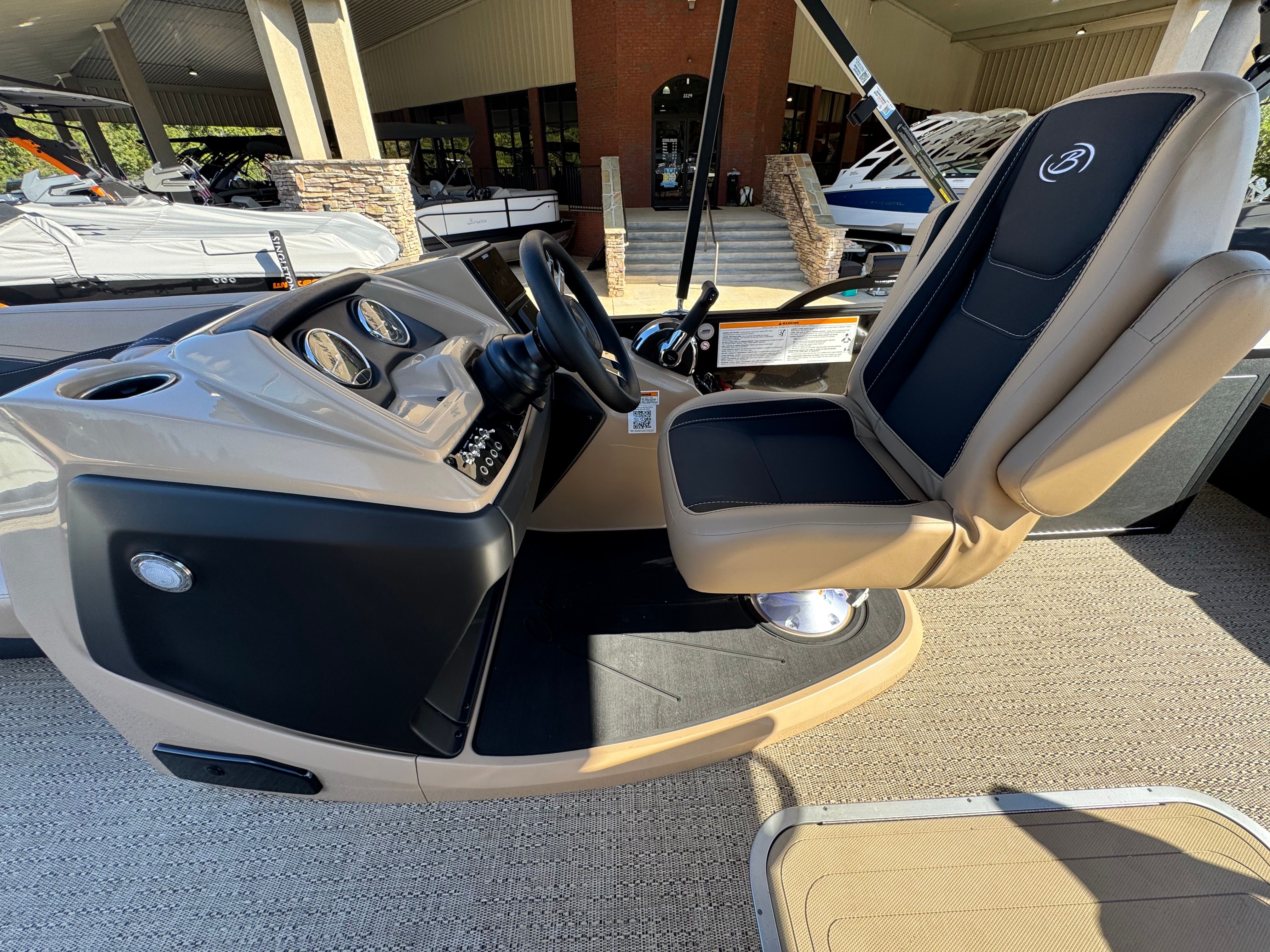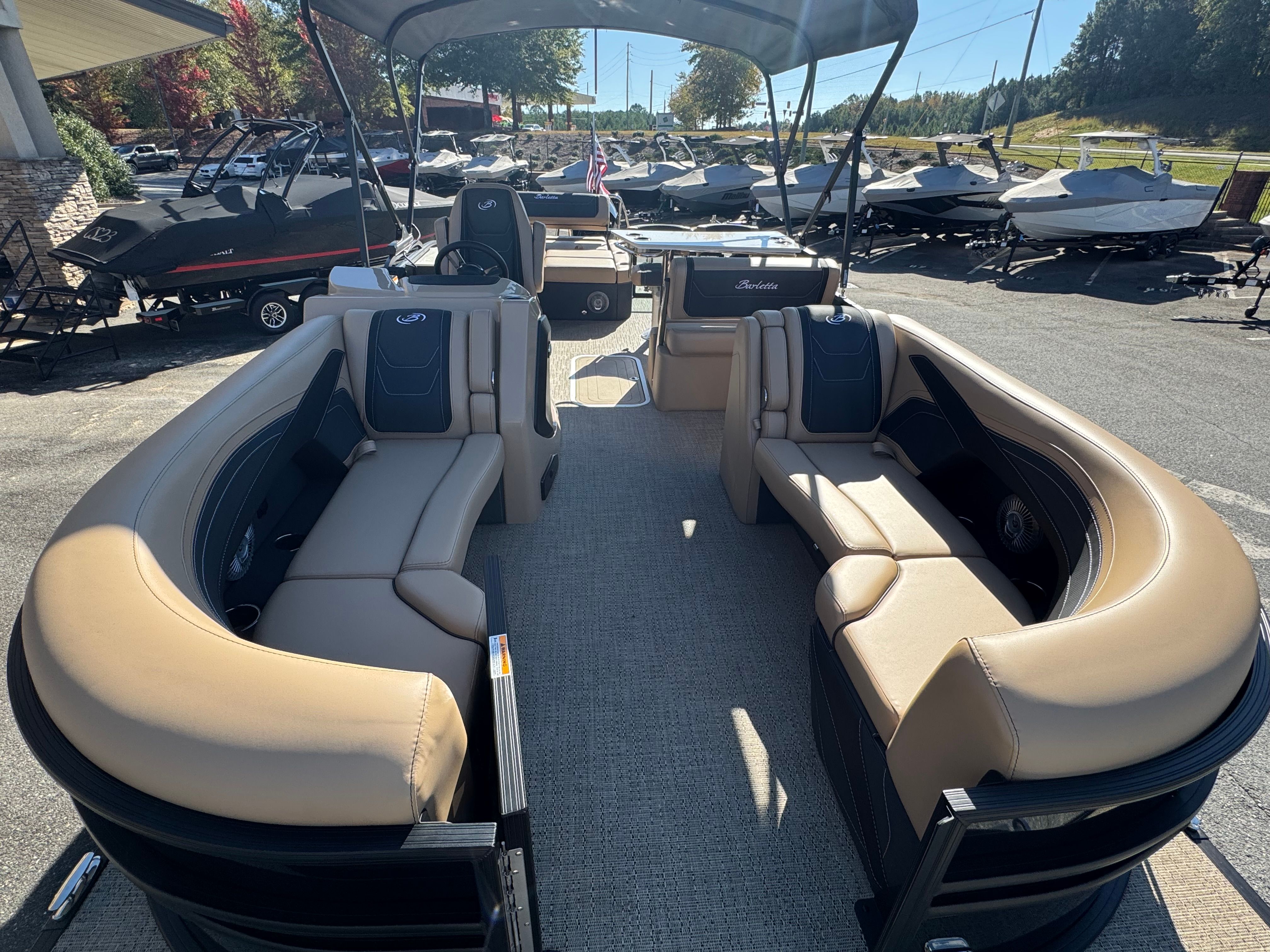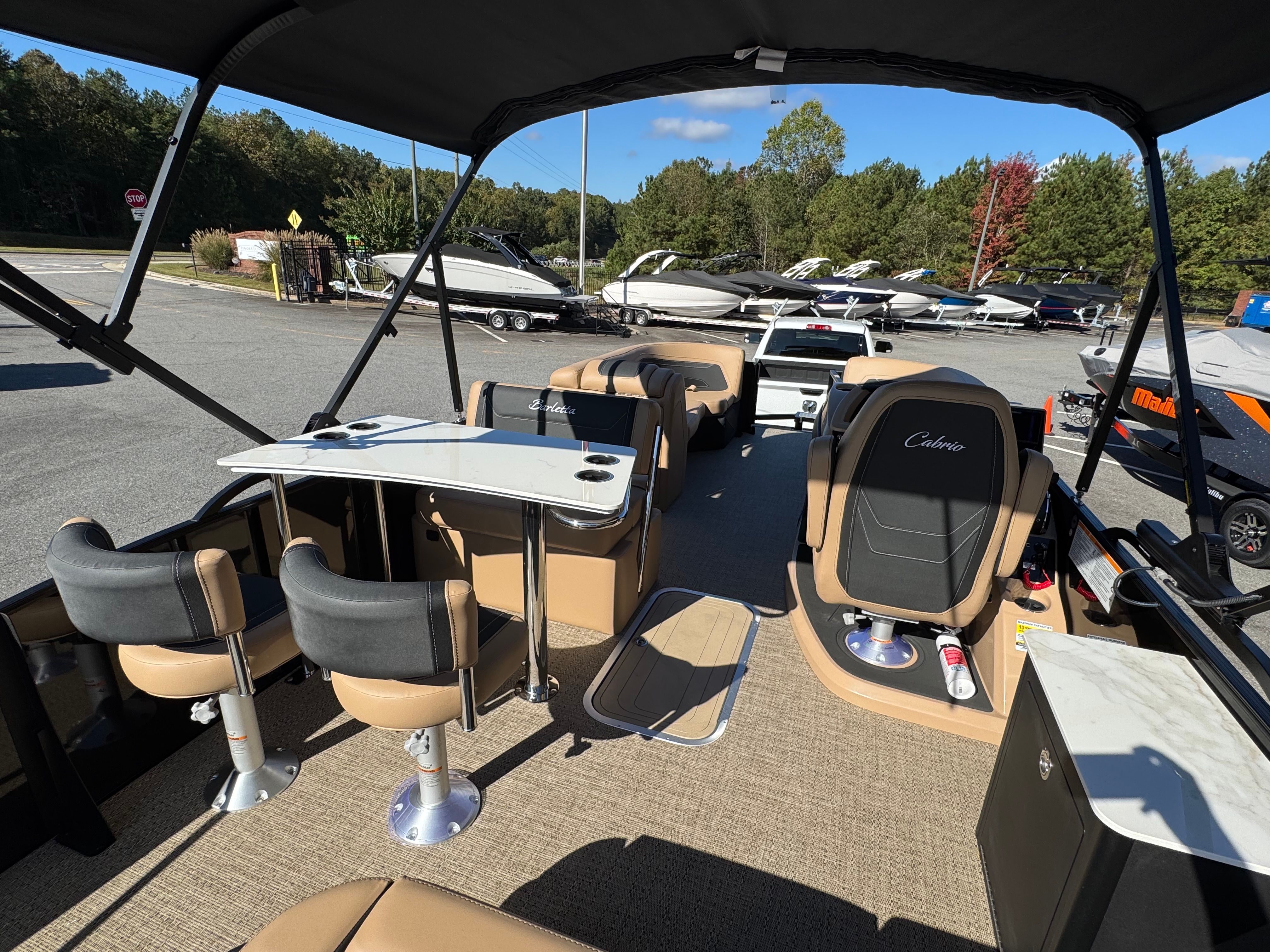 The 2026 Barletta Cabrio C24UE stretches an impressive 25 feet in length, offering ample space for friends and family to relax and unwind. This new pontoon boat boasts a contemporary design, blending sleek lines with premium finishes that make it a true head-turner at any marina. The combination of Carmella Tan furniture with Onyx accents and the Black Diamond railskin color creates a sophisticated and inviting atmosphere, while the Amore Tan flooring adds warmth and elegance underfoot. Every detail of this Barletta boat for sale has been thoughtfully crafted to deliver a superior on-water experience.