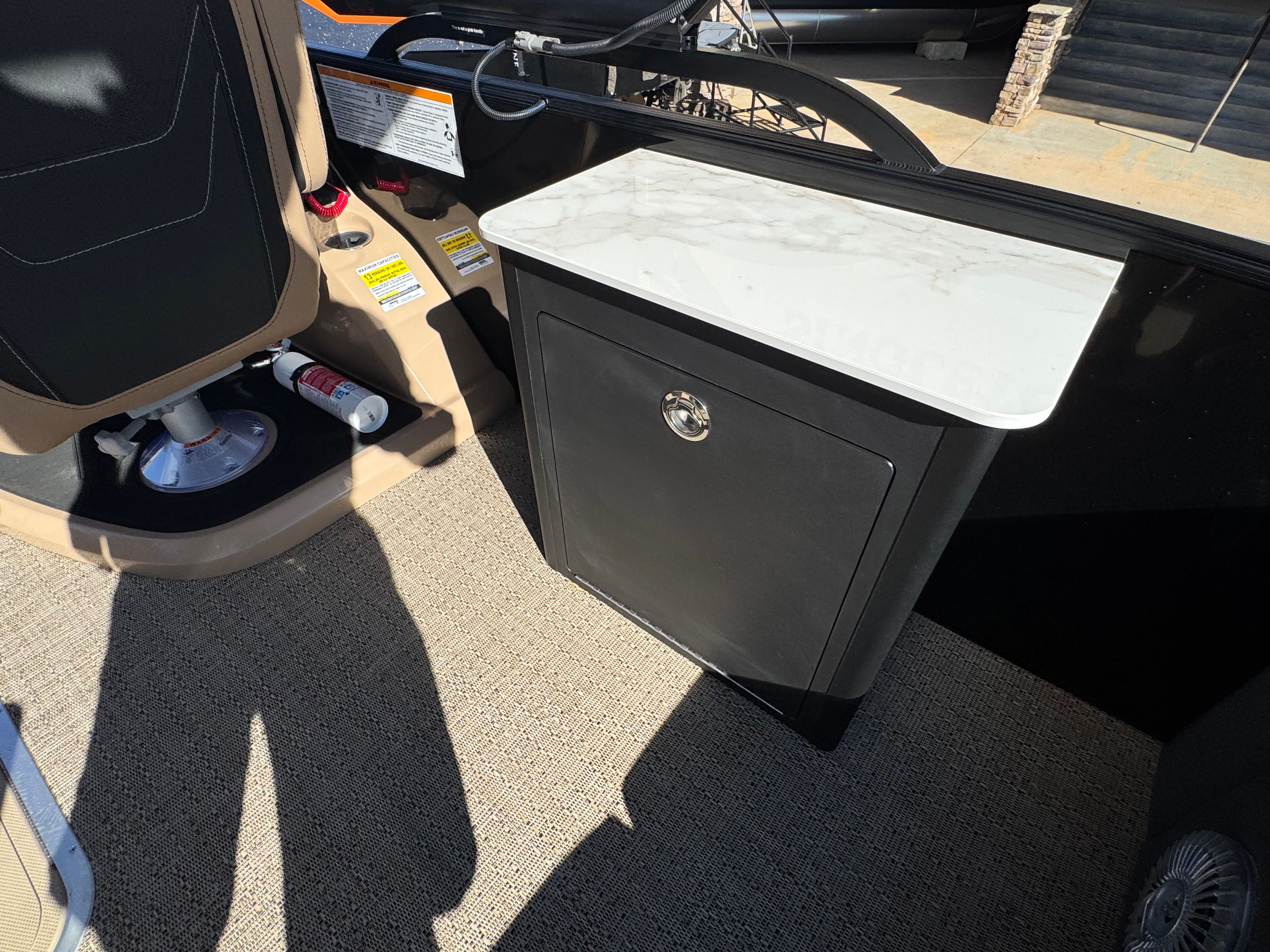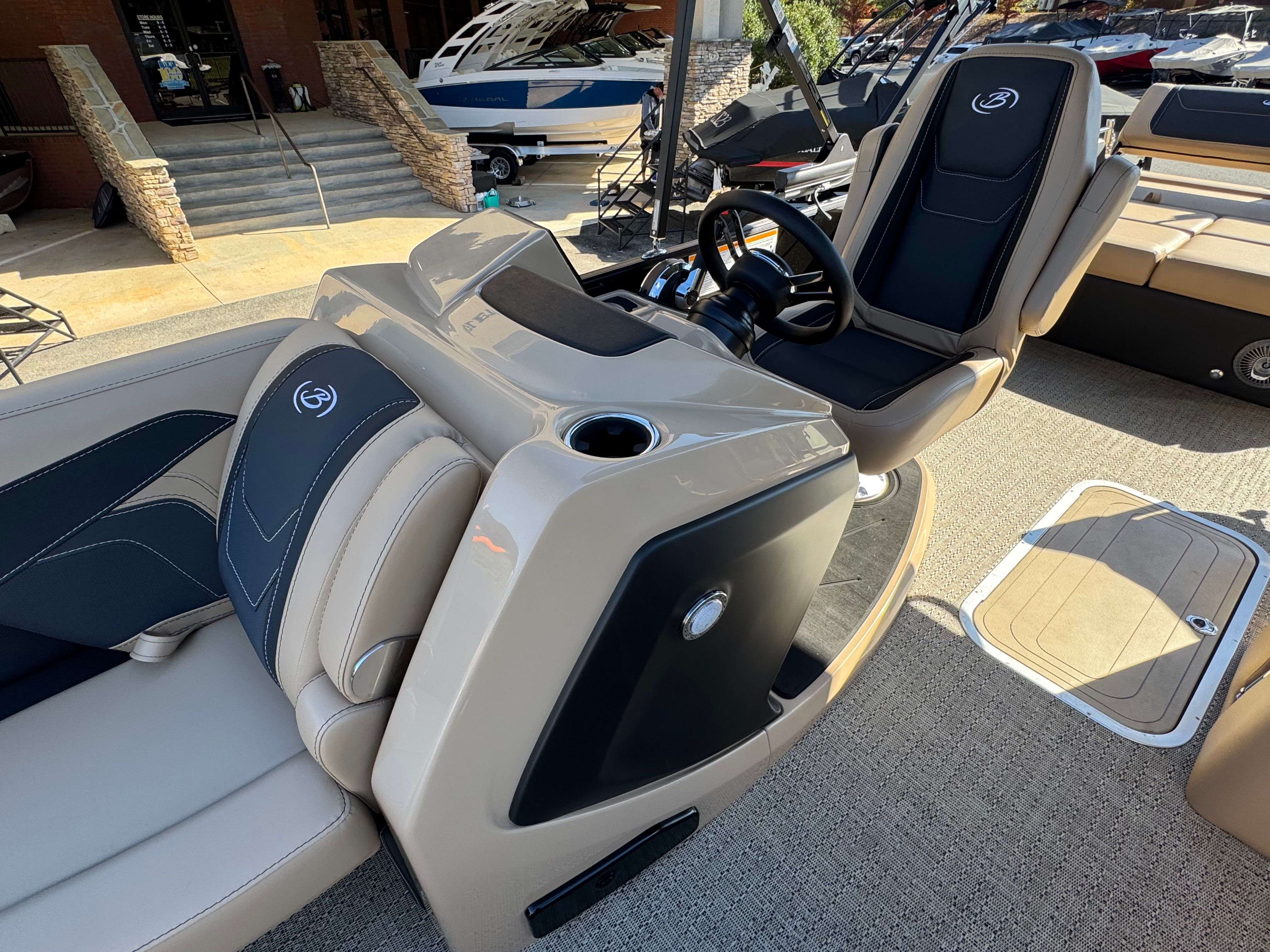 Powering the Cabrio C24UE is a robust Mercury 200L FourStroke engine, delivering an impressive 250 horsepower. This single-engine setup ensures smooth acceleration, responsive handling, and reliable performance whether you’re cruising at a leisurely pace or picking up speed for watersports. The Triple Toon Package with midship storage enhances stability and buoyancy, providing a smooth and confident ride even in choppier conditions. With Mercury’s mechanical pre-rig and power assist (200HP), you’ll enjoy effortless steering and precise control, making docking and maneuvering a breeze.