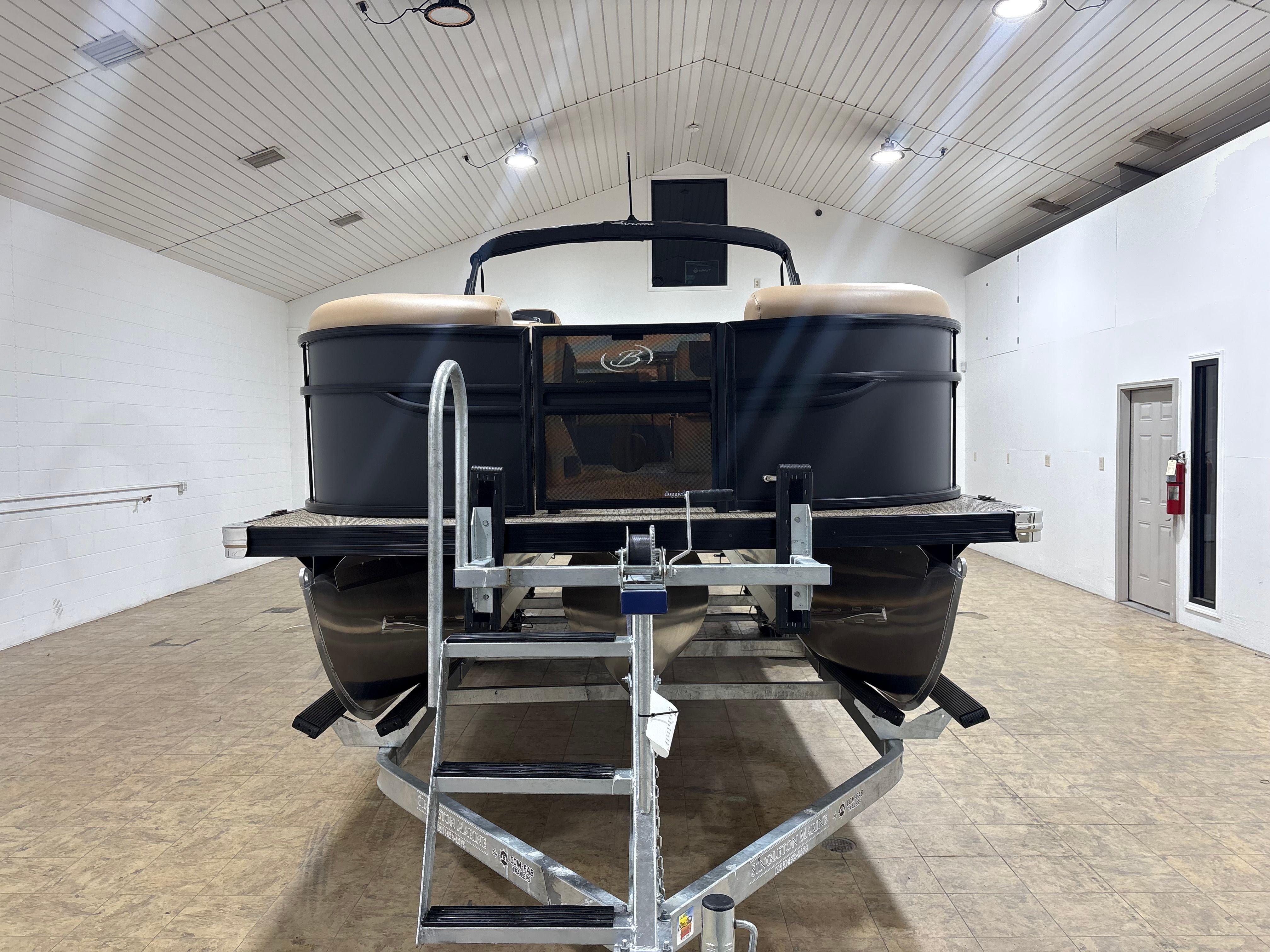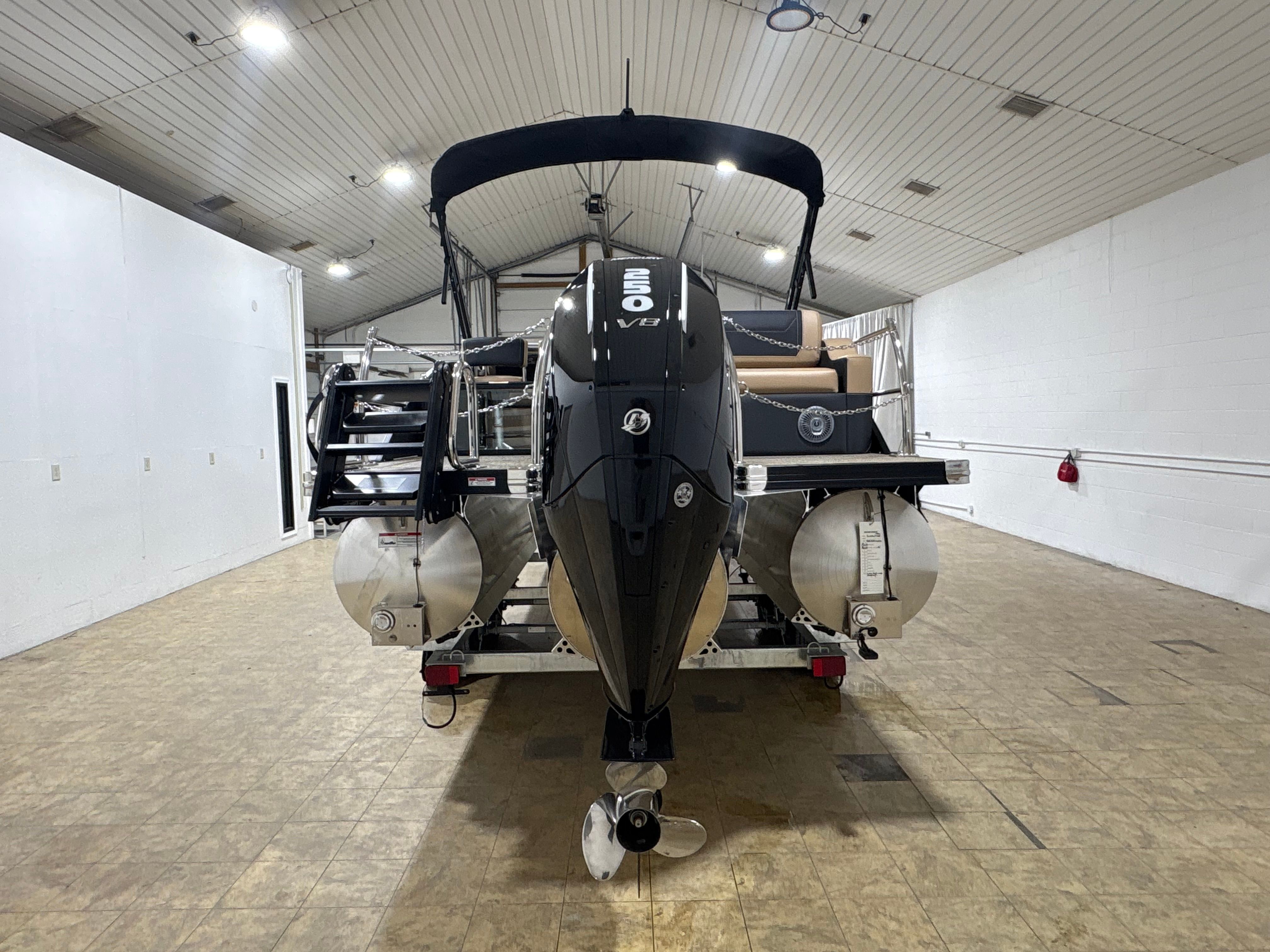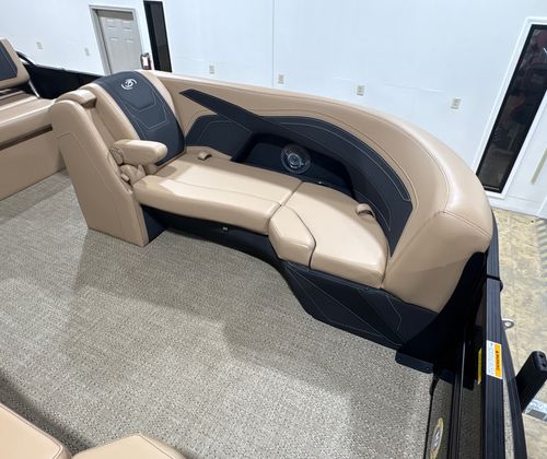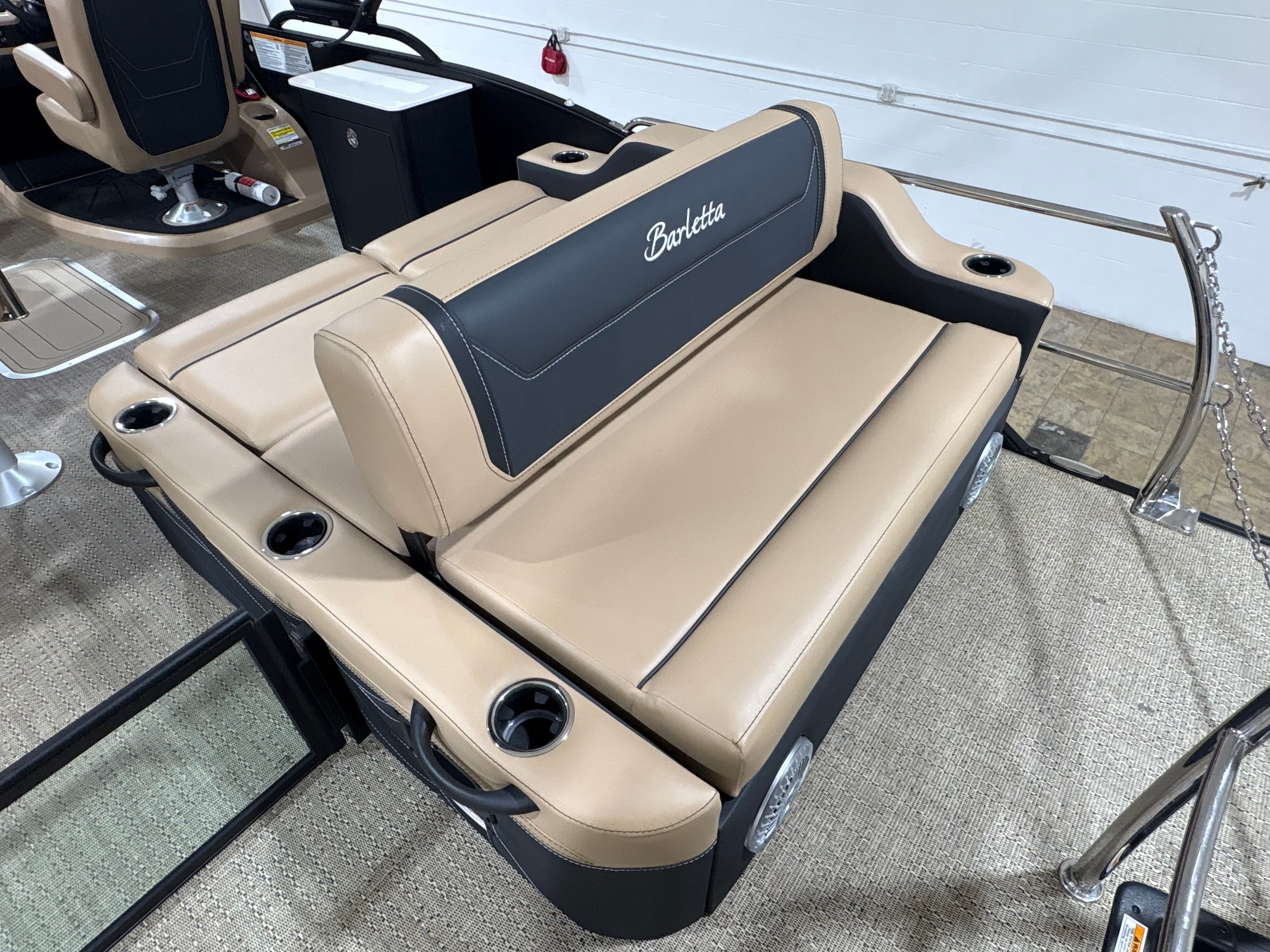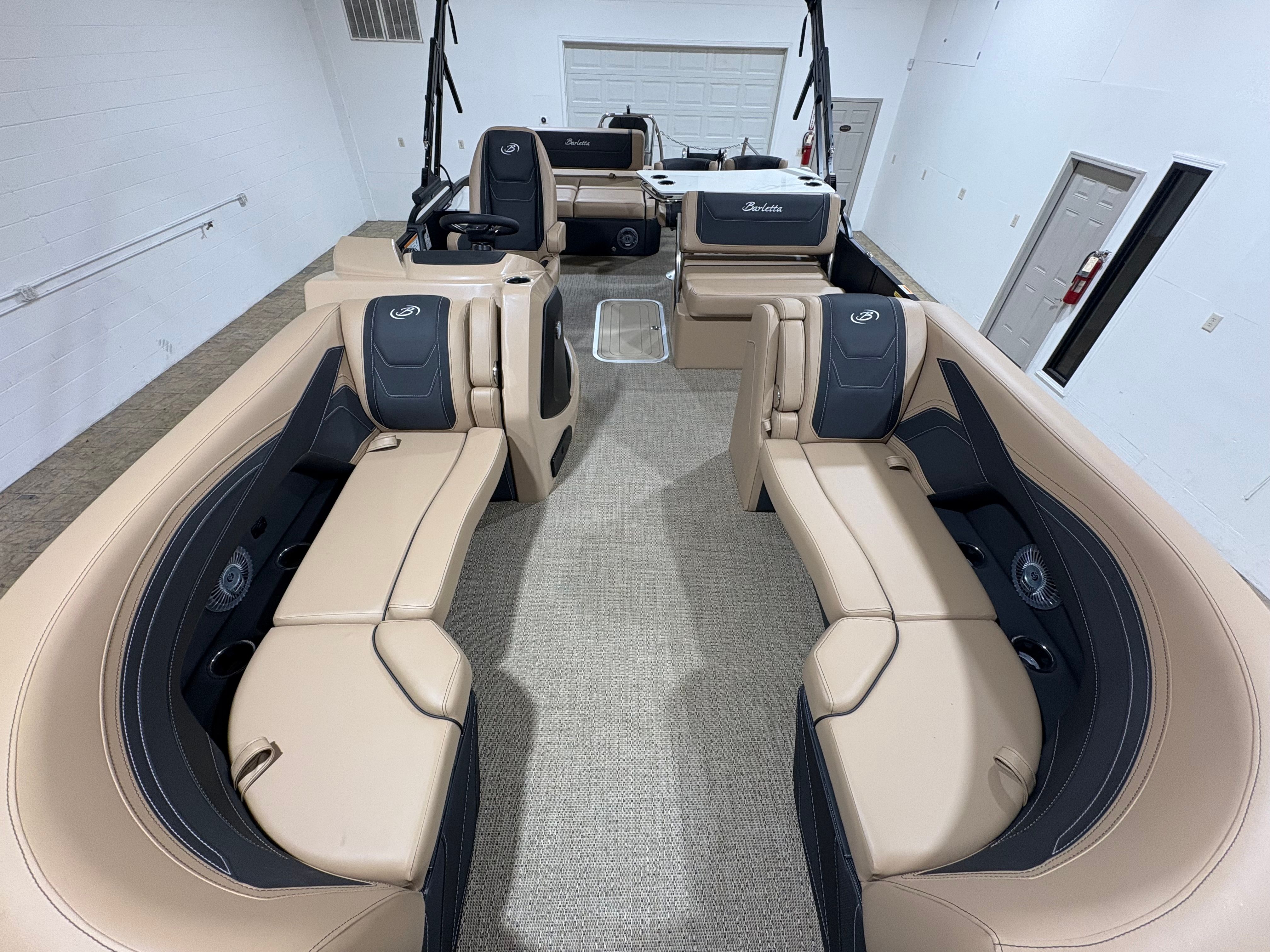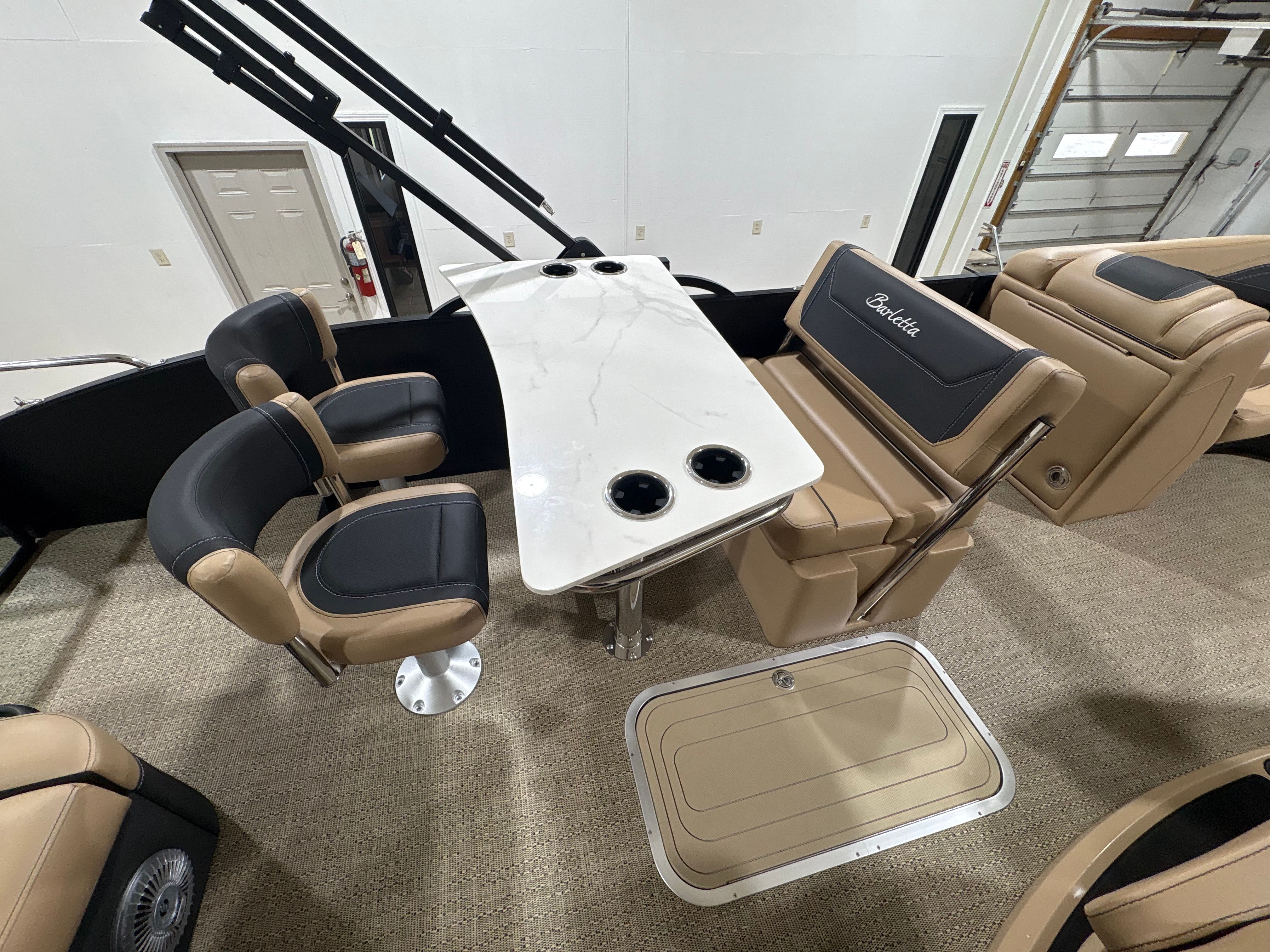 The 2026 Barletta Cabrio C24UE is loaded with features designed to enhance your time on the water. The striking Matte Black Railskin color, complemented by the Blackout Package Cabrio, gives this pontoon a bold and sophisticated presence. Step aboard and you are greeted by plush Carmella Tan furniture with Onyx accents, creating a warm and inviting atmosphere. The Amore Tan flooring is both stylish and practical, providing comfort underfoot and easy maintenance.One of the standout features of this model is the Triple Toon Package with midship storage, offering enhanced stability, improved handling, and ample space for storing gear and water toys. The stainless steel flag pole with an American flag adds a patriotic touch, while the exterior lighting package—including white underdeck and underwater lights—ensures your boat looks stunning day or night.