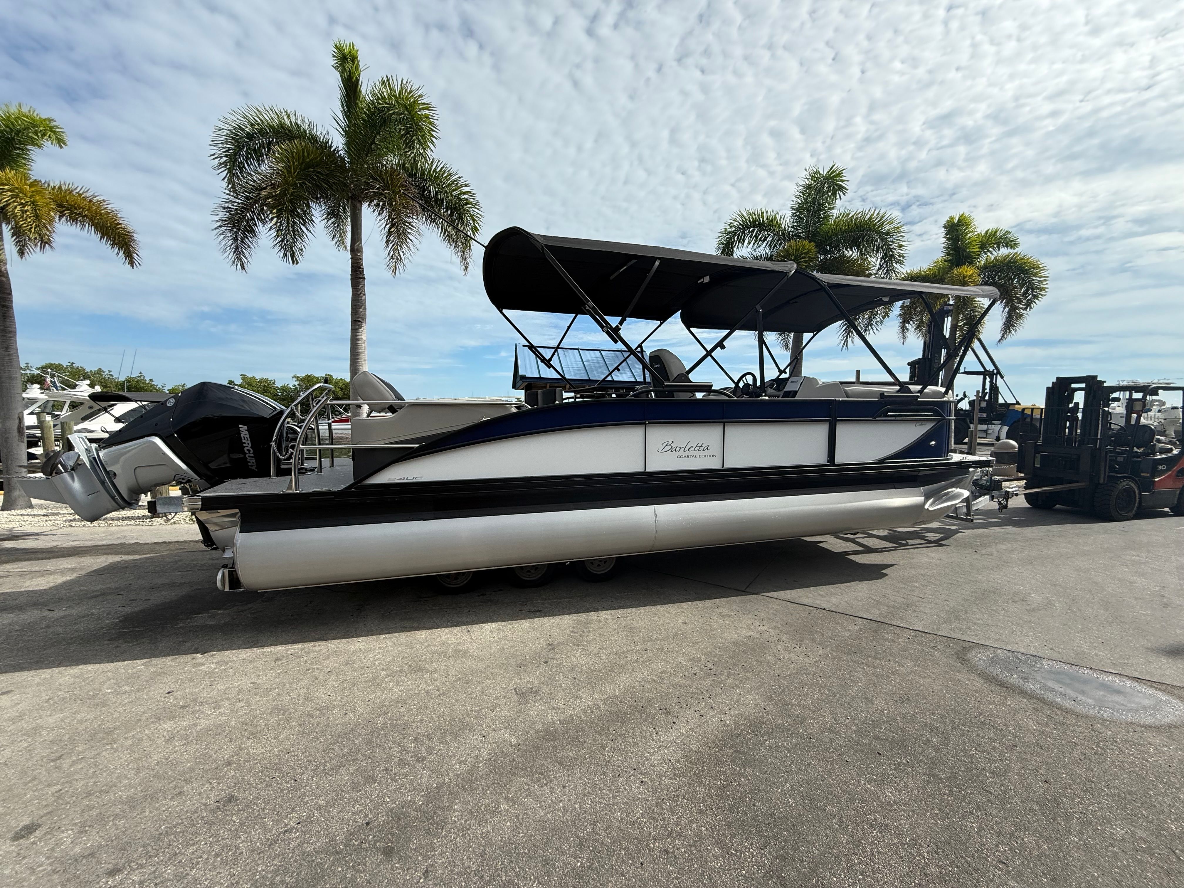 The Barletta Cabrio C24UE is packed with special features designed to elevate your time on the water. The Railskin Color in Bohemian Blue, complemented by a Winter White accent, gives the boat a sophisticated and modern look. The rig engine with a stainless steel prop ensures optimal performance and durability, while the deck mount fender basket provides convenient storage for your fenders, keeping the deck organized and clutter-free.One of the standout features is the Triple Toon Package with midship storage, offering enhanced stability and additional space for your gear. The double bimini provides generous shade, allowing you and your guests to stay cool and comfortable even on the hottest days. As part of the Coastal Edition Cabrio, this pontoon boat is built to withstand the elements, making it ideal for coastal adventures. The Amore Gray flooring is both stylish and practical, offering a non-slip surface that’s easy to clean. The exterior is finished with a stainless steel flag pole and an American flag, adding a patriotic touch to your boating experience.
