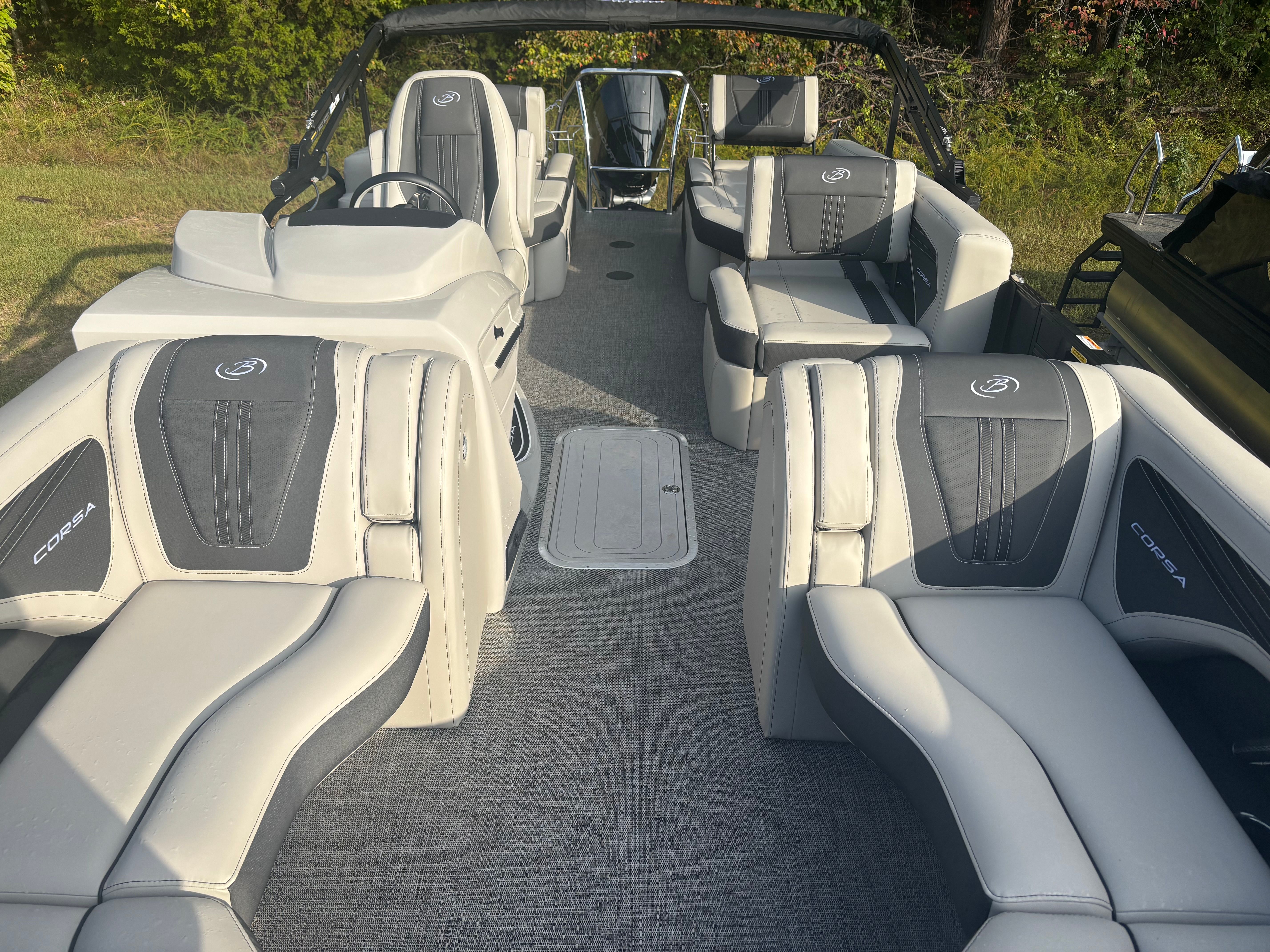 The 2026 Barletta Corsa 23M pontoon boat is a remarkable fusion of luxury, performance, and innovation. With its powerful Mercury 250L Verado V8 engine, advanced digital controls, and premium features such as the 2-bank battery charger, Amore Gray flooring, Soft Touch Marquesan Gray furniture, Blackout Package Corsa, and elegant exterior lighting, this pontoon stands out as a top choice for discerning boaters. If you are looking for a Barletta boat for sale that promises unforgettable memories, effortless handling, and head-turning style, the Corsa 23M is ready to deliver. Take the next step toward your dream boating lifestyle and discover all that this exceptional pontoon has to offer. Contact the dealer today for more information and to schedule your personal tour of the Barletta Corsa 23M.