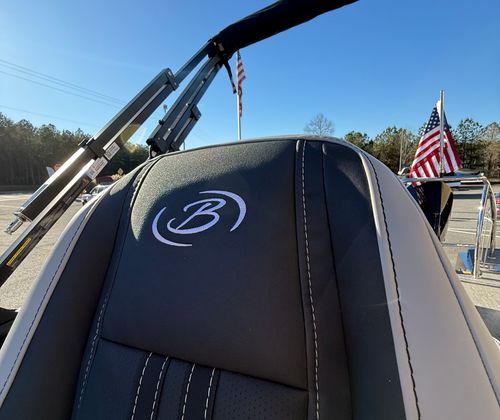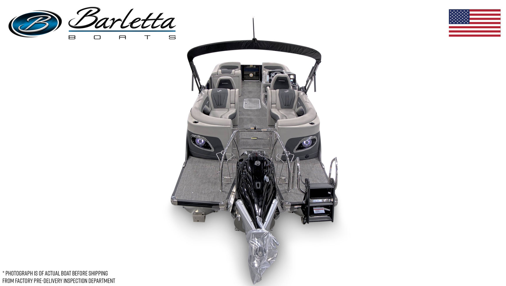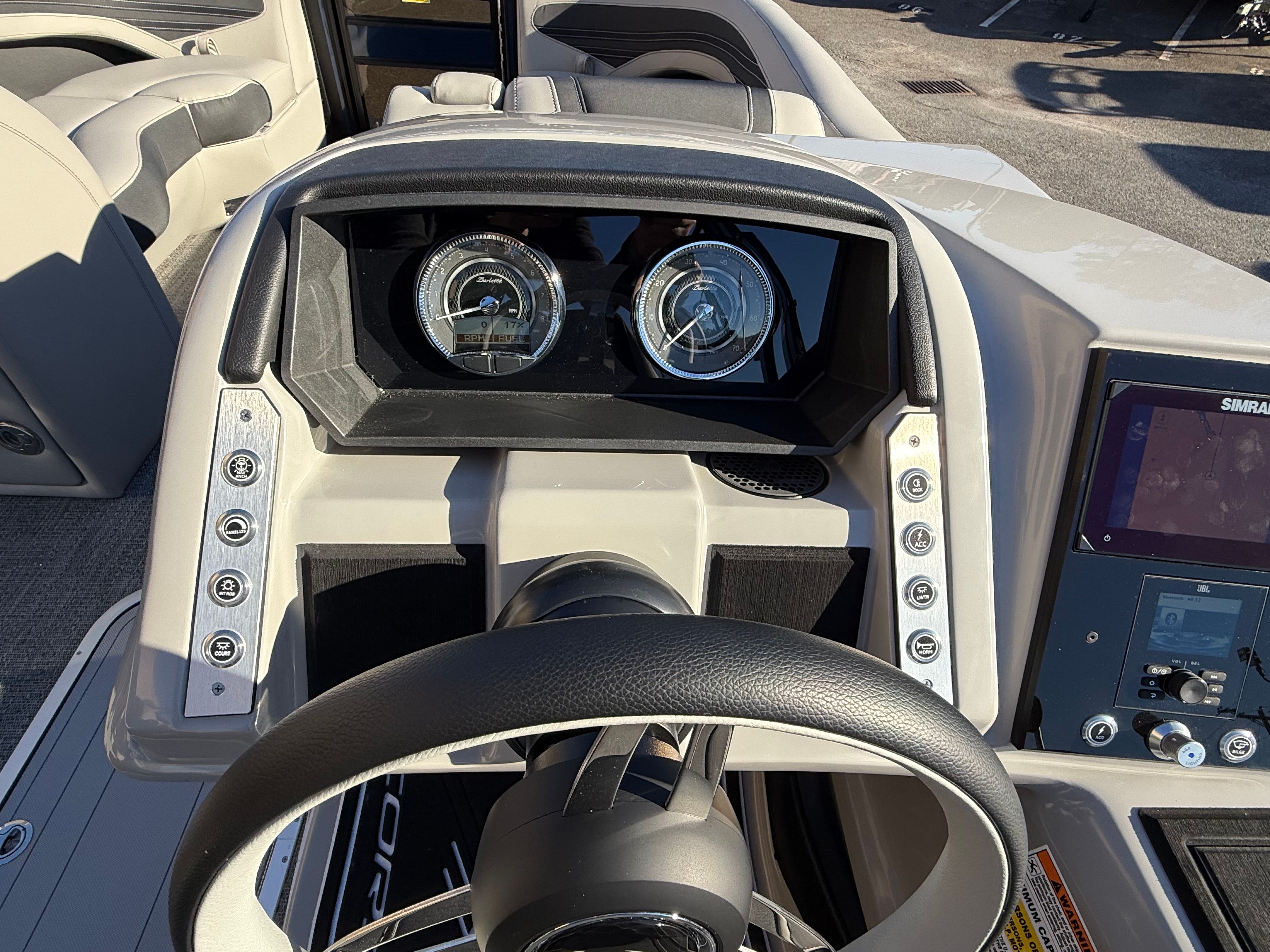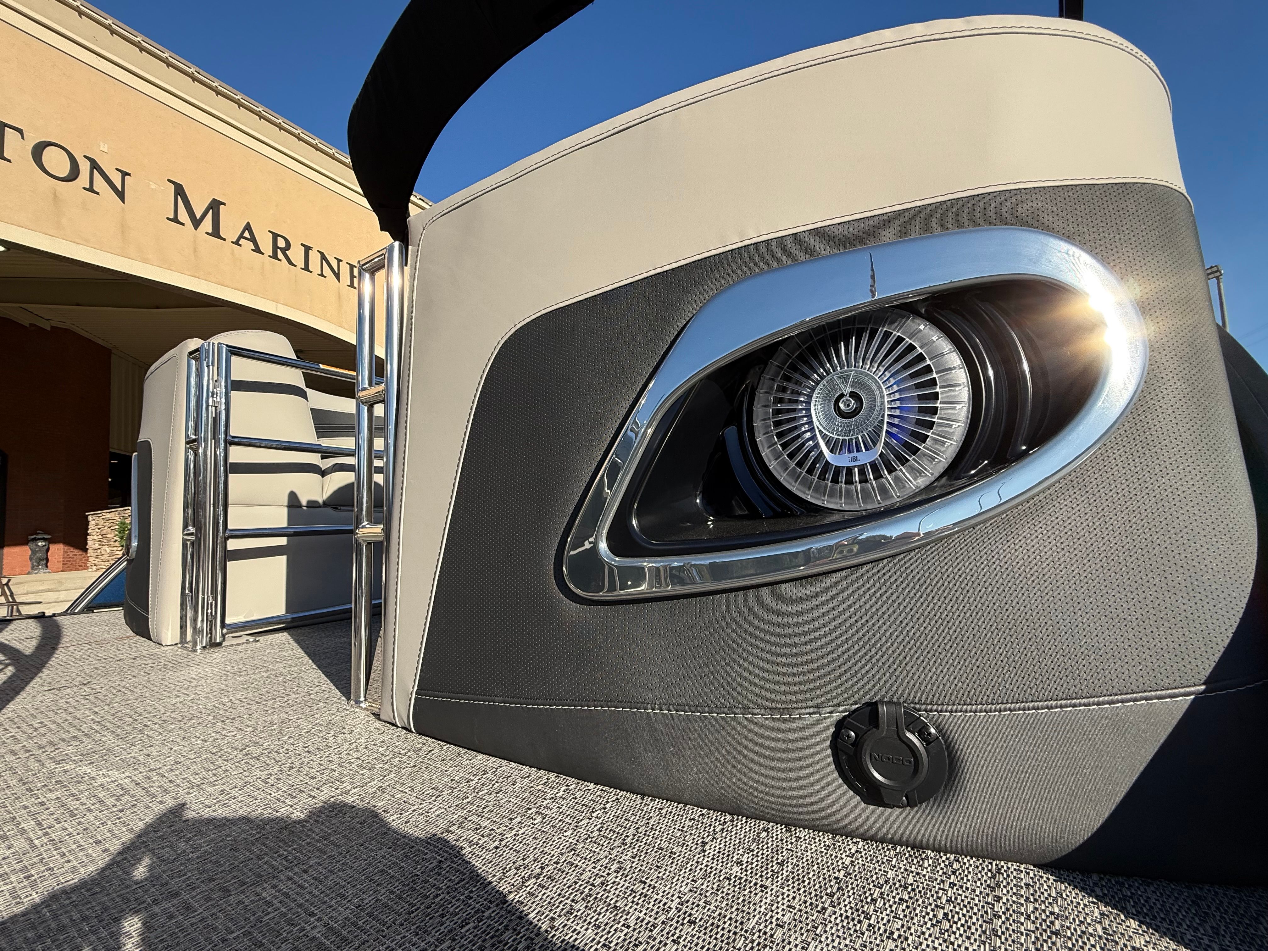 This pontoon boat for sale is packed with premium features that set it apart from the competition. The Railskin Color in Blue Sapphire, accented by Gray Moonstone, creates a striking visual presence on the water. The Blackout Package Corsa adds a touch of sophistication, while the Soft Touch Marquesan Gray furniture with Carbon Accent provides plush seating for all passengers. The Amore Gray flooring is both stylish and practical, offering comfort underfoot and easy maintenance.Digital gauges keep you informed of all vital metrics, ensuring a safe and enjoyable boating experience. The on-board battery charger supports two batteries, providing reliable power for all your electronics and accessories. A stainless steel flag pole with an American flag adds a patriotic touch to the exterior, making this Barletta boat for sale a true standout at any marina or dock.