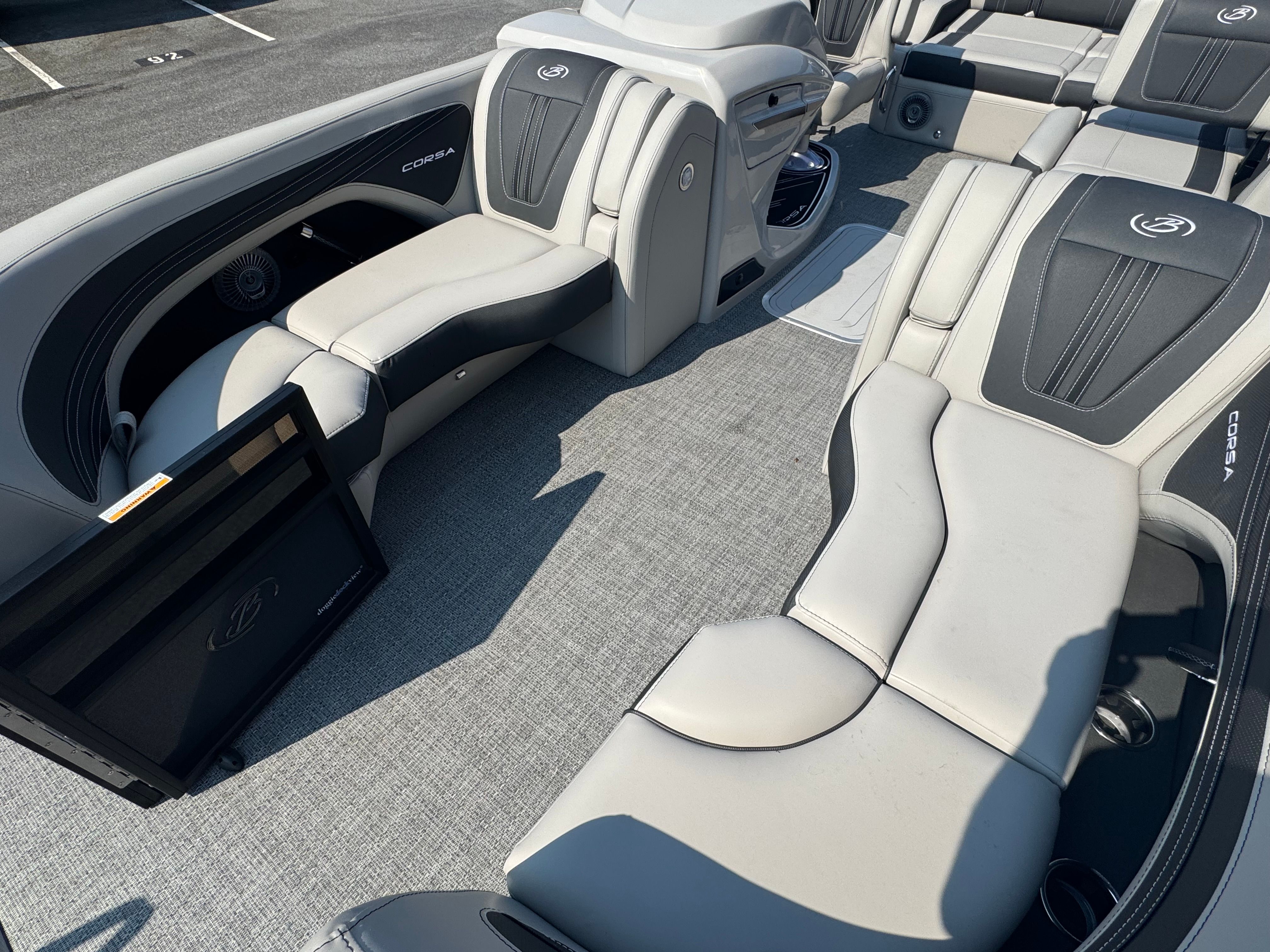 The Barletta Corsa 23U is packed with premium features that set it apart from other pontoon boats for sale. The Black Diamond Railskin and Blackout Package Corsa create a striking exterior, complemented by white underdeck and underwater lighting that enhances evening ambiance and visibility. The Amore Gray flooring provides a durable, stylish foundation, while the Soft Touch Marquesan Gray furniture with Carbon Accent ensures maximum comfort and elegance for all passengers.At the helm, the Corsa Simrad Engine Integration with Digital Motor offers advanced navigation and engine monitoring, keeping you informed and in control throughout your journey. Digital gauges provide accurate, easy-to-read data, and the stainless steel flag pole with an American flag adds a patriotic touch to your vessel. The rigging includes a stainless steel prop for enhanced performance and durability, ensuring that every outing is smooth and enjoyable.