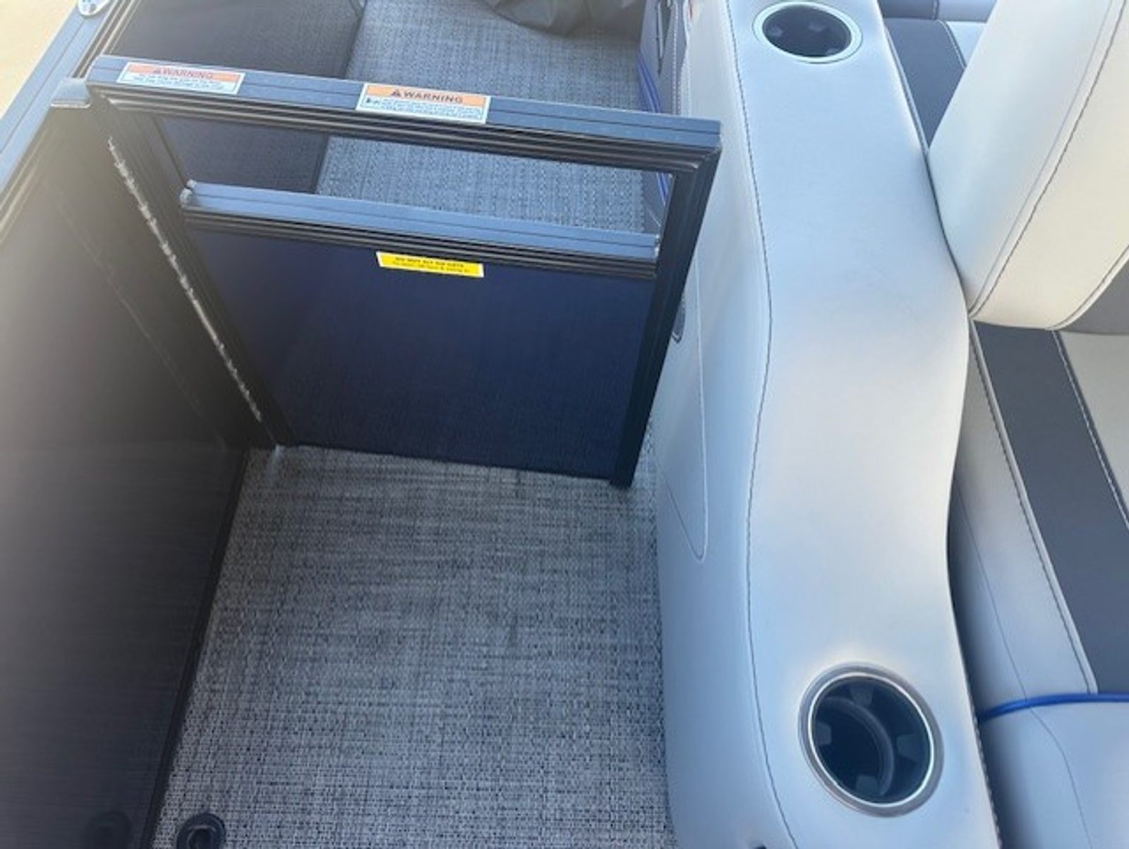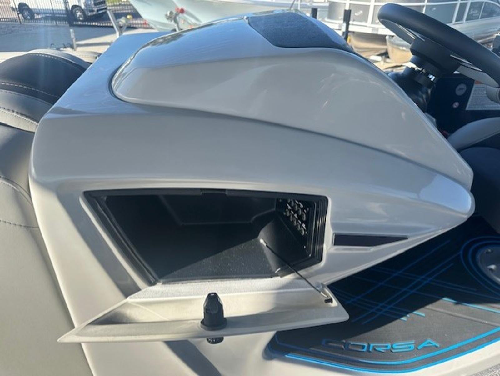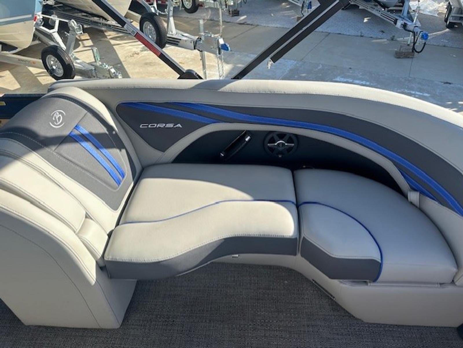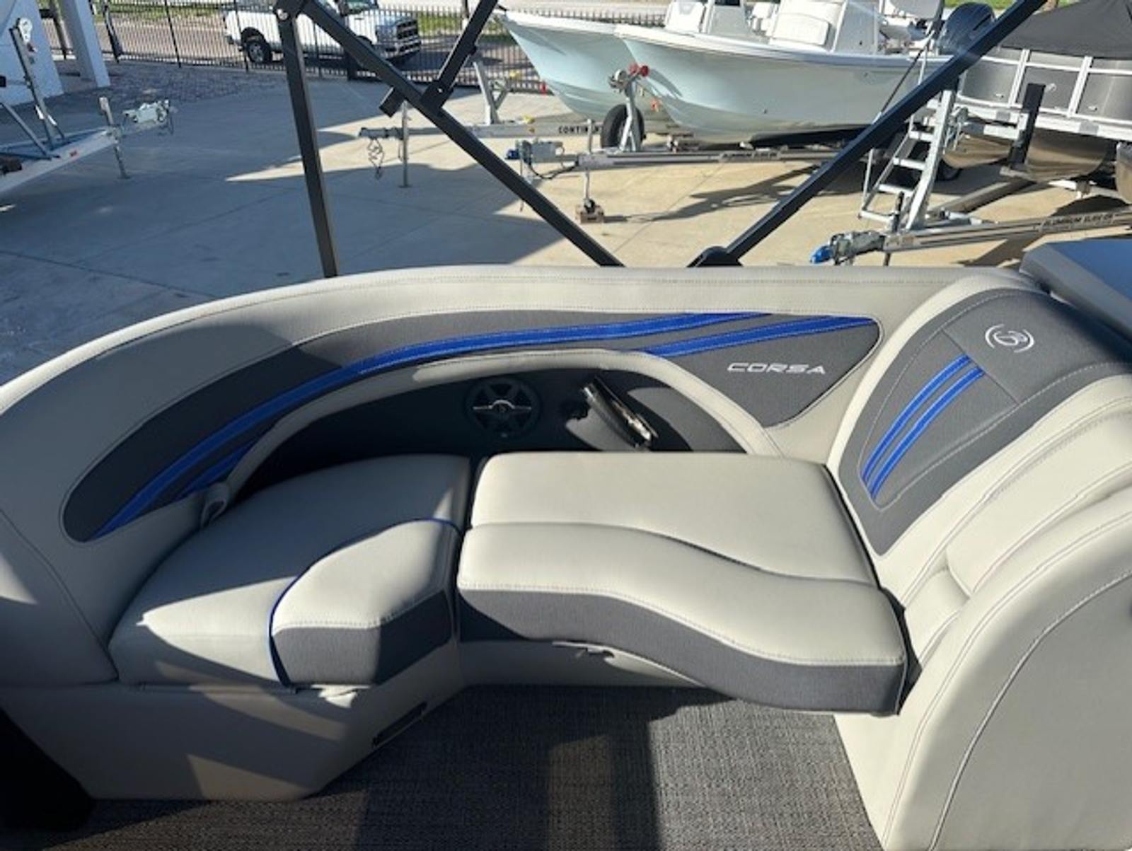 The Barletta Corsa 23UC is loaded with premium features that elevate your boating experience. The double bimini setup, including an additional power bimini, provides versatile shade options, so you can enjoy sunny days without worrying about overheating. The 25-inch transom enhances stability and ride comfort, while the anchor storage at the bow gate offers a convenient spot to stow your anchor, keeping the deck clutter-free.Safety is a top priority, with stainless steel safety stanchions and chains ensuring secure movement around the boat. The Blue Sapphire Railskin color gives the exterior a striking, modern look, complemented by white underdeck and underwater lighting that creates a captivating ambiance during evening cruises. The Amore Gray flooring adds a touch of sophistication and is designed for durability and easy maintenance, making it ideal for active boaters.