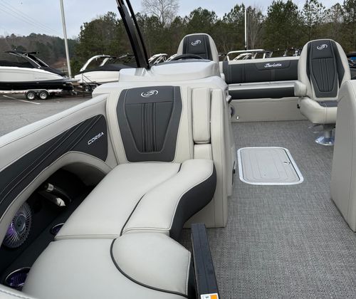 The Barletta Corsa 23UC is packed with special features that elevate its appeal and functionality. The Railskin Color in Black Diamond, paired with the Bohemian Blue accent, gives this pontoon boat a bold and sophisticated look. The Blackout Package Corsa adds a touch of exclusivity, making the boat stand out on any waterway. Inside, the Soft Touch Marquesan Gray furniture with Carbon Accent offers plush seating and a refined atmosphere, while the Amore Gray flooring provides both comfort and durability underfoot.For those who appreciate advanced technology, the Corsa 23UC comes equipped with digital gauges, ensuring you have all the vital information at your fingertips. The Mercury Digital DTS Pre-Rig for VERADO engines with Vessel Link streamlines engine management, while the on-board battery charger with two batteries guarantees reliable power for all your onboard electronics. The Sport Bimini (installed in place of the standard bimini) offers shade and protection, allowing you to enjoy the outdoors in comfort. Every aspect of this pontoon boat is designed to maximize convenience, safety, and enjoyment.