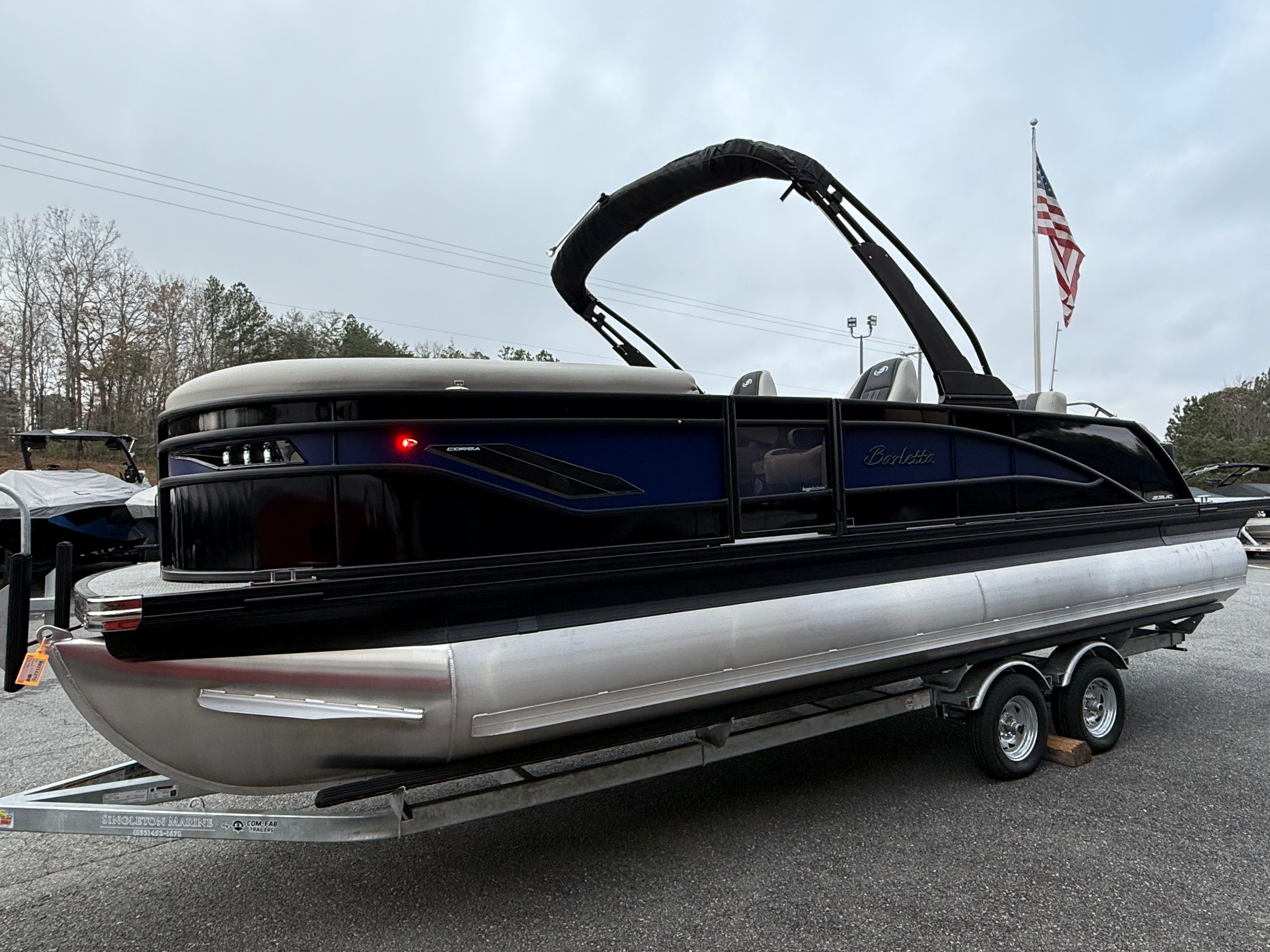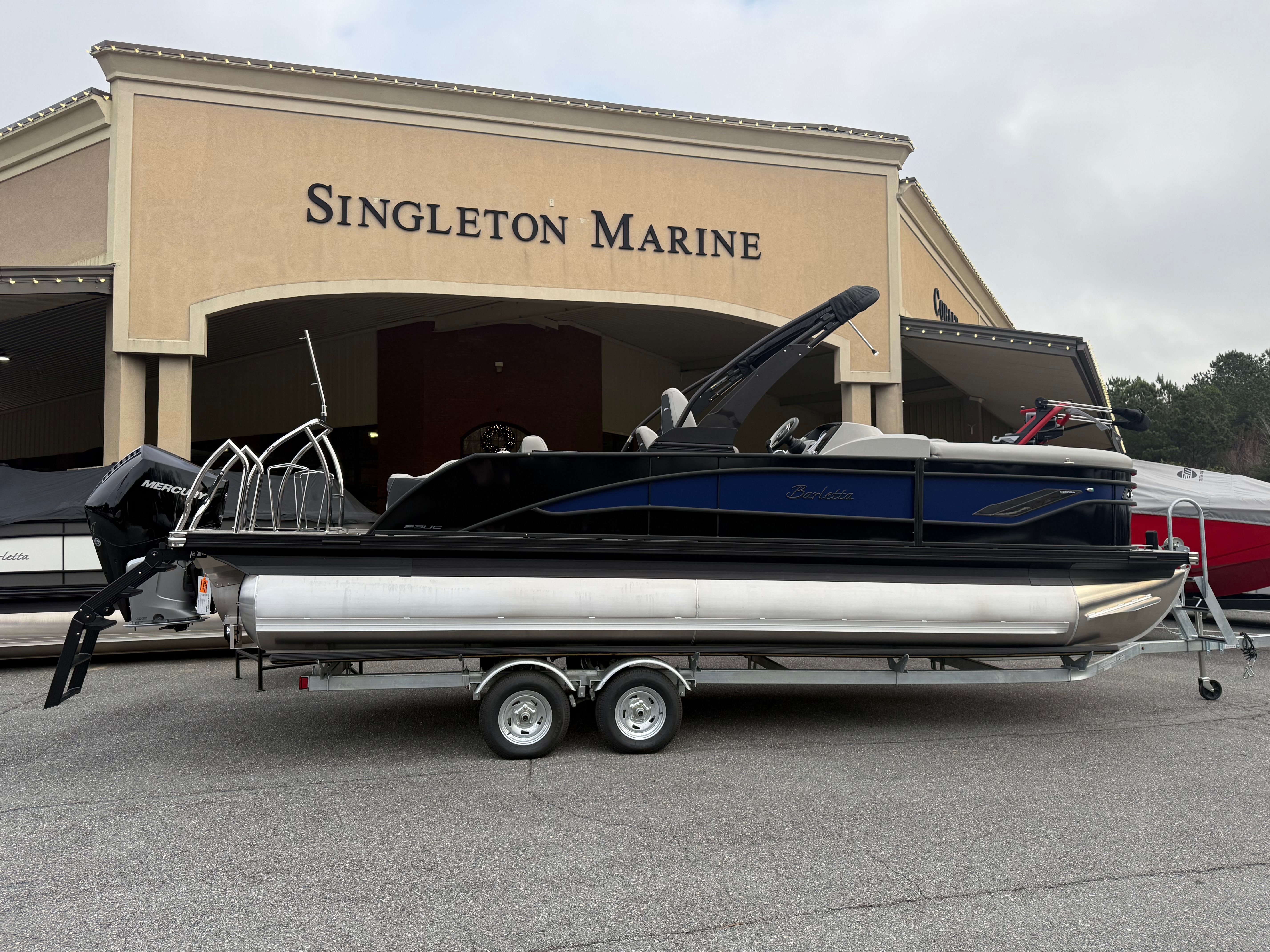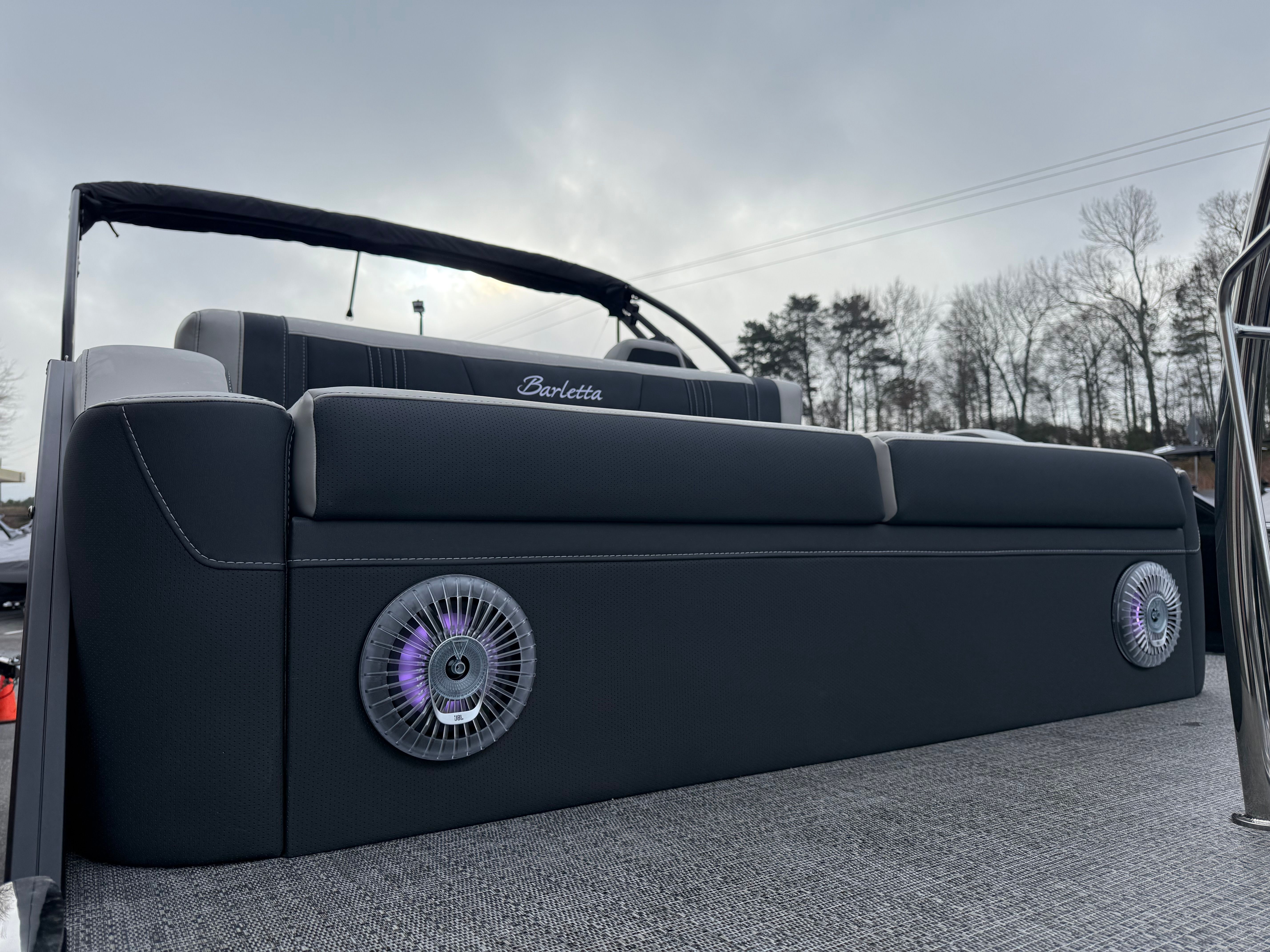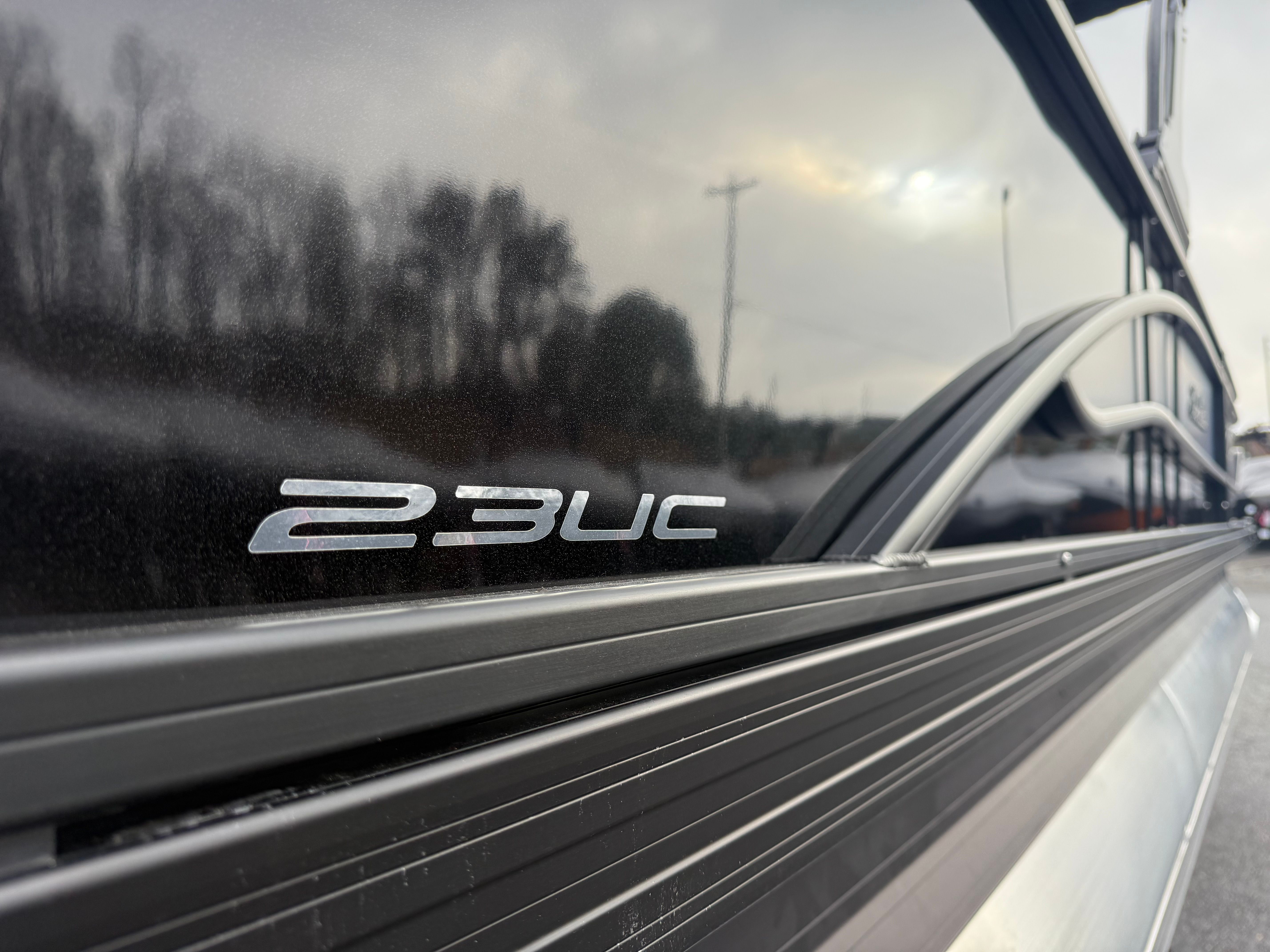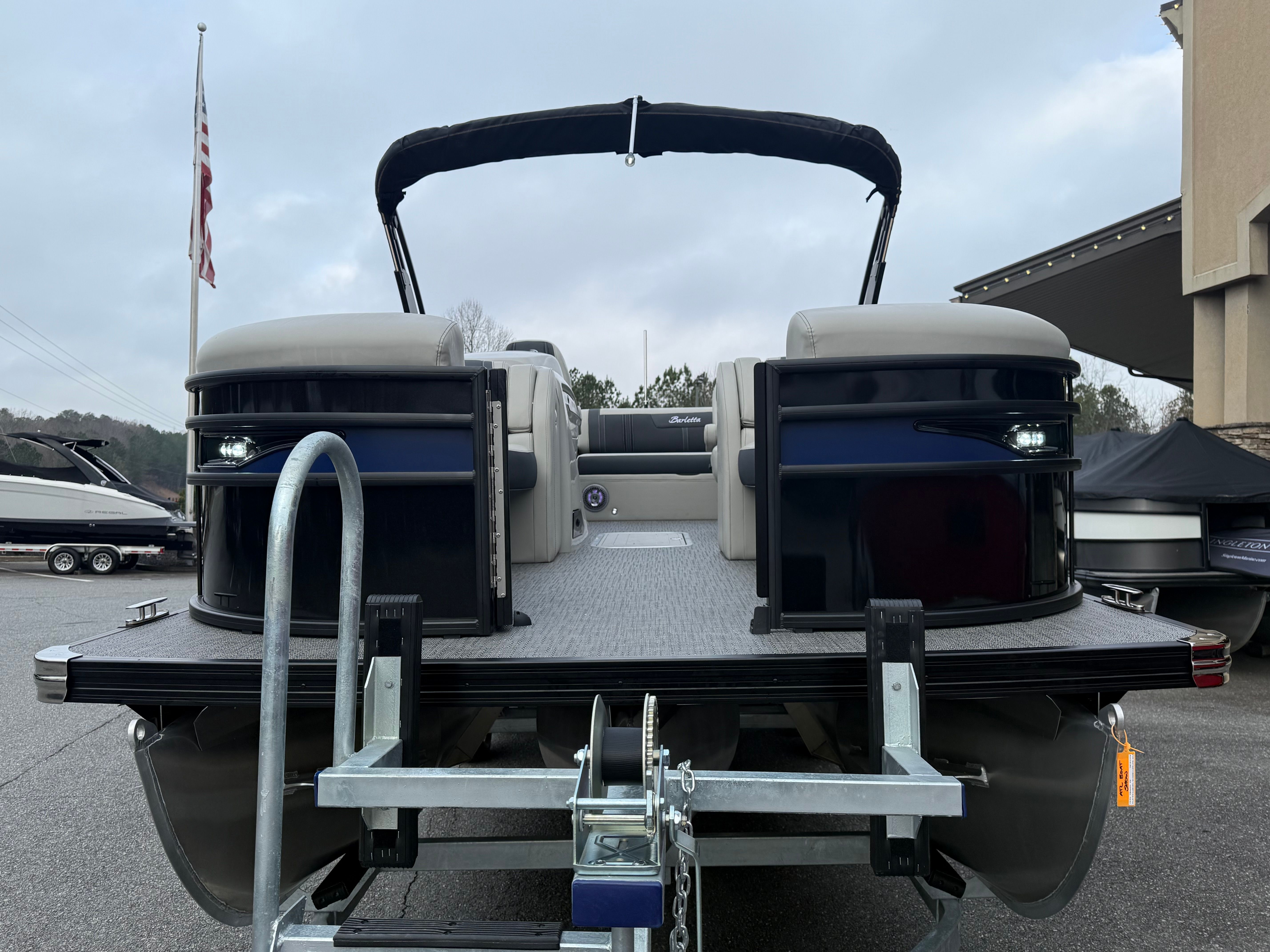 The 2026 Barletta Corsa 23UC is a 25-foot pontoon boat that stands out with its sleek profile and contemporary aesthetics. Built for both leisure and excitement, this Barletta boat for sale offers ample space for family and friends, making it the perfect vessel for social gatherings, weekend getaways, or tranquil cruises. The Corsa 23UC’s modern design is complemented by its striking Railskin Color in Black Diamond, accented with Bohemian Blue, and enhanced by the Blackout Package Corsa. Every detail of this pontoon boat is crafted to deliver a premium boating experience, from its stylish furniture to its advanced construction.