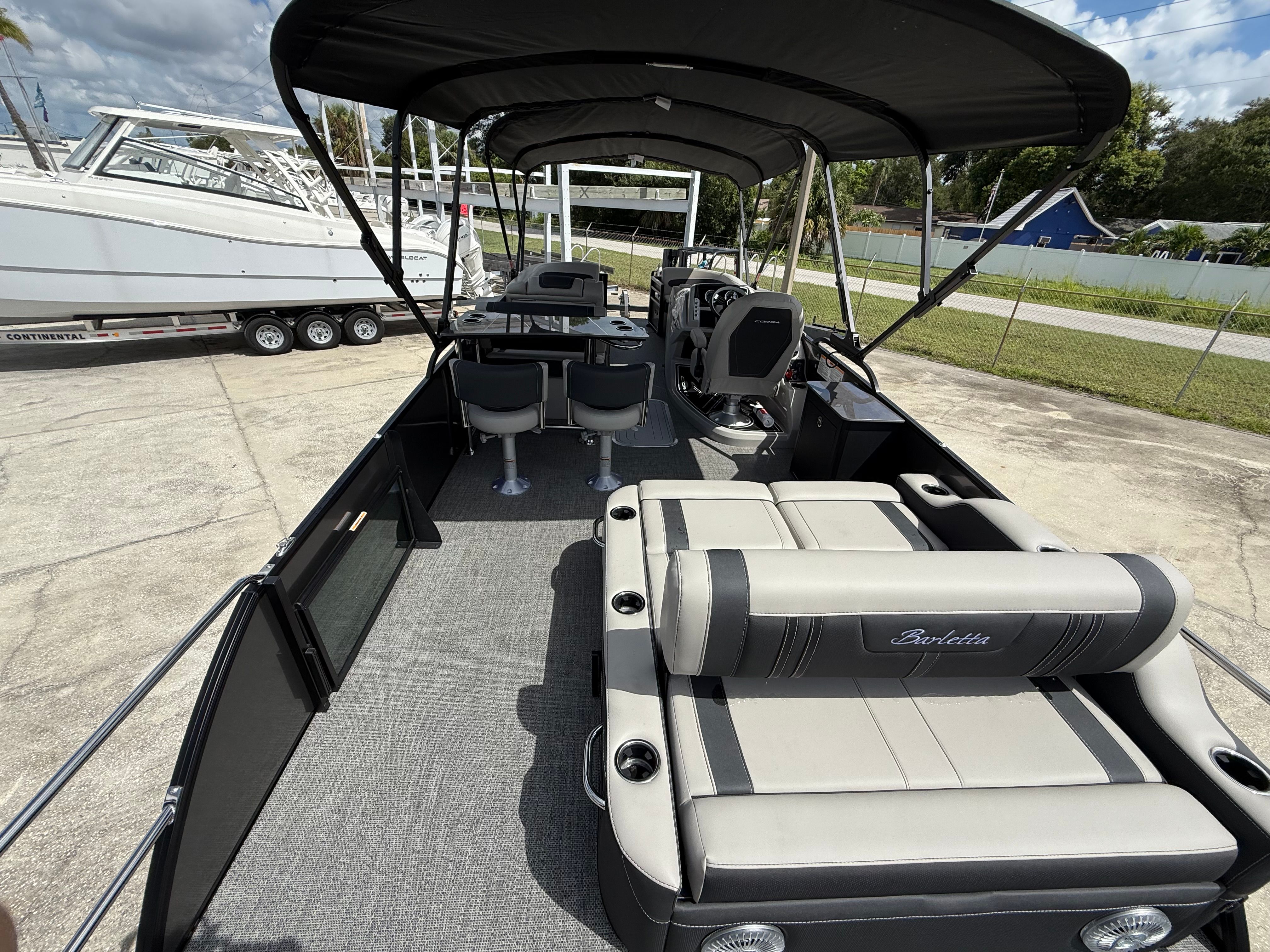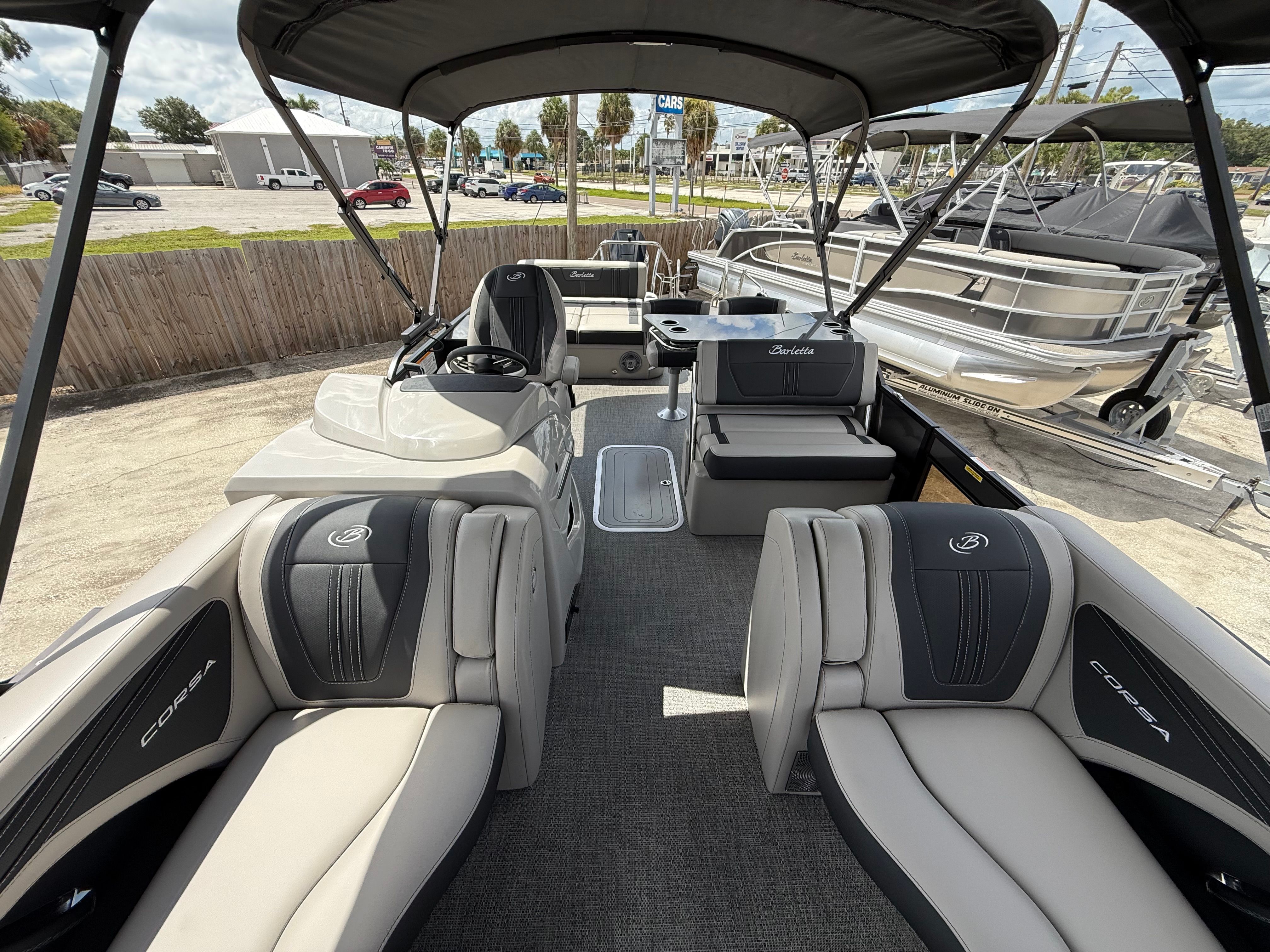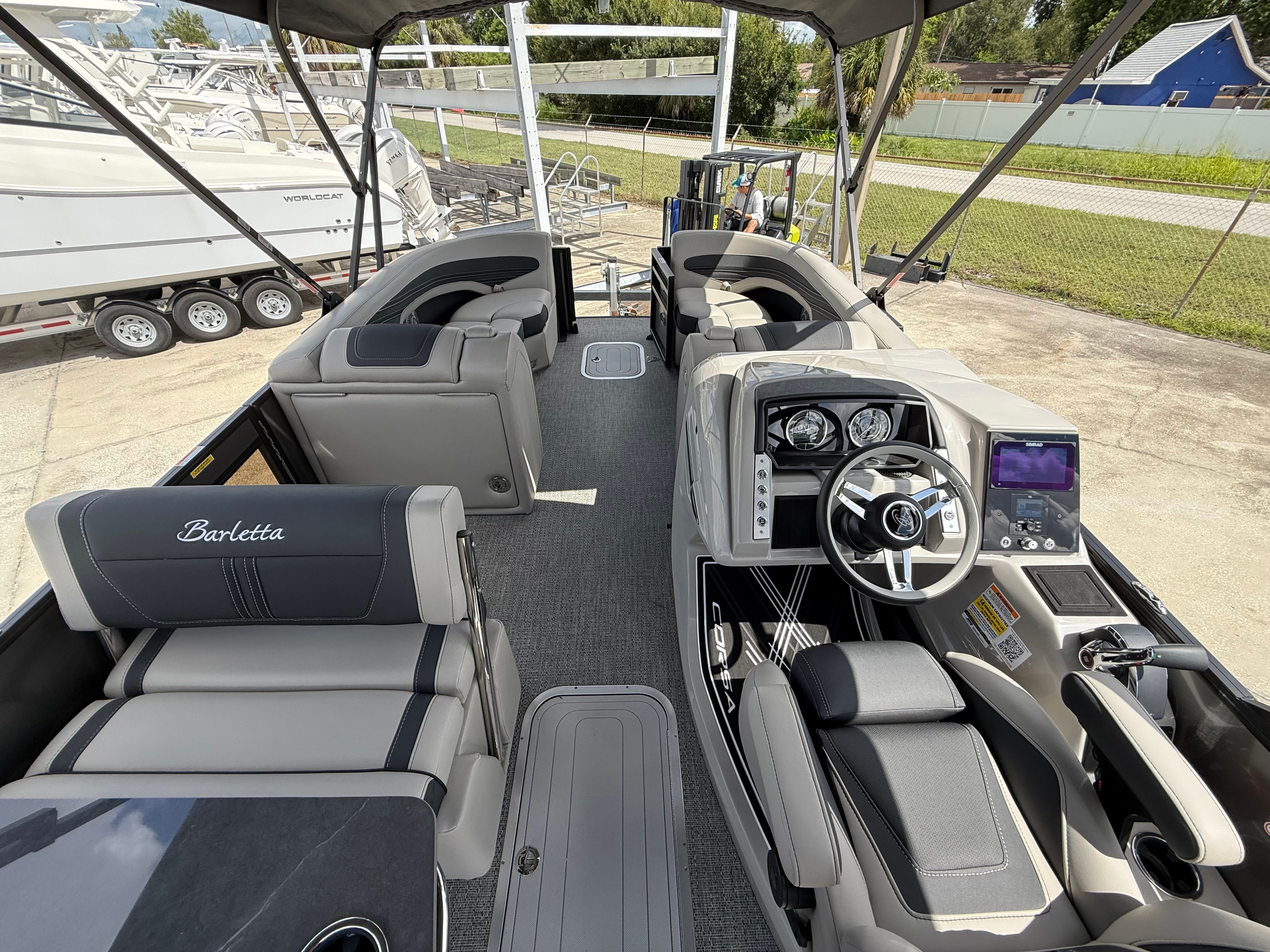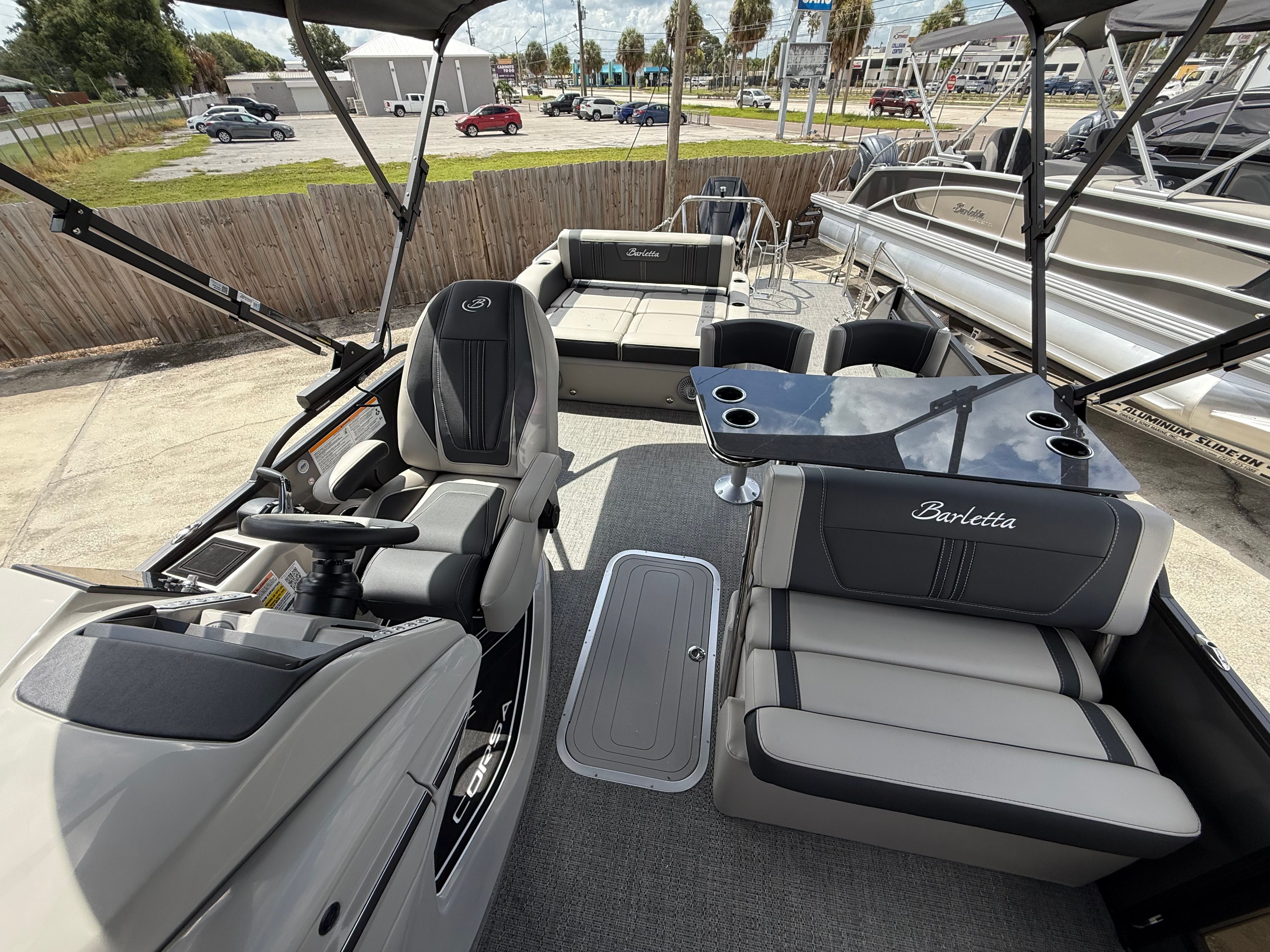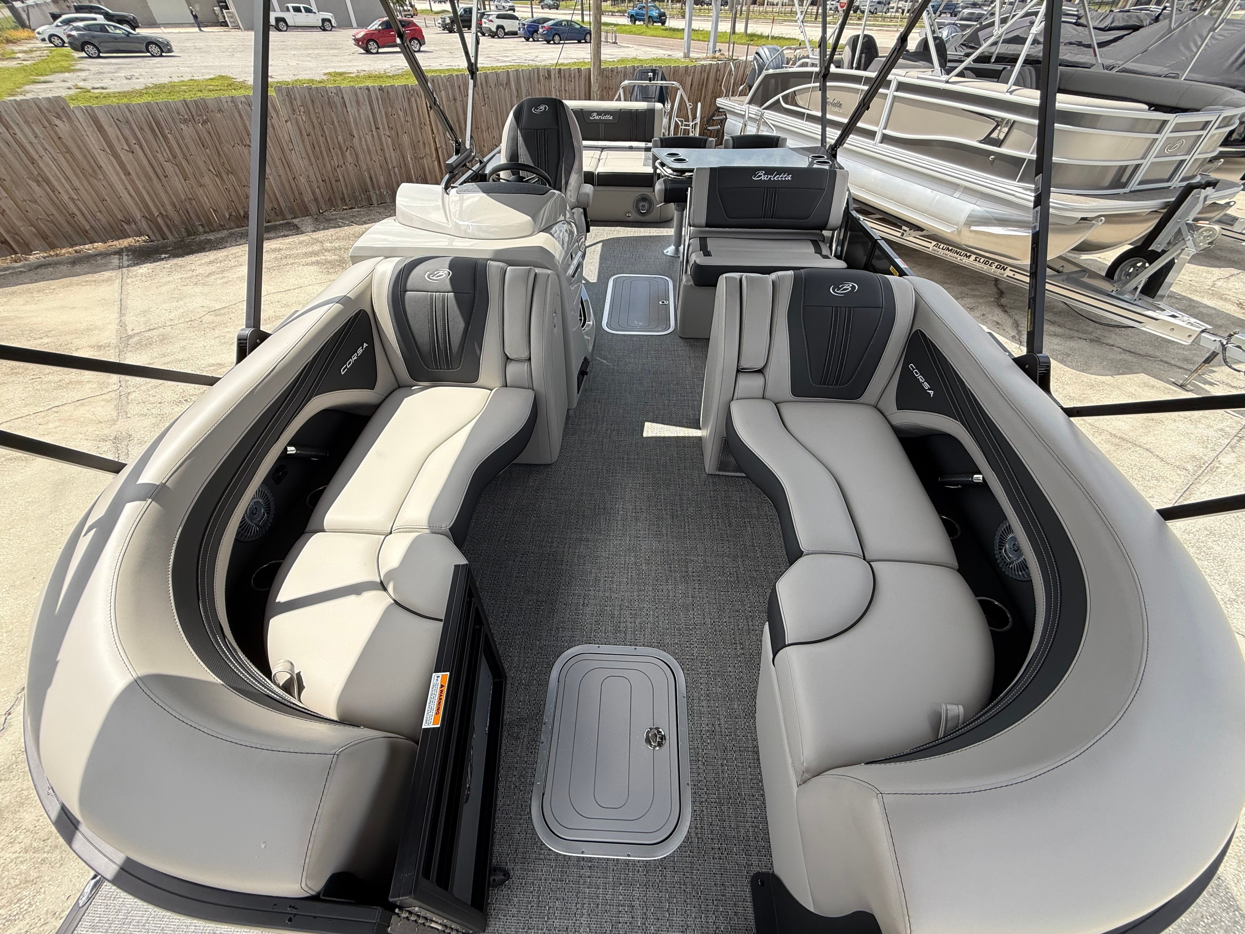 In summary, the 2026 Barletta Corsa 25UE is a premier pontoon boat for sale that combines cutting-edge design, luxurious comfort, and outstanding performance. With its striking Gray Moonstone and Black Diamond color scheme, Blackout Package Corsa, plush Soft Touch Marquesan Gray furniture, Amore Gray flooring, and the powerful Mercury (D) 350L V10 Verado engine, this Barletta boat for sale is truly in a class of its own. The Coastal Edition Corsa and double bimini add to its versatility and appeal, making it the ultimate choice for those who demand the best from their boating experience.If you are ready to elevate your time on the water and create lasting memories with family and friends, the Barletta Corsa 25UE is waiting for you. Discover the joy of owning a pontoon that delivers on every promise—style, comfort, performance, and fun. Contact your local dealer today to learn more about this exceptional pontoon and take the first step toward your next great adventure.