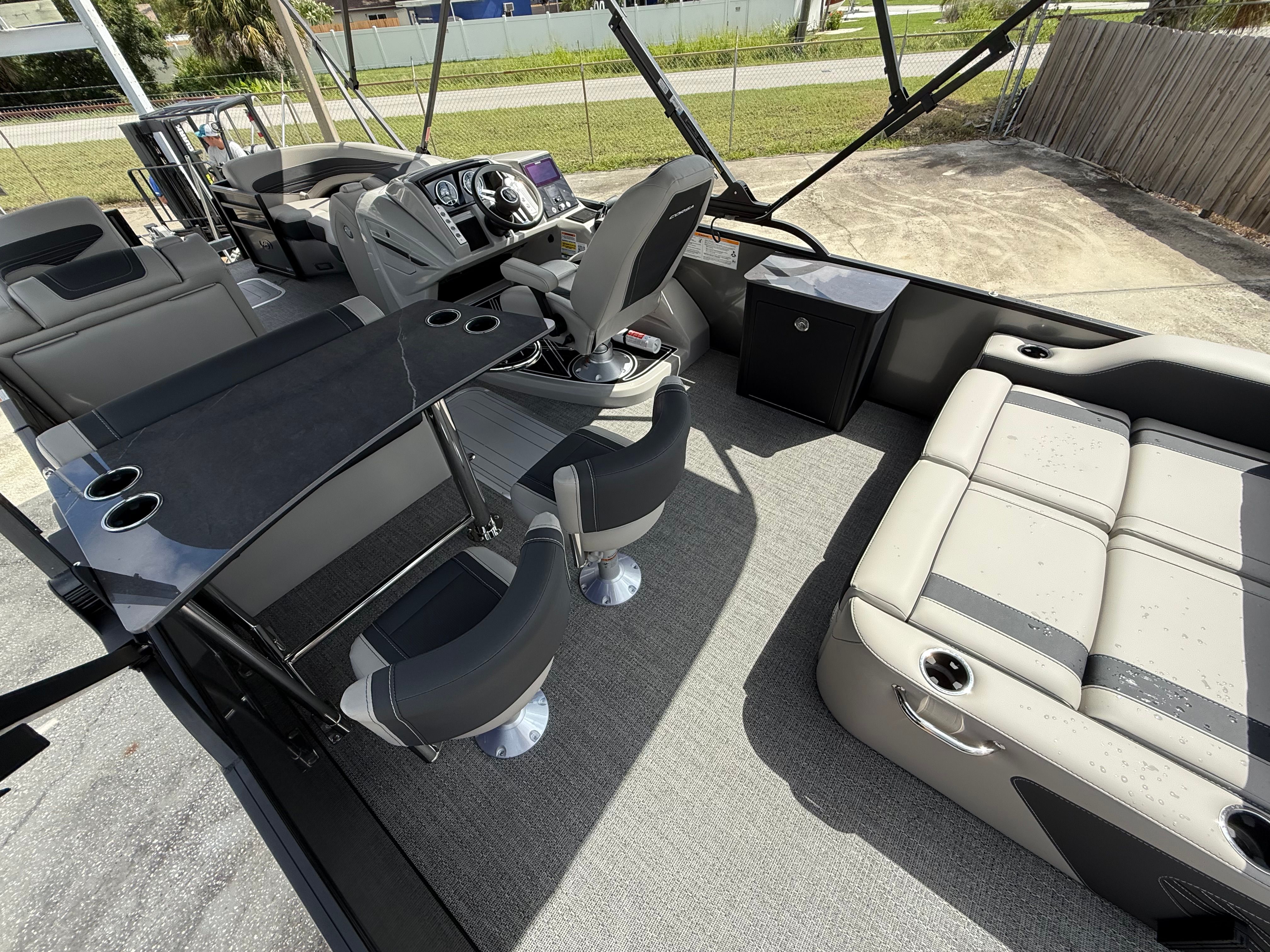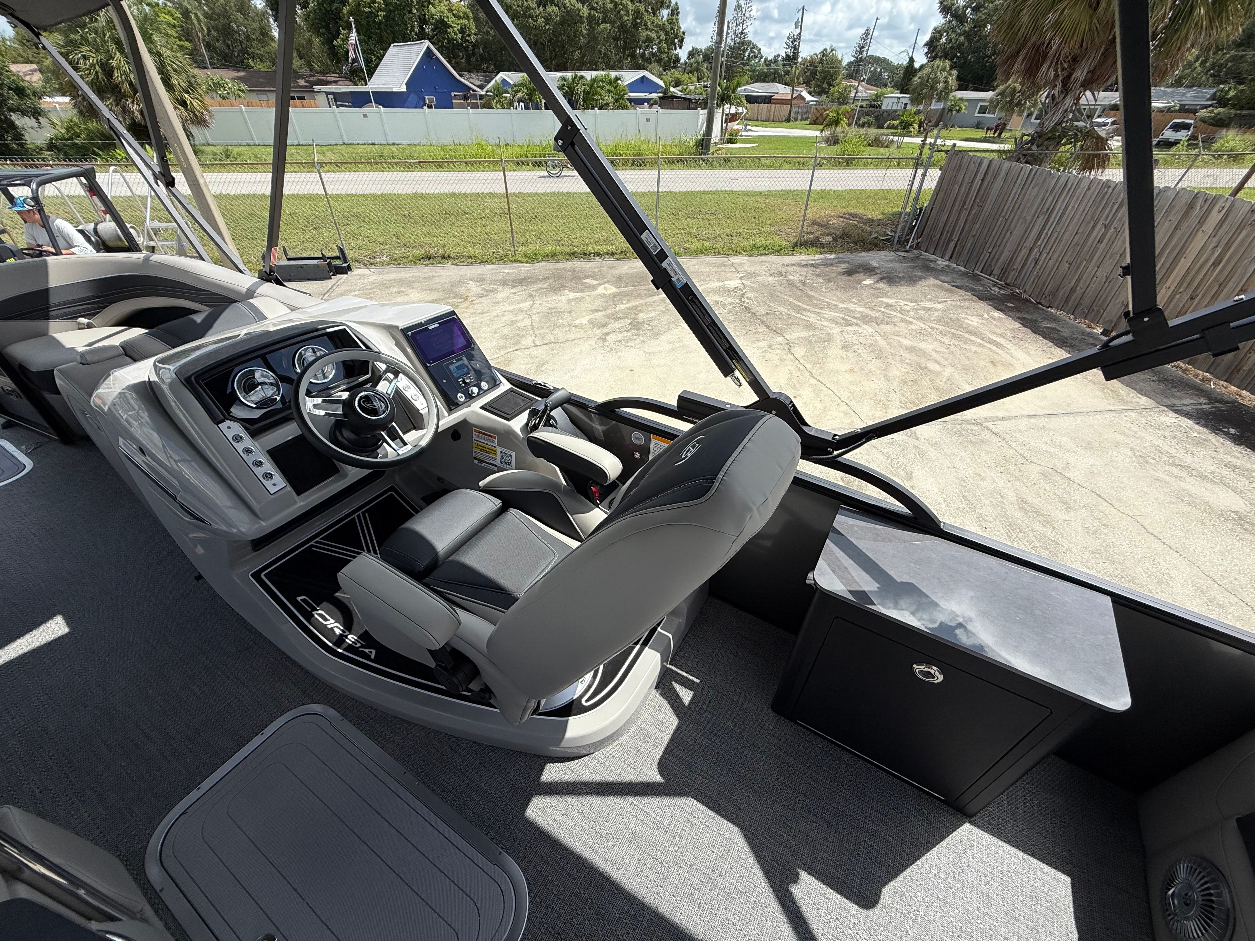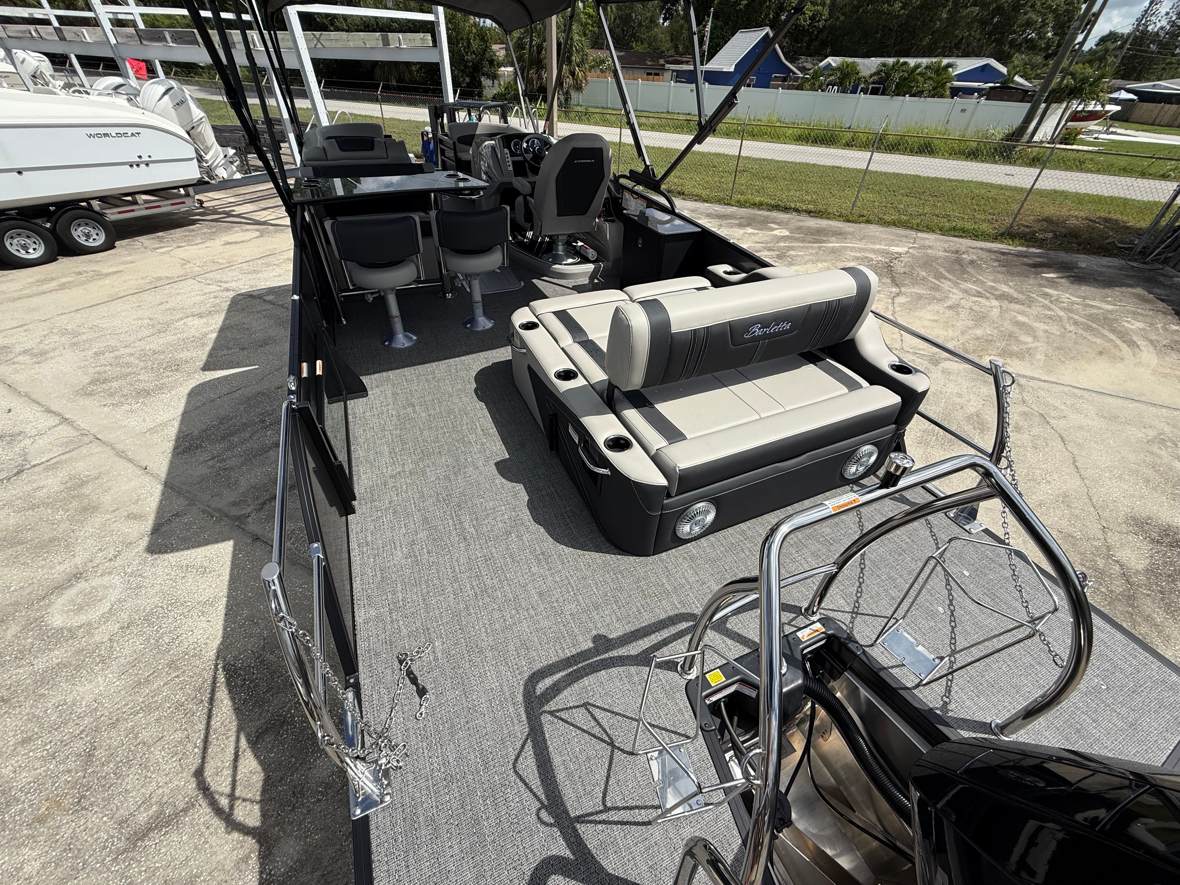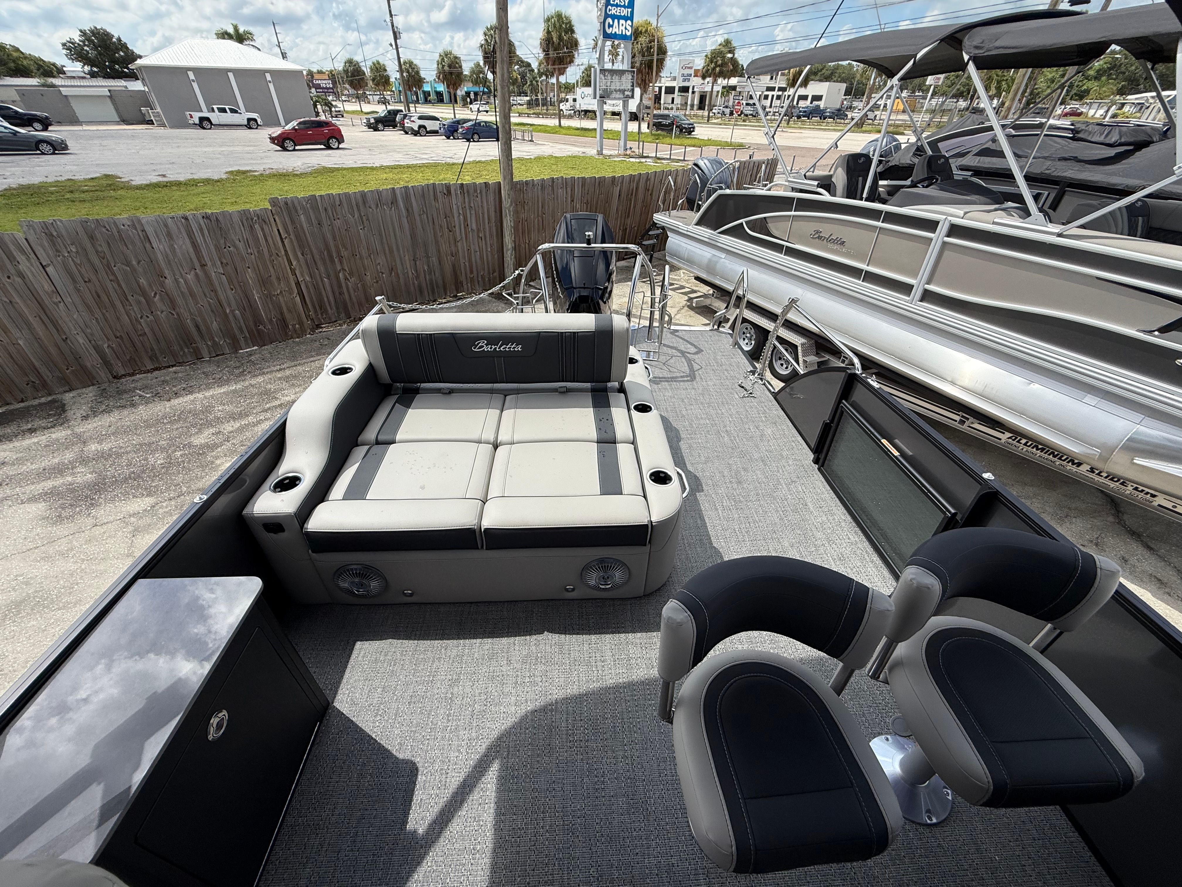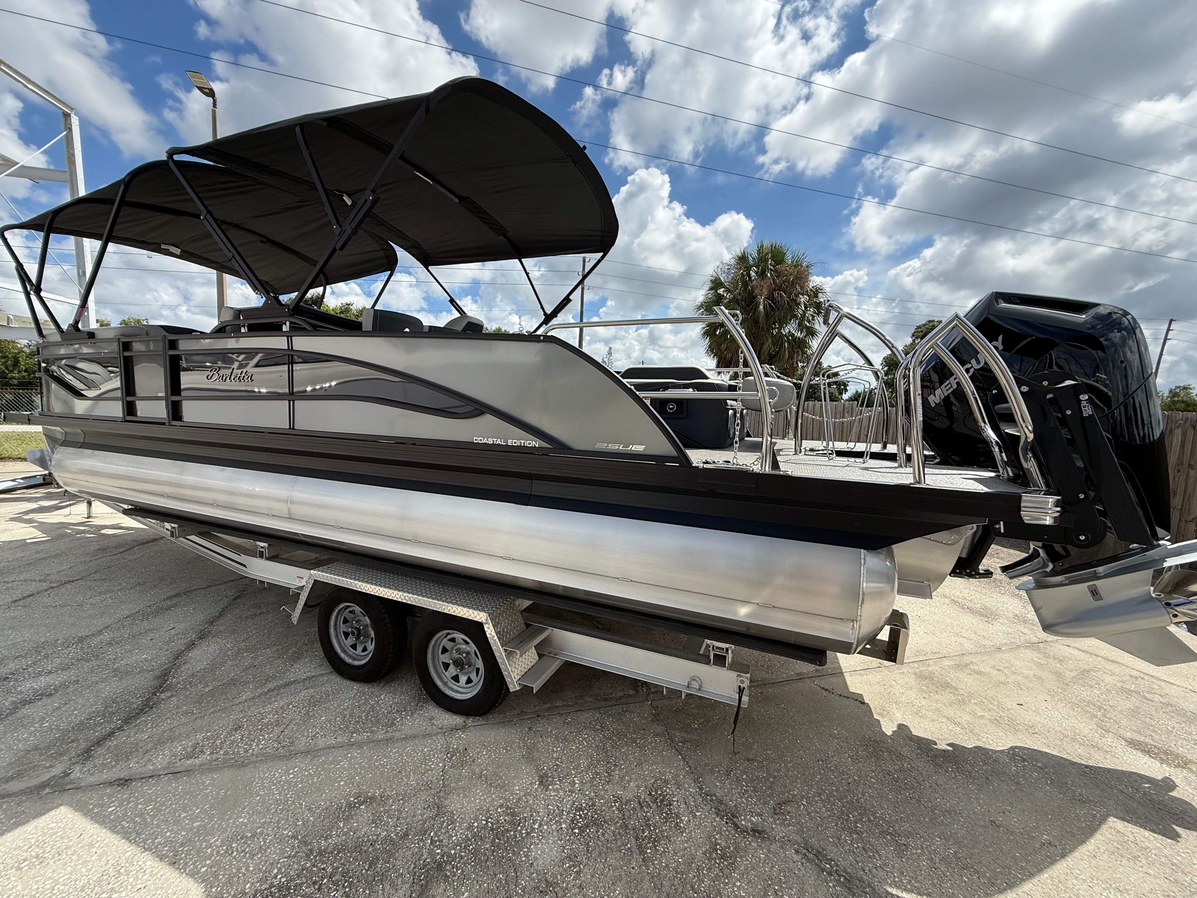 In summary, the 2026 Barletta Corsa 25UE is a premier pontoon boat for sale that combines cutting-edge design, luxurious comfort, and outstanding performance. With its striking Gray Moonstone and Black Diamond color scheme, Blackout Package Corsa, plush Soft Touch Marquesan Gray furniture, Amore Gray flooring, and the powerful Mercury (D) 350L V10 Verado engine, this Barletta boat for sale is truly in a class of its own. The Coastal Edition Corsa and double bimini add to its versatility and appeal, making it the ultimate choice for those who demand the best from their boating experience.If you are ready to elevate your time on the water and create lasting memories with family and friends, the Barletta Corsa 25UE is waiting for you. Discover the joy of owning a pontoon that delivers on every promise—style, comfort, performance, and fun. Contact your local dealer today to learn more about this exceptional pontoon and take the first step toward your next great adventure.
