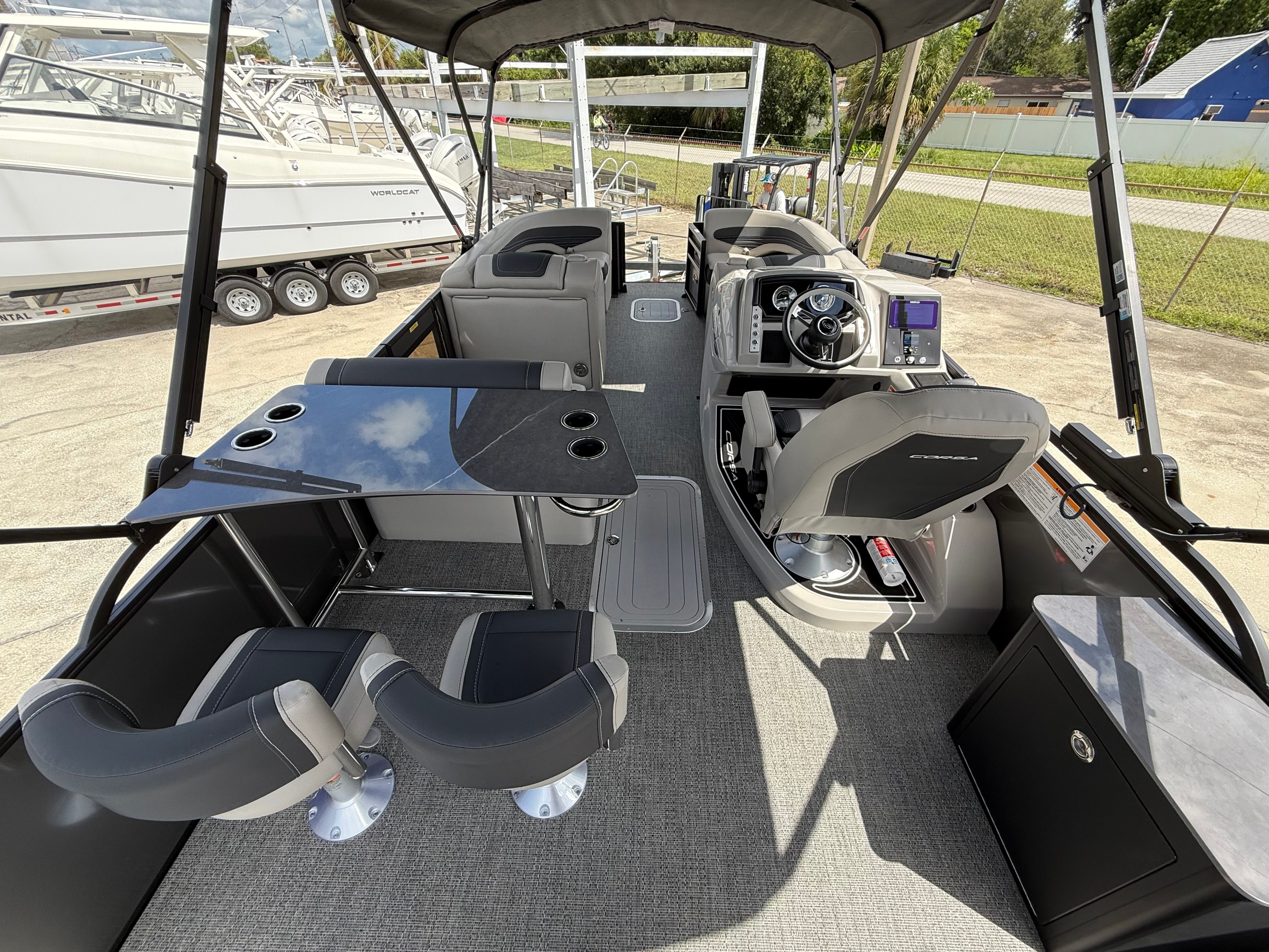 Step aboard the Corsa 25UE and immerse yourself in a world of comfort and sophistication. The furniture features Soft Touch Marquesan Gray upholstery with Carbon Accent, providing plush seating and a refined aesthetic. The flooring, finished in Amore Gray, adds a touch of elegance while offering durability and easy maintenance. The Coastal Edition Corsa package ensures this pontoon is ready for a variety of environments, enhancing its versatility and appeal.One of the standout features is the Double Bimini, which includes an additional power bimini for superior shade and protection from the sun. This thoughtful addition ensures that you and your guests can relax in comfort, no matter how bright the day gets. Every detail, from the color accents to the high-quality materials, has been carefully selected to create a welcoming and stylish environment on board.