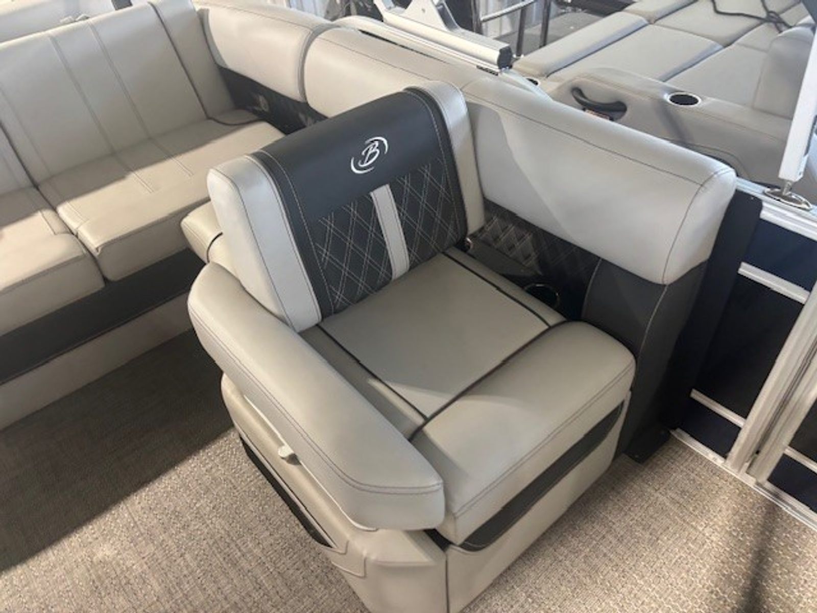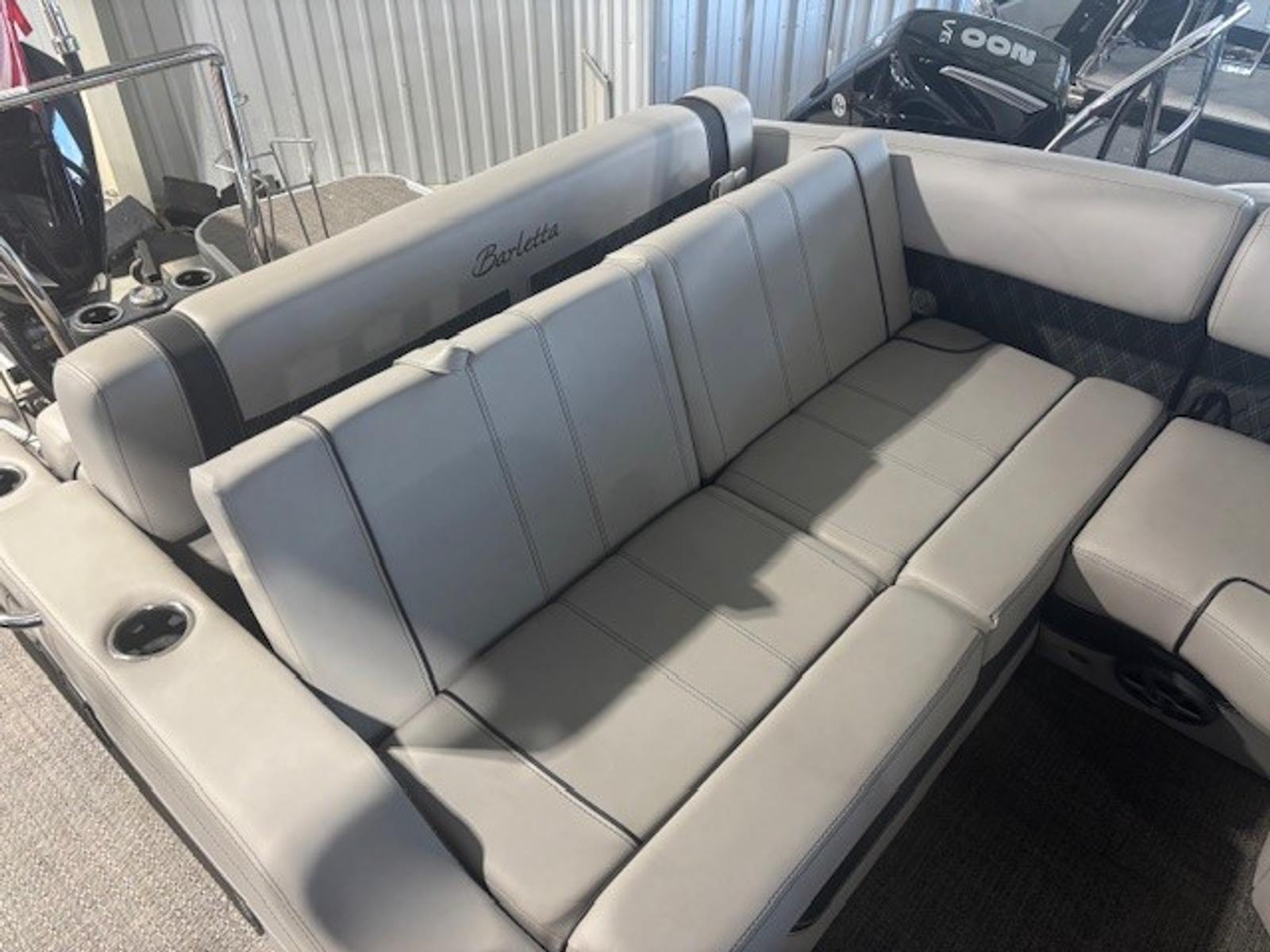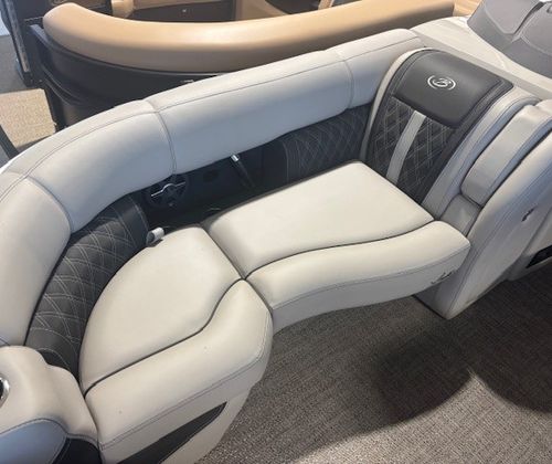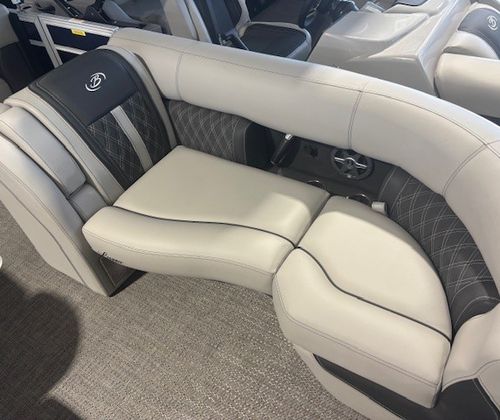 Step aboard the Barletta Lusso L23U and experience a world of comfort and luxury. The Marquesan Gray furniture with Charcoal Accent creates a refined and inviting atmosphere, perfectly complemented by the Amore Gray flooring. White underdeck and underwater exterior lighting add a touch of elegance and enhance visibility during evening outings. The combination of high-quality materials and meticulous attention to detail ensures that every moment spent on this pontoon is enjoyable and relaxing. The Lusso L23U’s layout is designed to maximize space and comfort, making it ideal for socializing, lounging, or enjoying a meal on the water.