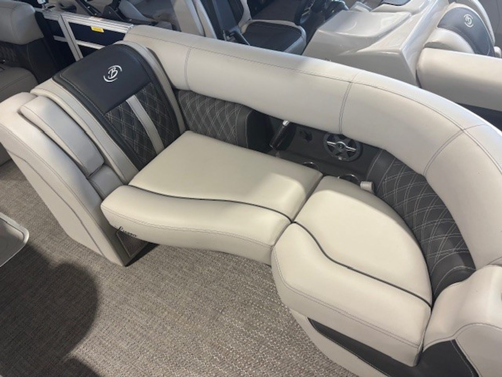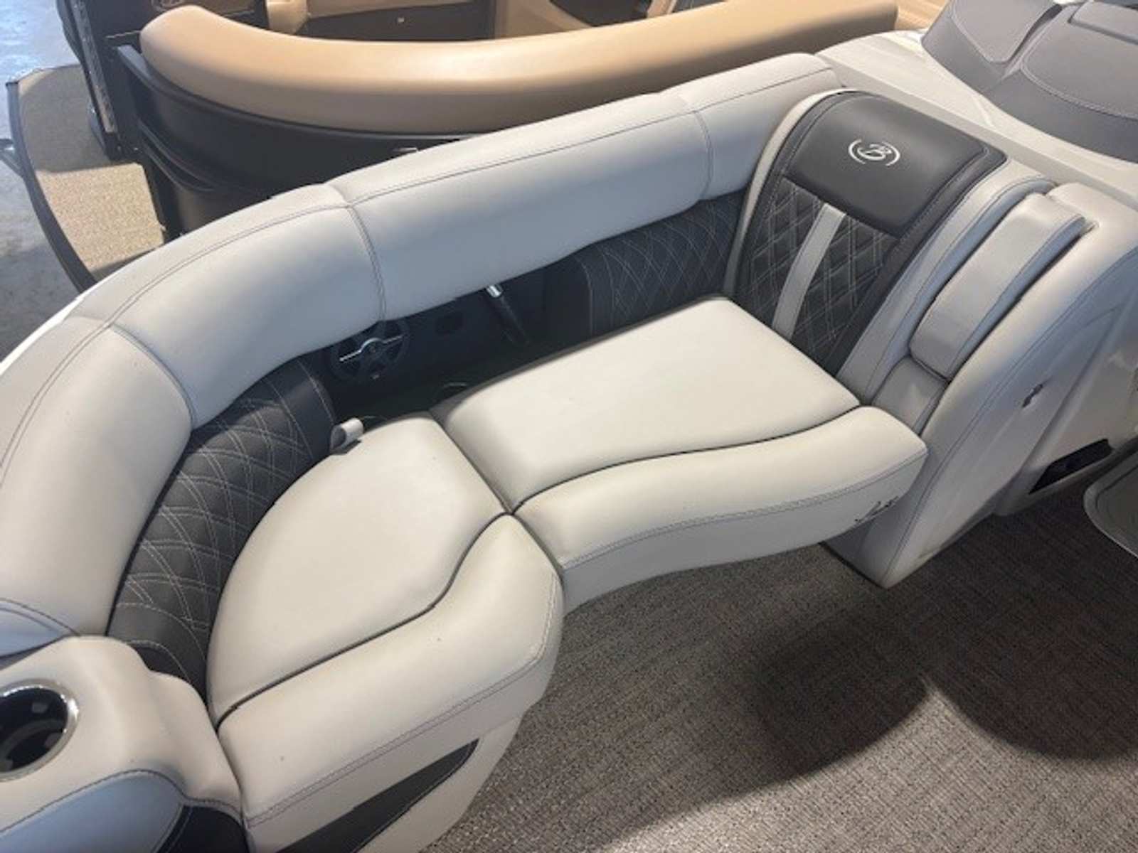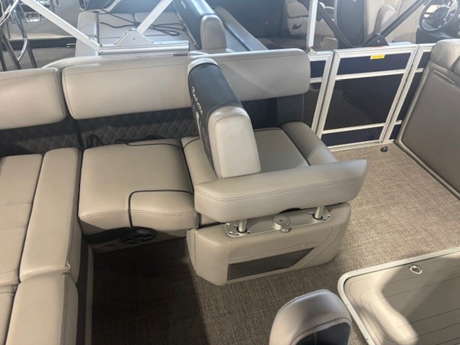 Step aboard the Barletta Lusso L23U and experience a world of comfort and luxury. The Marquesan Gray furniture with Charcoal Accent creates a refined and inviting atmosphere, perfectly complemented by the Amore Gray flooring. White underdeck and underwater exterior lighting add a touch of elegance and enhance visibility during evening outings. The combination of high-quality materials and meticulous attention to detail ensures that every moment spent on this pontoon is enjoyable and relaxing. The Lusso L23U’s layout is designed to maximize space and comfort, making it ideal for socializing, lounging, or enjoying a meal on the water.