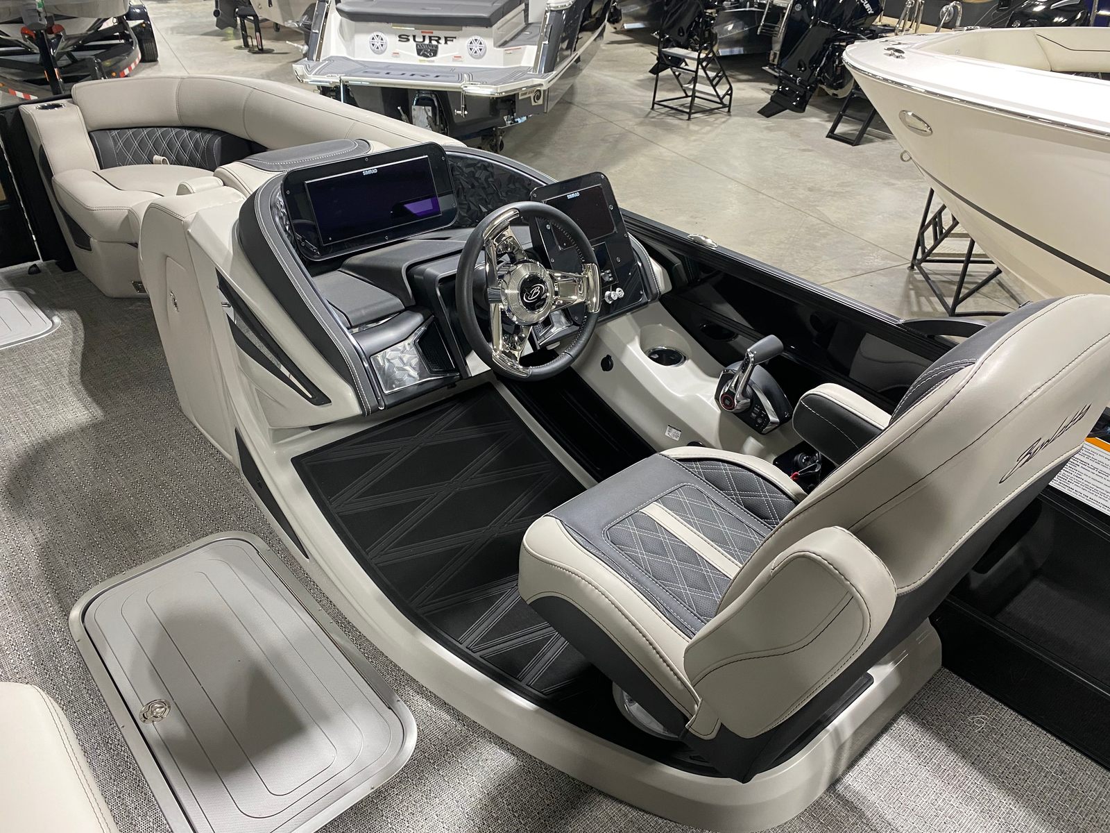 Powering the Barletta Lusso L23U is a robust Mercury 250L Verado V8 engine, delivering an impressive 250 horsepower. This single-engine setup ensures smooth acceleration, reliable cruising, and plenty of power for water sports or long-distance excursions. The Mercury Digital DTS Pre-Rig for VERADO engines with Vessel Link provides seamless digital throttle and shift control, enhancing responsiveness and ease of operation. Hydraulic and power assist steering further contribute to effortless maneuverability, allowing you to navigate tight spaces or open water with confidence. With the Lusso L23U, you’ll enjoy a pontoon boat that combines exhilarating performance with refined handling.