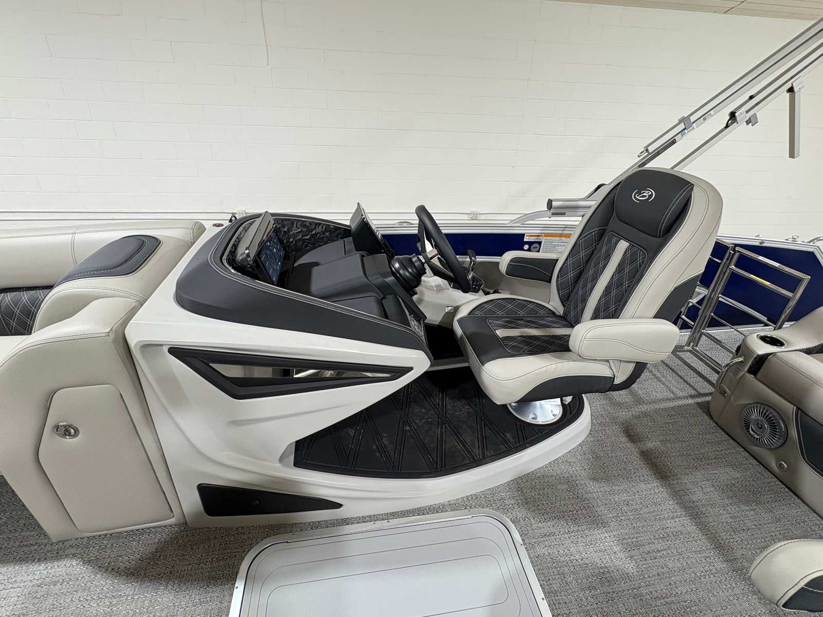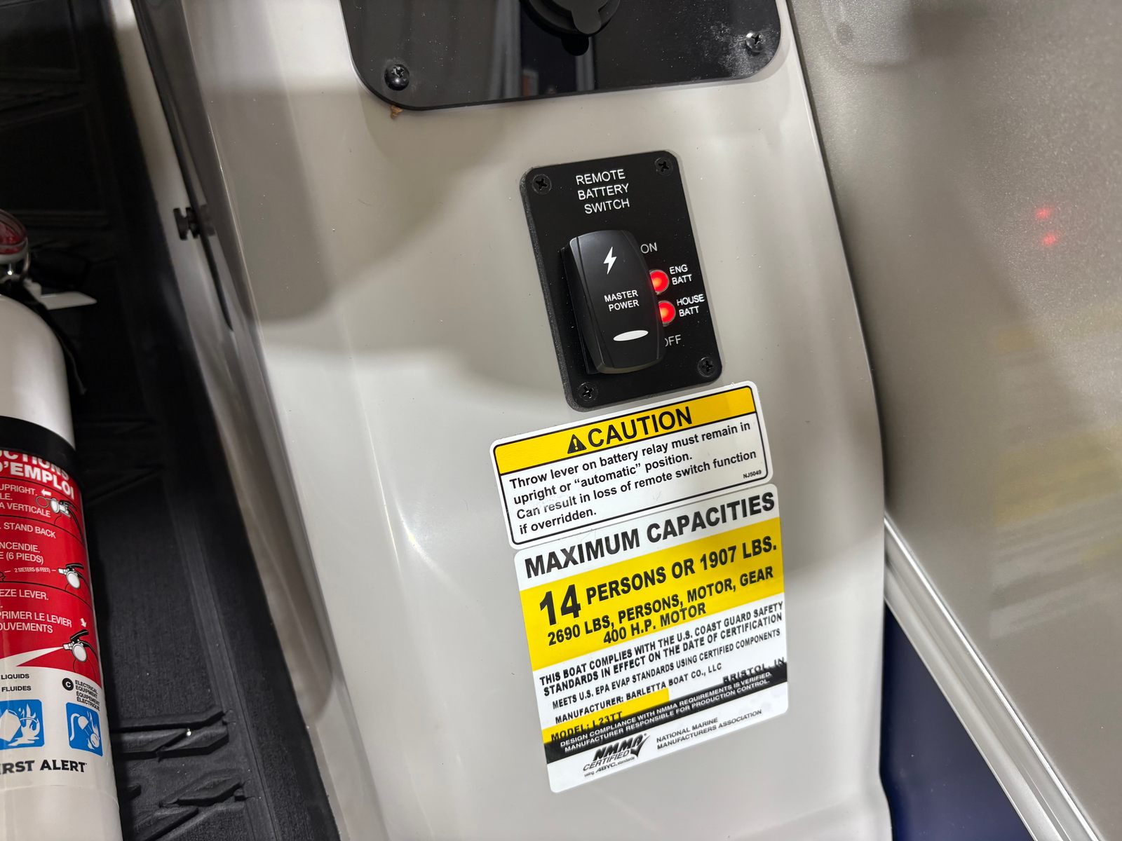 Practicality meets pleasure in the Barletta Lusso L23UC. The hydraulic and power assist steering simplifies docking and maneuvering, even for novice boaters. The digital gauges and Vessel Link system keep you informed and in control, while the on-board battery charger ensures your electronics are always ready for use. The sturdy stainless steel safety stanchions with chains provide peace of mind, especially when children or pets are on board.Storage solutions are integrated throughout the boat, making it easy to stow gear, snacks, and personal items without cluttering the deck. The durable flooring and high-quality furniture are designed to withstand the rigors of active use while maintaining their luxurious appearance. Fuel efficiency is enhanced by the advanced Mercury engine and stainless steel prop, allowing you to spend more time enjoying the water and less time refueling.