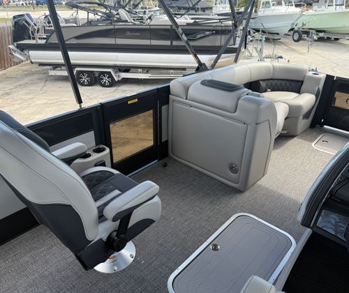 Step aboard the Barletta Lusso L23UC and immerse yourself in a world of comfort and elegance. The Blackout Package Lusso adds a touch of sophistication, enhancing the boat’s modern appeal. The furniture, finished in Marquesan Gray/Onyx, offers plush seating and ergonomic design, ensuring every passenger enjoys maximum comfort. The Amore Gray flooring provides a stylish and practical foundation, resistant to wear and easy to maintain.This pontoon is part of the exclusive Coastal Edition Lusso, tailored for those who appreciate both luxury and resilience in their watercraft. The double bimini setup, including an additional power bimini, delivers versatile shade options, allowing you to customize your onboard environment for sun-soaked days or cool, relaxing afternoons. Digital gauges keep you informed and in control, while the Mercury Digital DTS Pre-Rig and Vessel Link system streamline engine management for a truly modern boating experience.