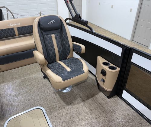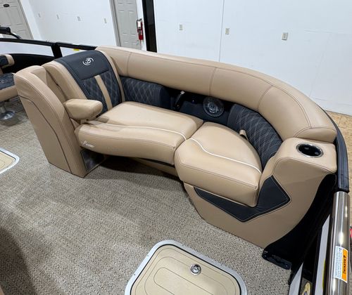 The 2026 Barletta Lusso L23UC stands out as a new pontoon boat that measures an impressive 25.5 feet in length, offering ample space for family, friends, and all your favorite water activities. Its sleek profile is accentuated by a Winter White sweep color and Matte Black accent, creating a striking presence whether docked or cruising across the lake. The Blackout Package Lusso adds a touch of modern elegance, while the Carmella Tan with Onyx furniture and Amore Tan flooring provide a warm, inviting atmosphere for every guest on board. Every detail of this pontoon is crafted to deliver both visual appeal and practical comfort, ensuring that every moment spent on the water is truly unforgettable.