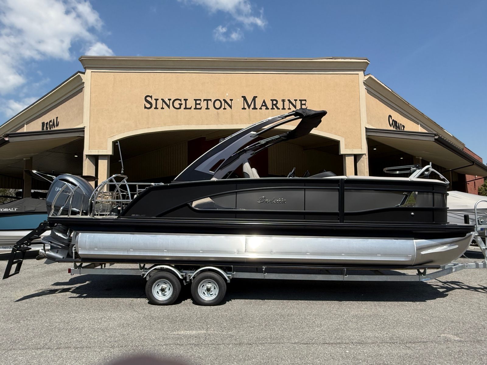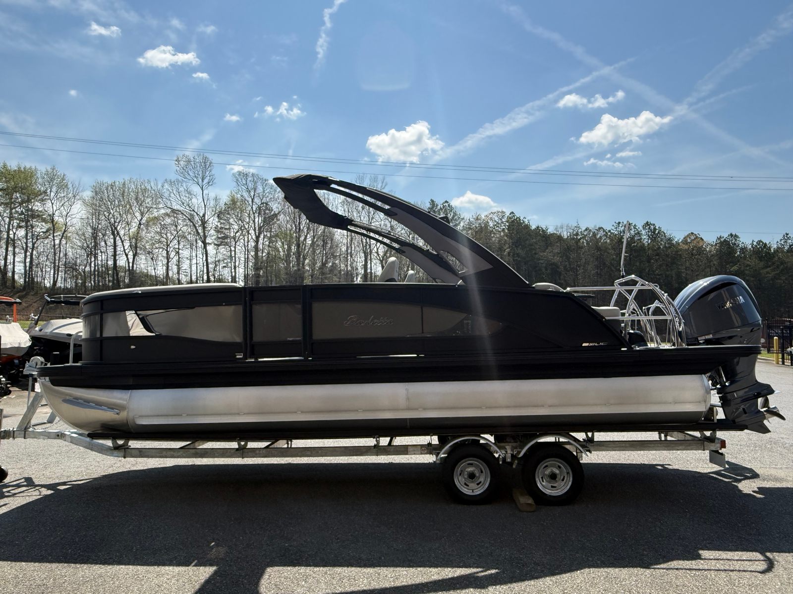 The 2026 Barletta Lusso L23UCA is a premium pontoon boat that stretches an impressive 25.5 feet in length, providing ample space for family, friends, and all your favorite water activities. As a new pontoon boat for sale, this Barletta model showcases the brand’s commitment to quality, innovation, and sophisticated design. The Lusso L23UCA’s sleek profile is accentuated by its Matte Black sweep color and Gray Moonstone accent, giving it a modern and commanding presence on the water. The Lusso Blackout Package adds a touch of exclusivity, ensuring you’ll turn heads wherever you cruise.