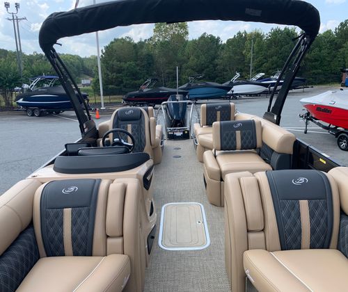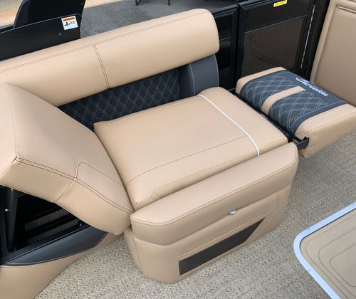 Step aboard the Lusso L25M and you’ll immediately notice the attention to detail in every aspect of its design. The Carmella Tan furniture with Onyx accents creates a warm, inviting atmosphere, perfectly complemented by the Amore Tan flooring. These premium materials not only enhance the boat’s aesthetic appeal but also provide lasting durability and comfort for all your guests.The Lusso L25M is equipped with a Sport Bimini canvas, installed in place of the standard bimini, offering superior shade and protection from the sun while maintaining a sporty, streamlined look. Exterior lighting, including white underdeck and underwater lights, adds a touch of elegance and ensures visibility during evening cruises or nighttime gatherings. The 2-bank battery charger keeps your electrical systems powered and ready for action, so you can focus on enjoying your time on the water.