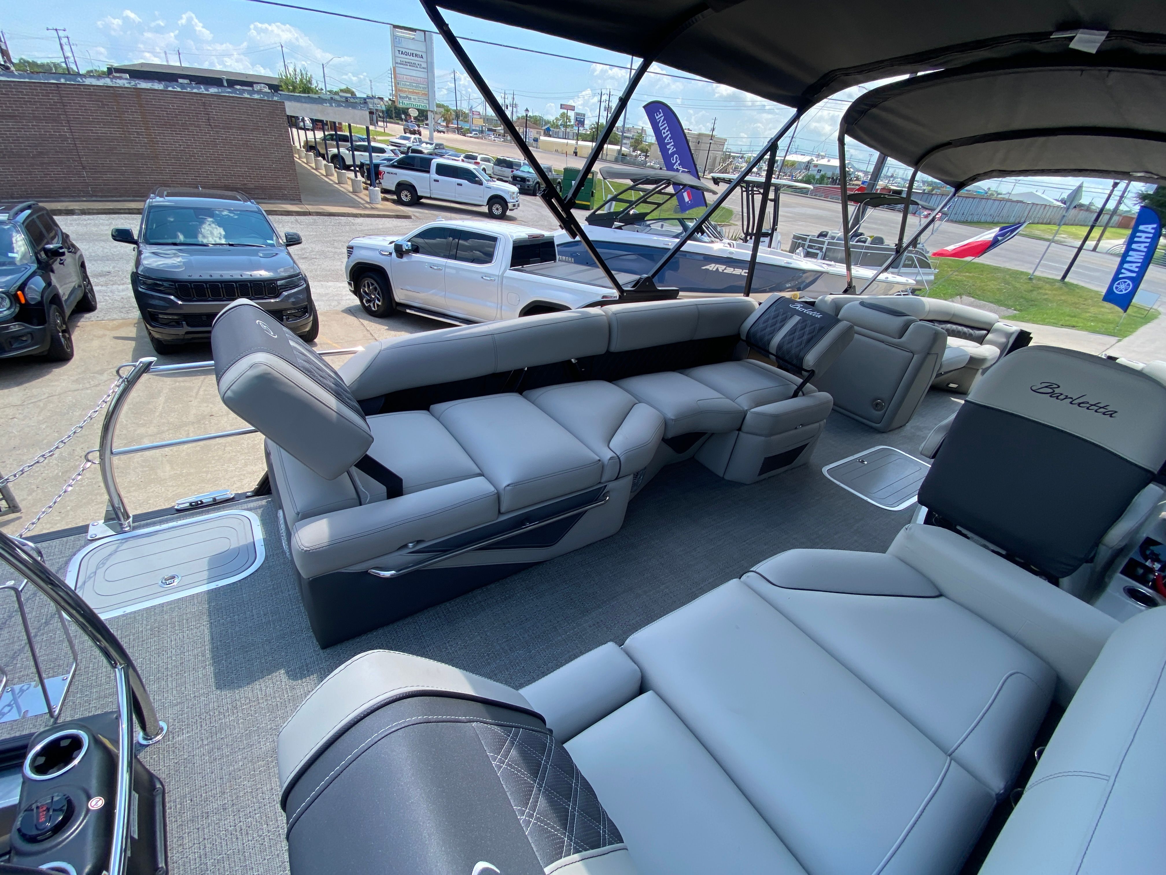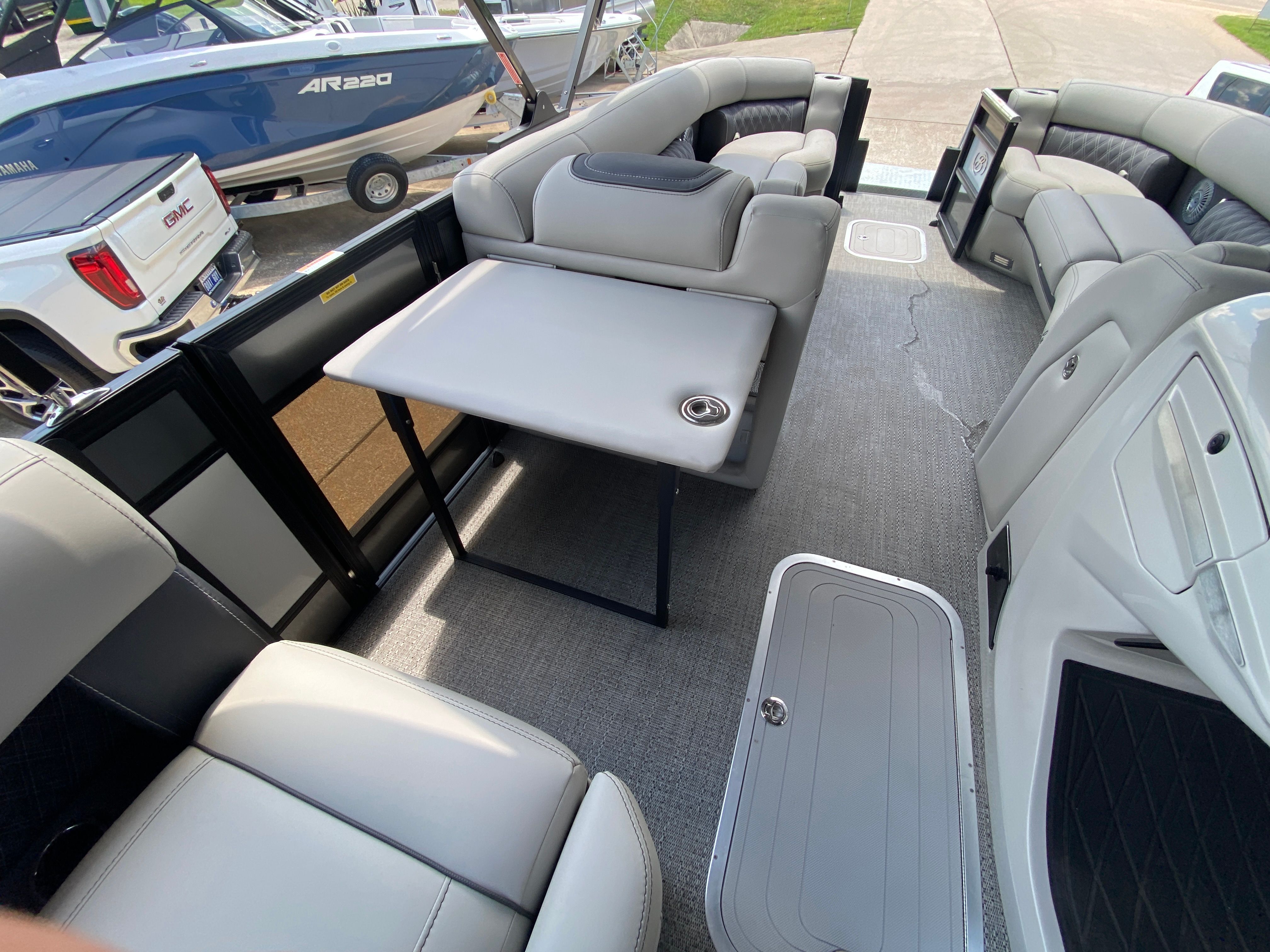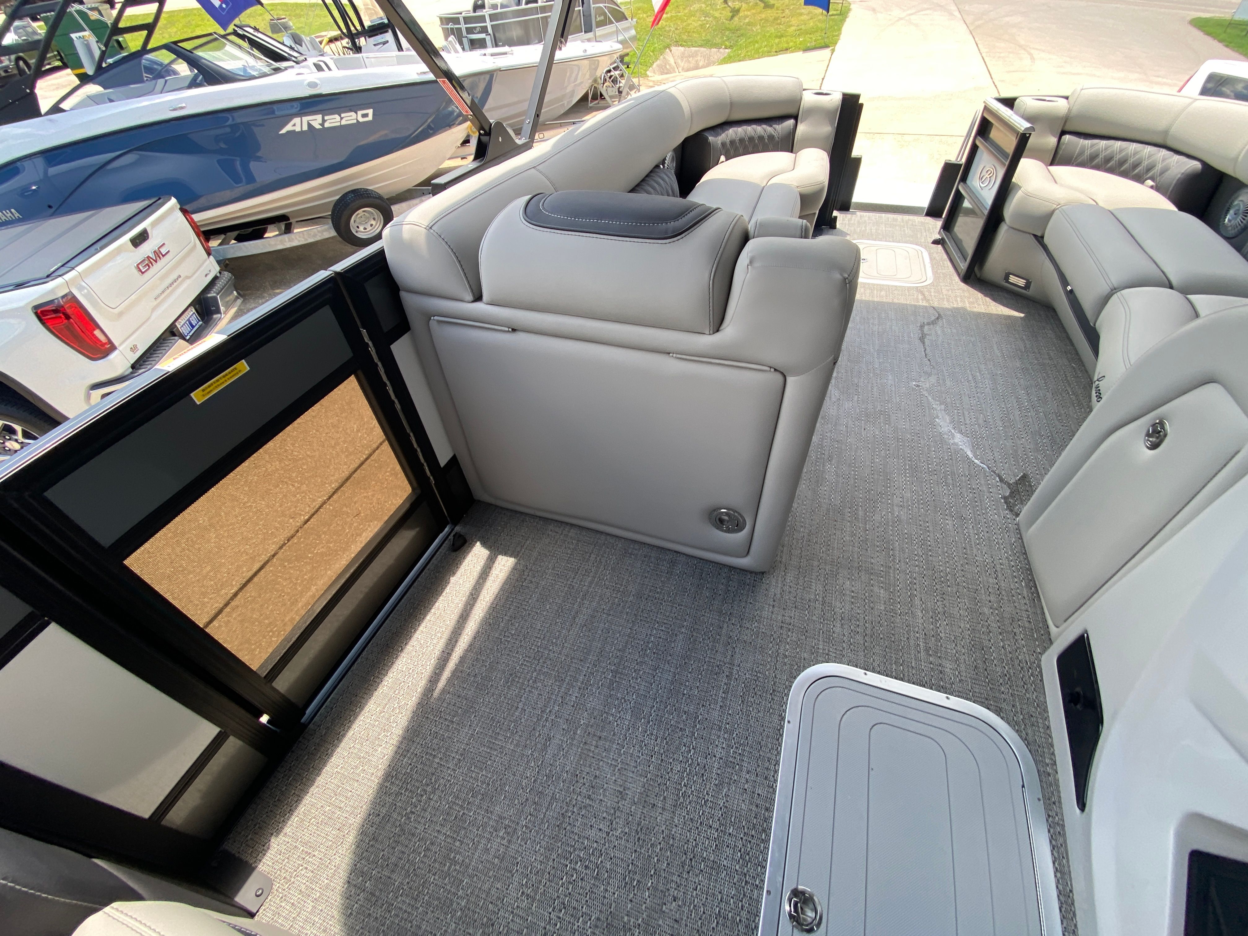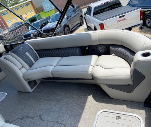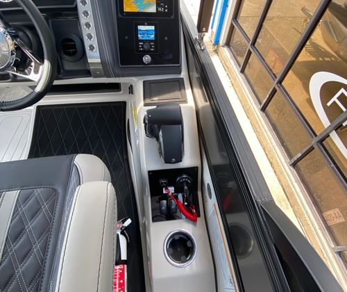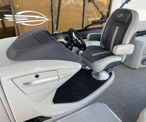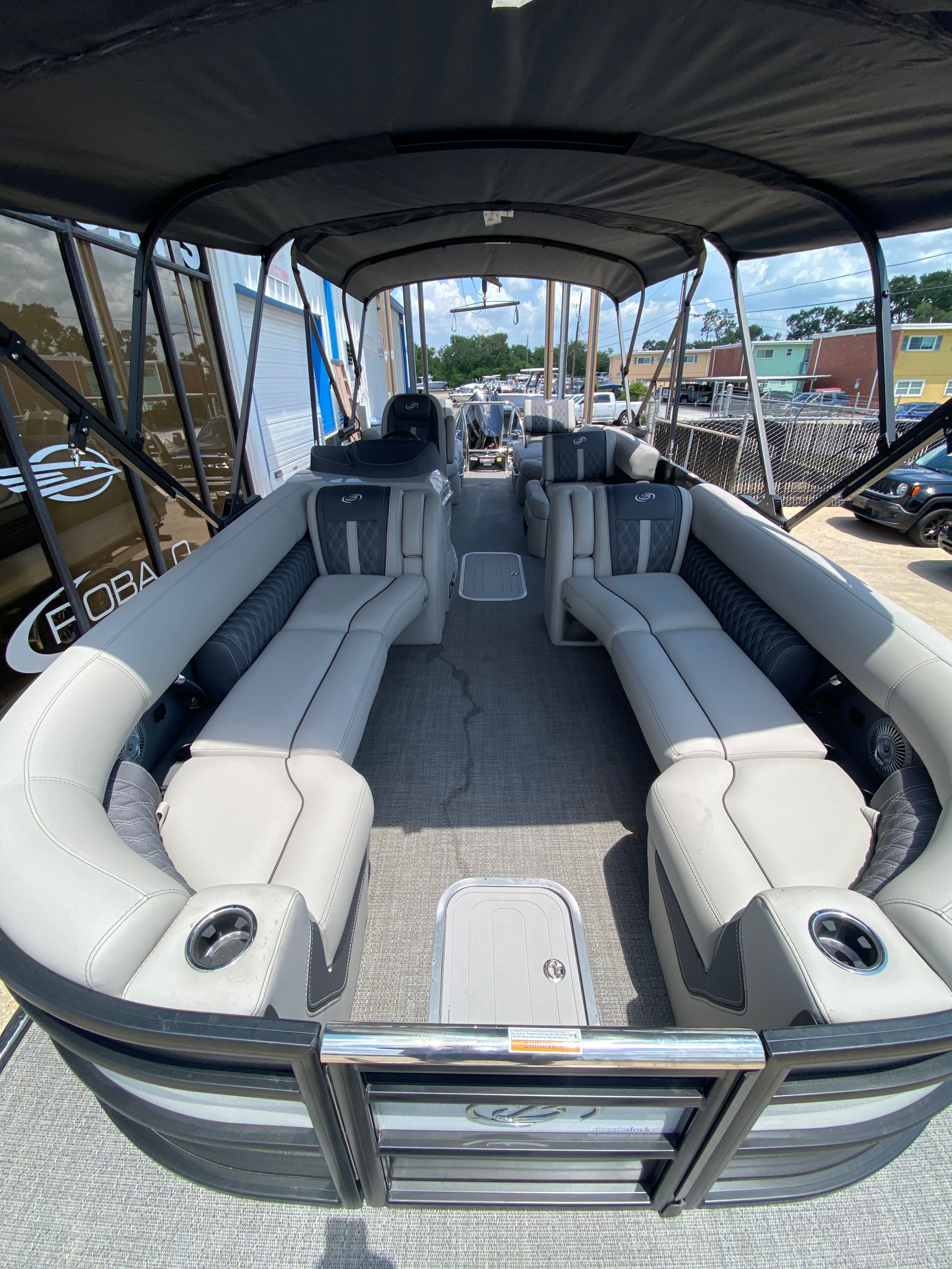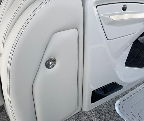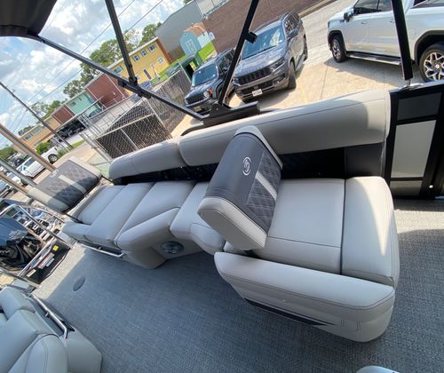 Practicality meets luxury in the Barletta Lusso L25M. The spacious layout makes it easy to store coolers, water toys, and other essentials, keeping the deck clutter-free and organized. The sturdy construction and protective coatings ensure that docking and undocking are hassle-free, while the efficient engine design helps you make the most of every gallon of fuel. The intuitive controls and responsive handling make this pontoon boat a pleasure to operate, whether you are a seasoned captain or a first-time owner.The table with pedestal and Yeti-ready cupholders adds convenience for meals and refreshments, while the ample seating ensures everyone has a comfortable spot to relax. The double bimini offers versatile shade coverage, making it easy to enjoy long days on the water without worrying about sun exposure. The Lusso L25M’s thoughtful design details make ownership easy and enjoyable, so you can focus on making memories with family and friends.