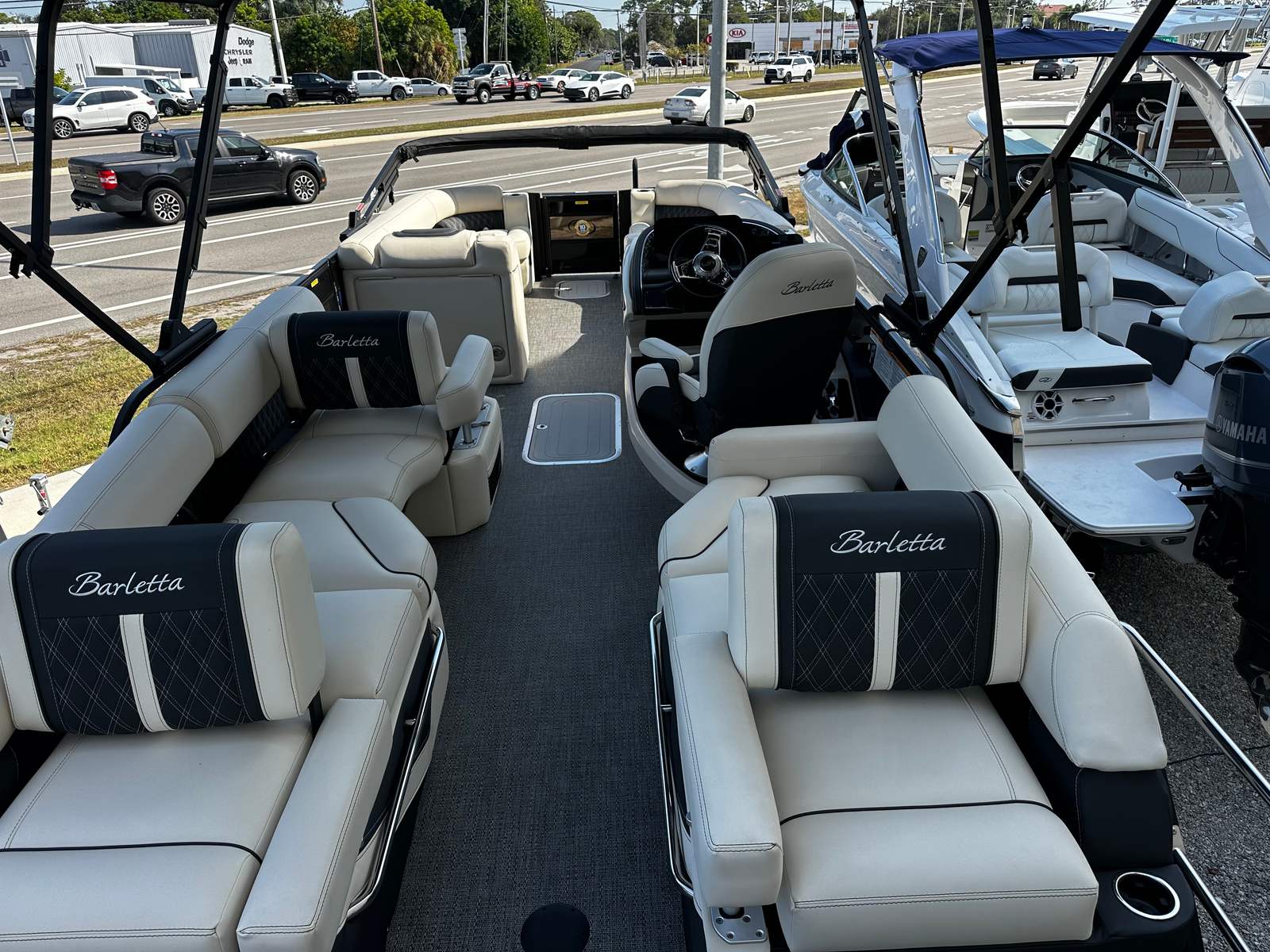 The Barletta Lusso L25M is packed with premium features that elevate your boating experience to new heights. The double bimini canvas, including an additional power bimini, offers versatile shade options, allowing you to enjoy the sun or seek shelter with ease. The exterior lighting package features white underdeck and underwater lights, creating a captivating ambiance for evening cruises and dockside gatherings. The 25-inch transom construction ensures durability and stability, while the onboard battery charger with two batteries provides reliable power for all your adventures.The Lusso L25M’s interior is designed for both style and functionality, featuring Amore Gray flooring that is both elegant and easy to maintain. The table, pedestal, and base with Yeti-ready cupholders (dealer install for customer preference) add a touch of convenience and sophistication, making it easy to enjoy snacks and drinks while on the water. The Blackout Package Lusso railskin enhances the boat’s modern aesthetic, ensuring you turn heads wherever you go.