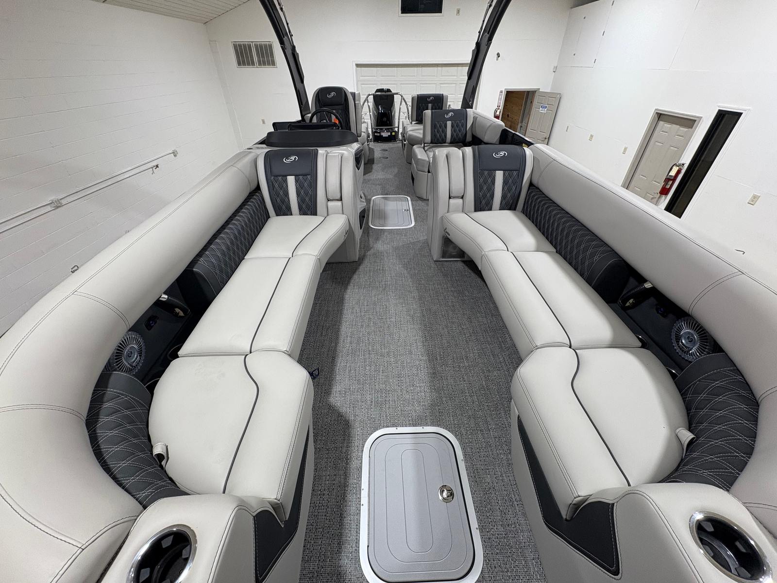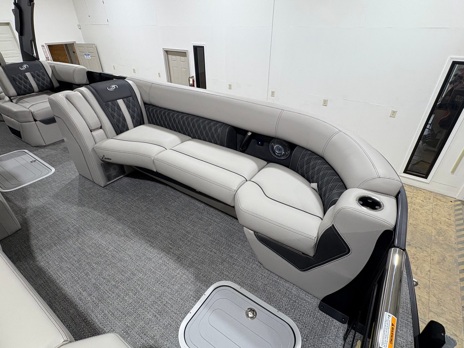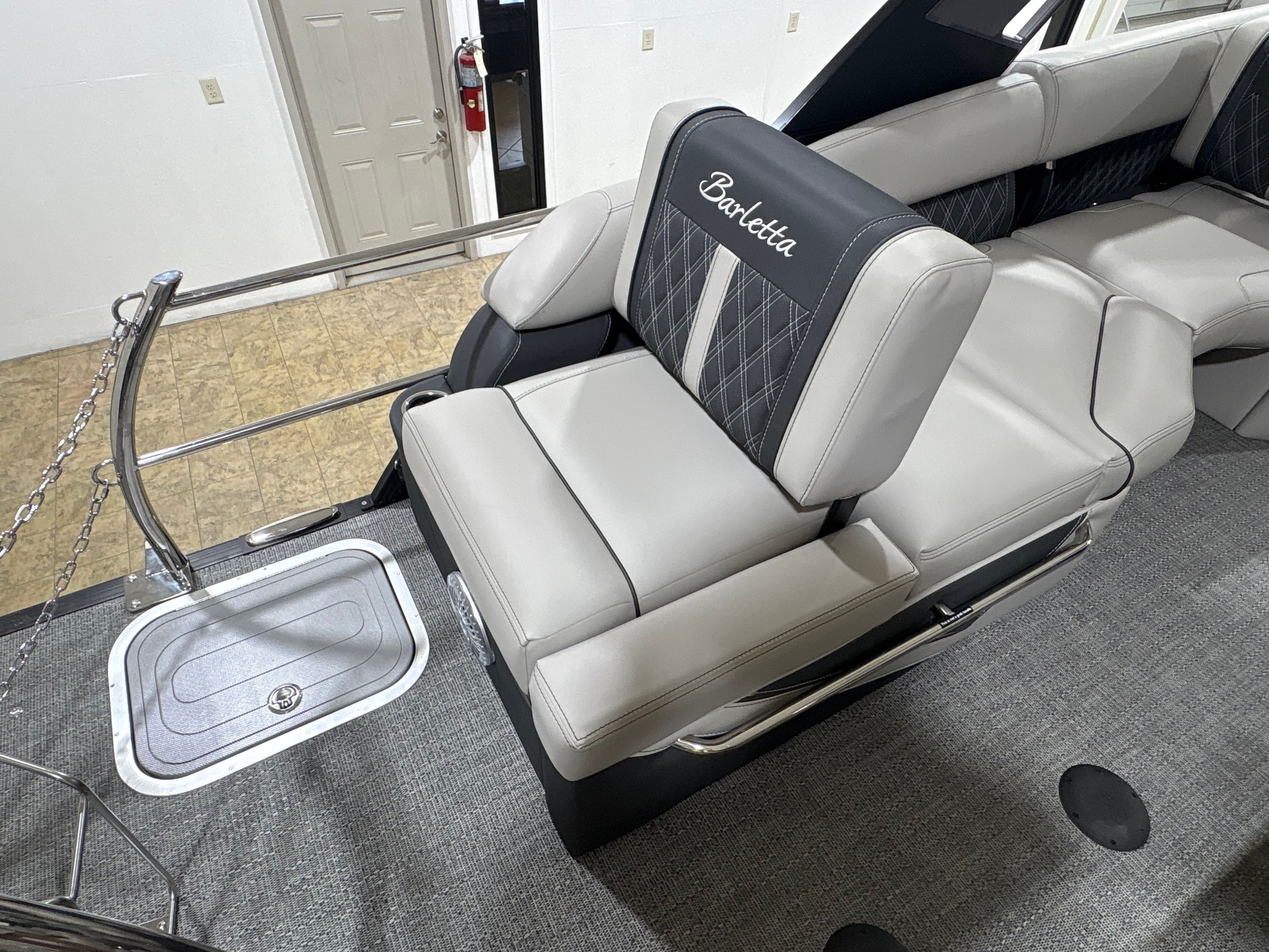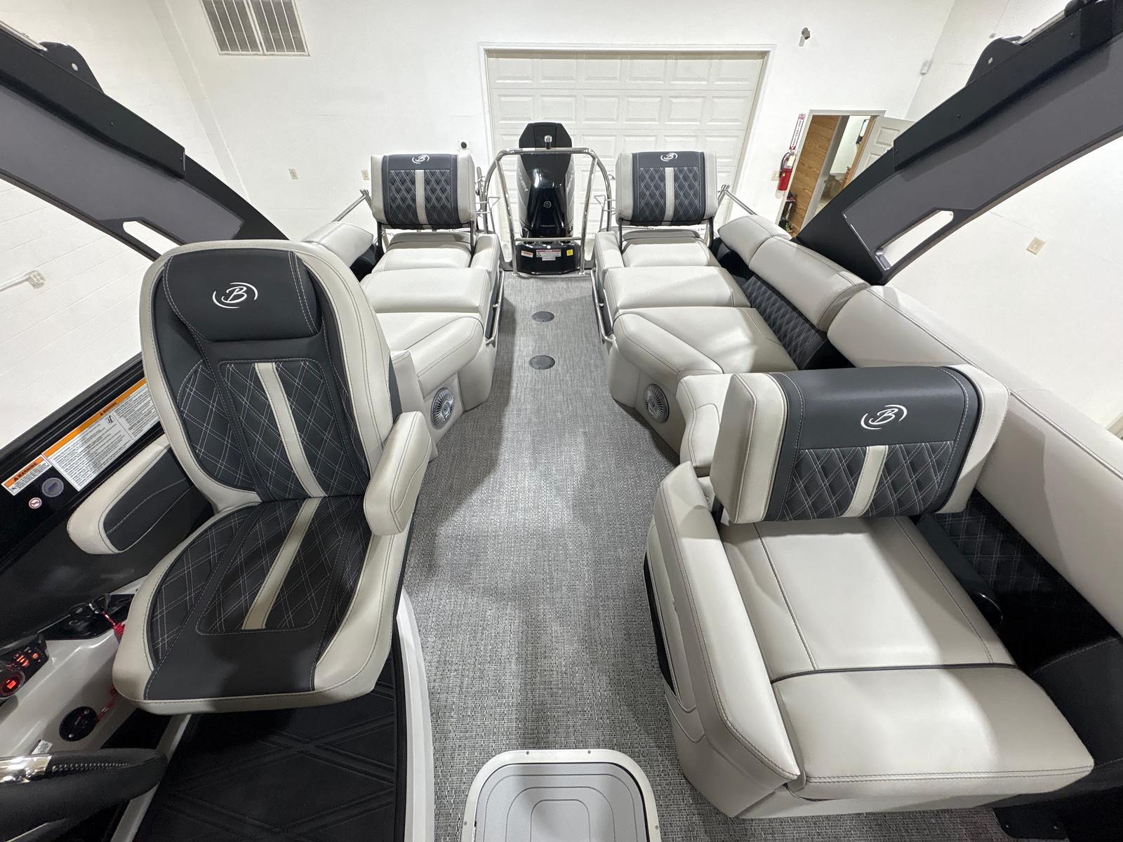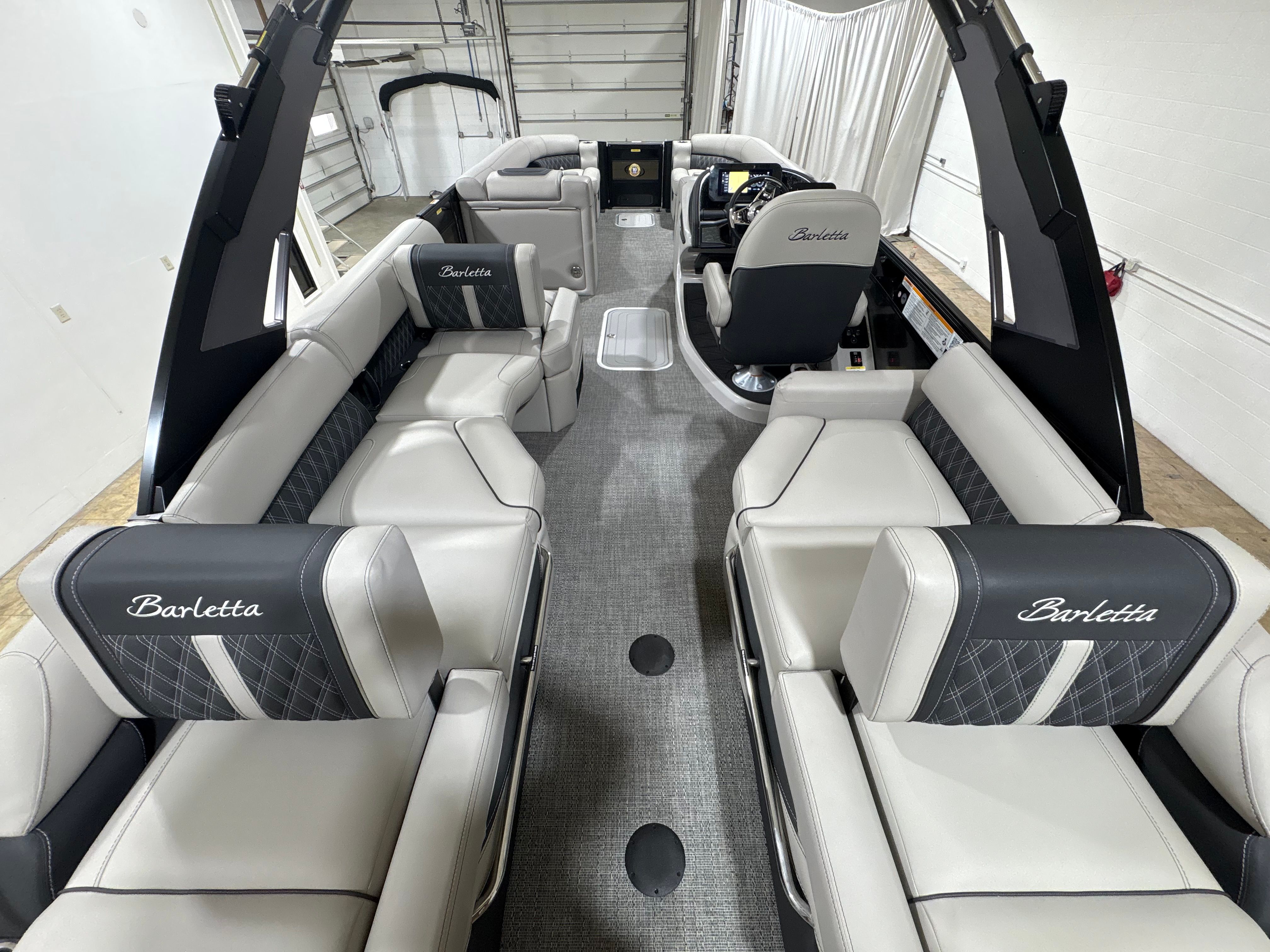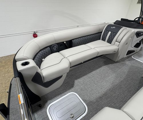 The Barletta Lusso L25MA is packed with premium features designed to elevate your boating experience. The exterior lighting, including white underdeck and underwater lights, creates a captivating ambiance for evening cruises and adds a touch of elegance to your pontoon. The Blackout Package Lusso railskin delivers a bold, modern look, while the Marquesan Gray/Onyx furniture provides plush comfort and sophisticated style. The flooring, finished in Amore Gray, is both durable and visually appealing, complementing the overall aesthetic of the boat. The accent color in Gray Moonstone and the sweep color in Black Diamond further enhance the Lusso L25MA’s striking appearance.