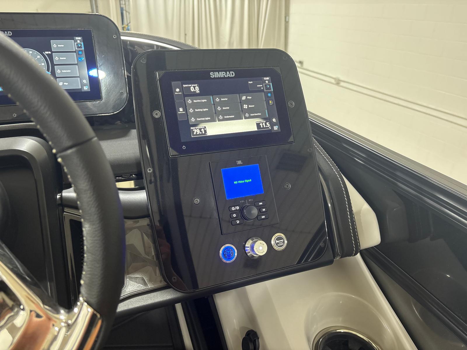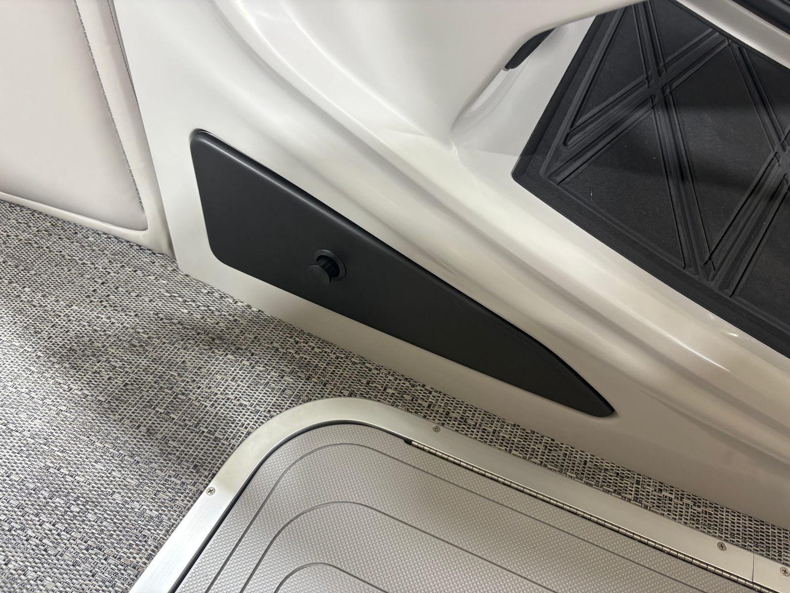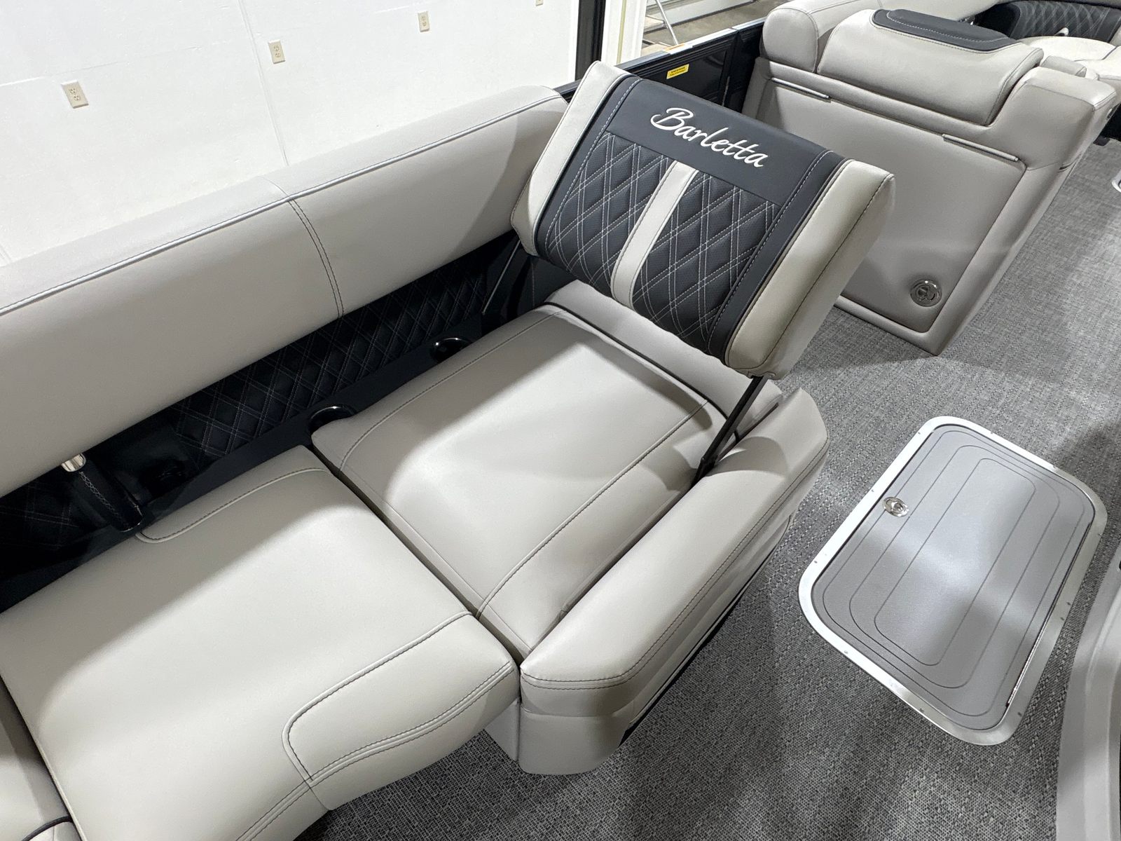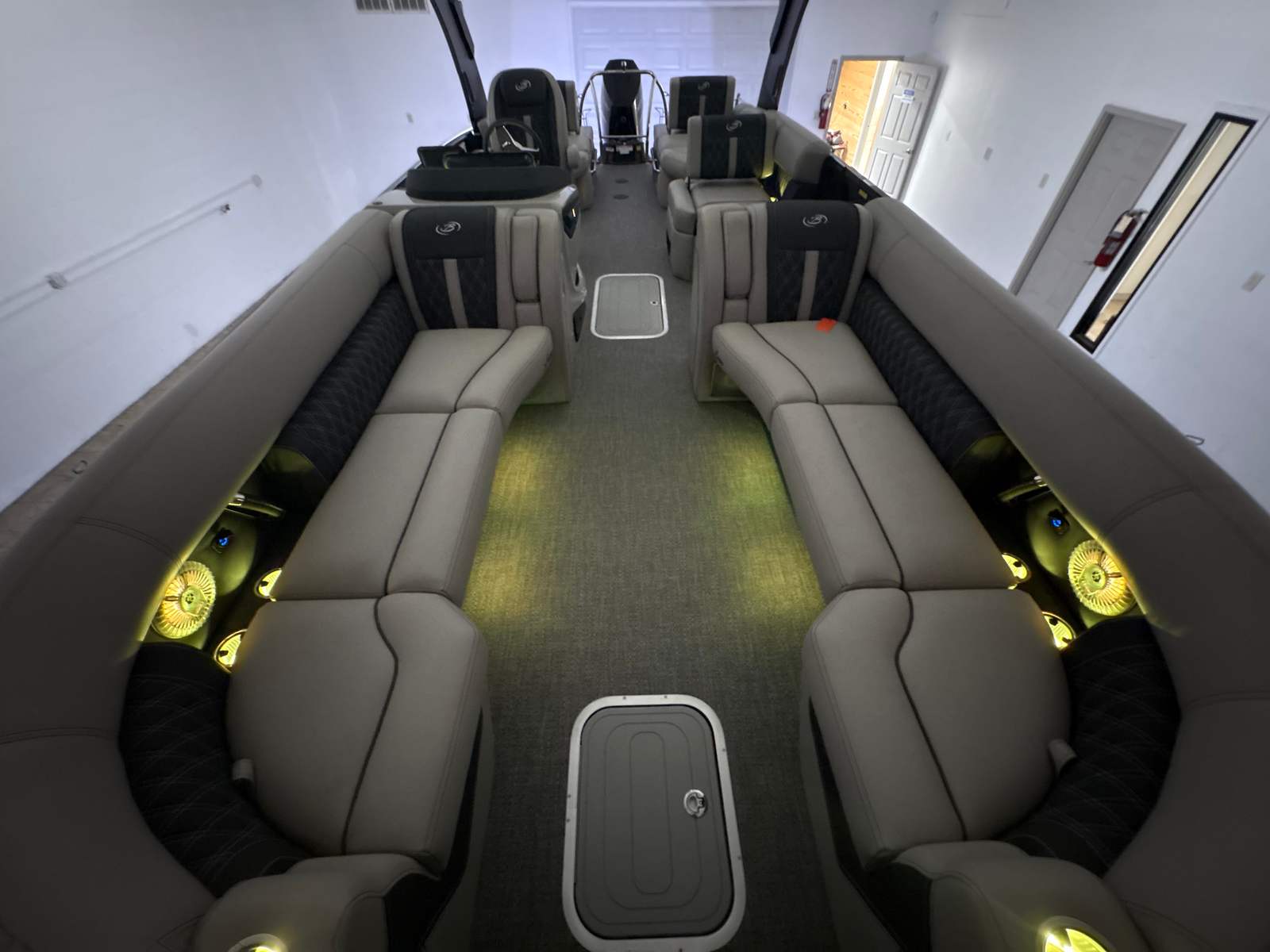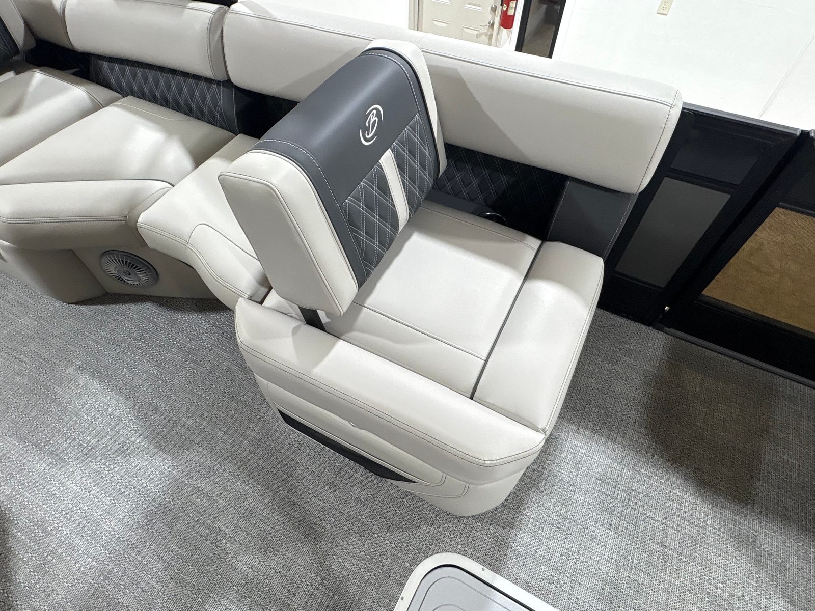 The Barletta Lusso L25MA is packed with premium features designed to elevate your boating experience. The exterior lighting, including white underdeck and underwater lights, creates a captivating ambiance for evening cruises and adds a touch of elegance to your pontoon. The Blackout Package Lusso railskin delivers a bold, modern look, while the Marquesan Gray/Onyx furniture provides plush comfort and sophisticated style. The flooring, finished in Amore Gray, is both durable and visually appealing, complementing the overall aesthetic of the boat. The accent color in Gray Moonstone and the sweep color in Black Diamond further enhance the Lusso L25MA’s striking appearance.