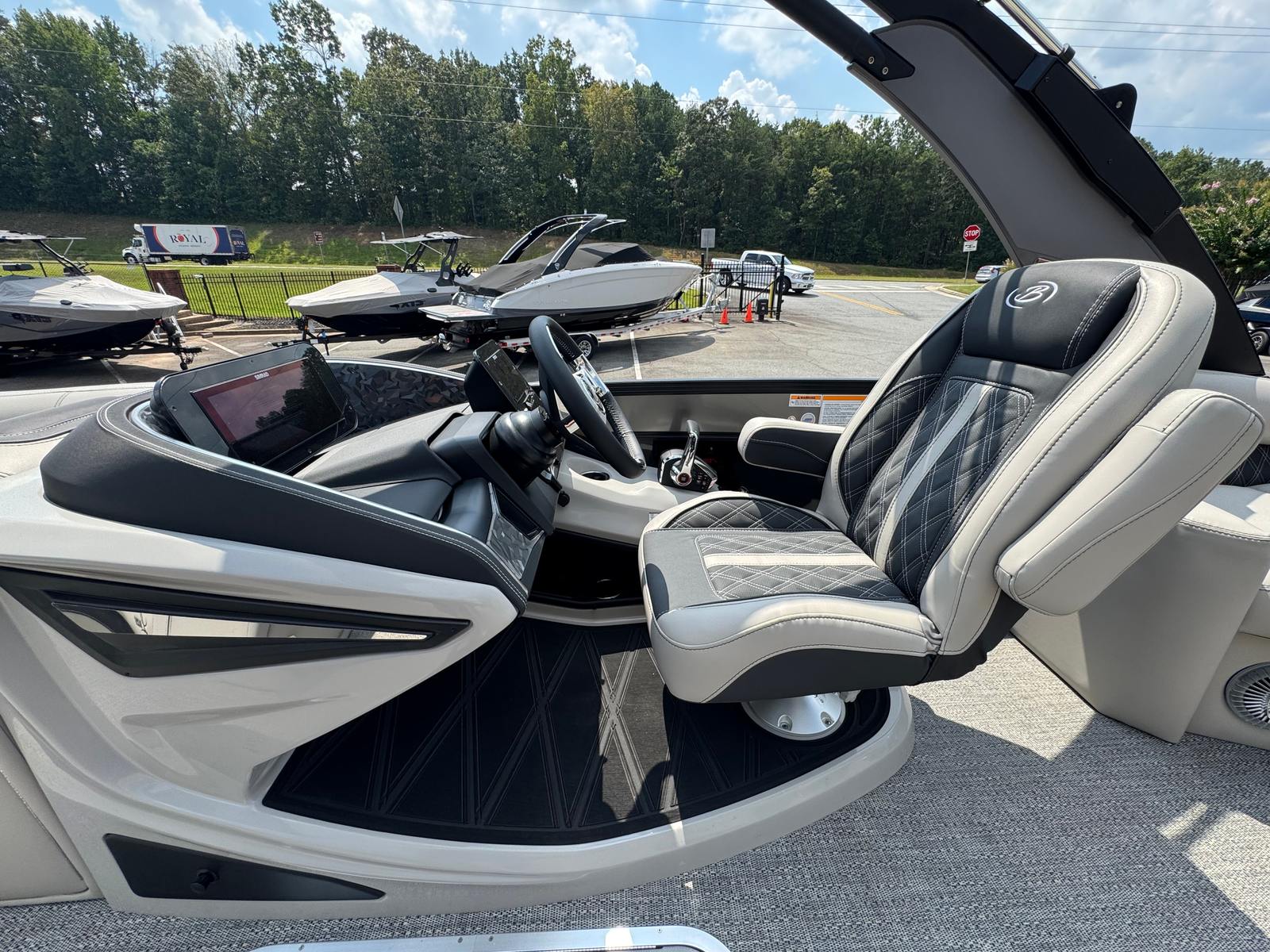 At the heart of the Barletta Lusso L25MA is a powerful Mercury 400L V10 Verado engine, delivering an impressive 400 horsepower. This single-engine setup is expertly rigged with a V10 prop, ensuring smooth acceleration, responsive handling, and exhilarating top speeds. The Mercury Digital Pre-Rig for V10 guarantees seamless integration and optimal performance, allowing you to enjoy every moment on the water with confidence. Whether you are cruising at a leisurely pace or powering across open water, the Lusso L25MA offers a thrilling and reliable ride that sets it apart from other pontoon boats for sale.