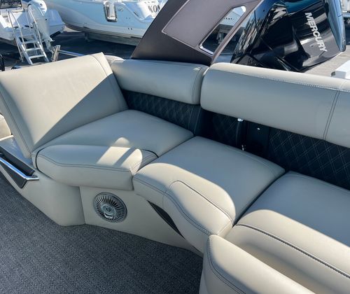 Owning the Barletta Lusso L25MAT means embracing a lifestyle of fun, relaxation, and social connection. This pontoon boat for sale is designed with comfort and enjoyment in mind, offering spacious seating areas perfect for lounging, entertaining, or soaking up the sun. The high-performance twin Mercury engines provide the thrill of speed and the confidence of reliable power, while the advanced rigging and pre-rig systems ensure hassle-free operation. The double bimini arches offer flexible shade, making it easy to adapt to changing weather and keep everyone comfortable. With its striking color scheme and premium materials, the Lusso L25MAT is sure to turn heads and impress guests every time you set sail.