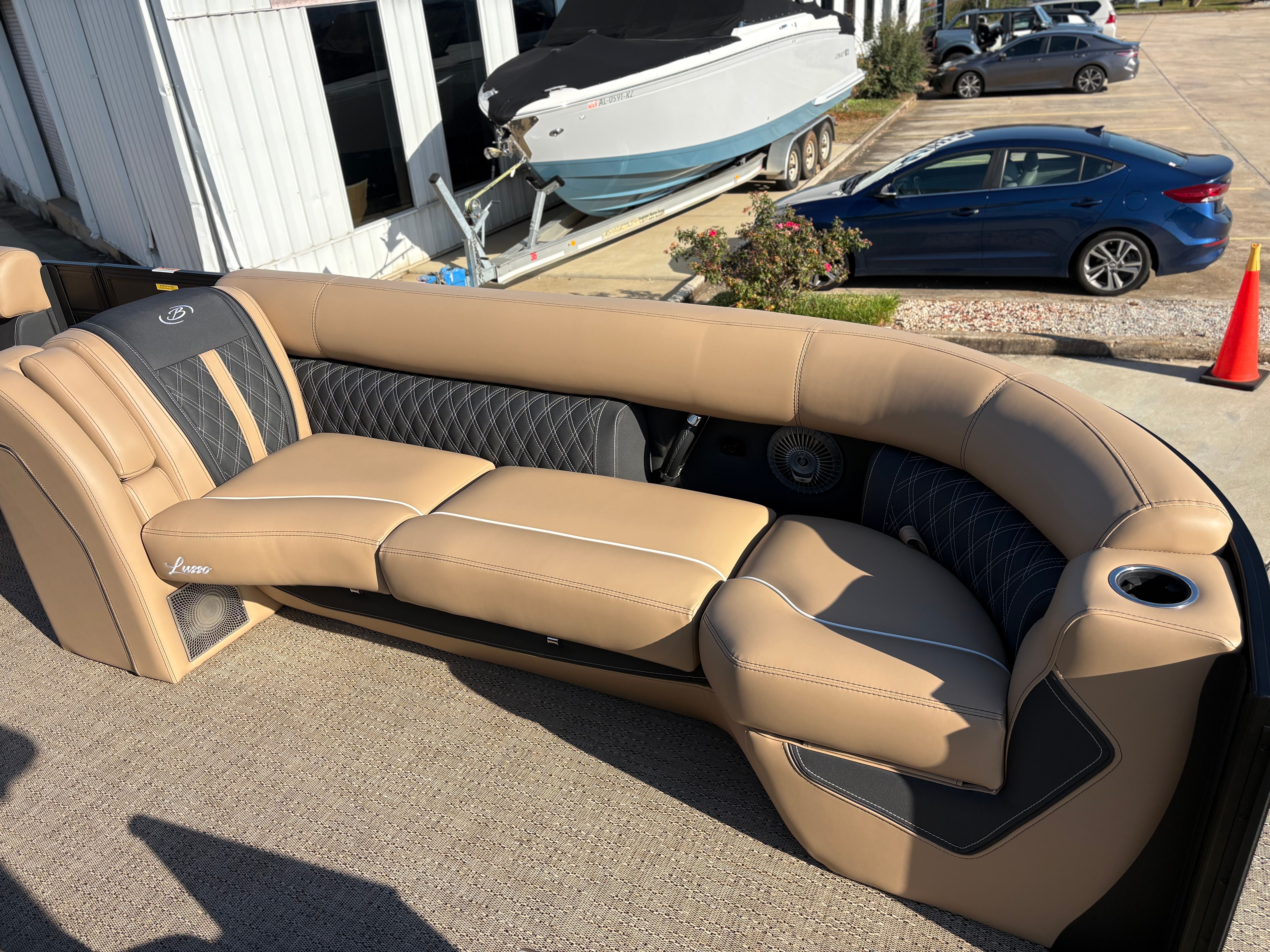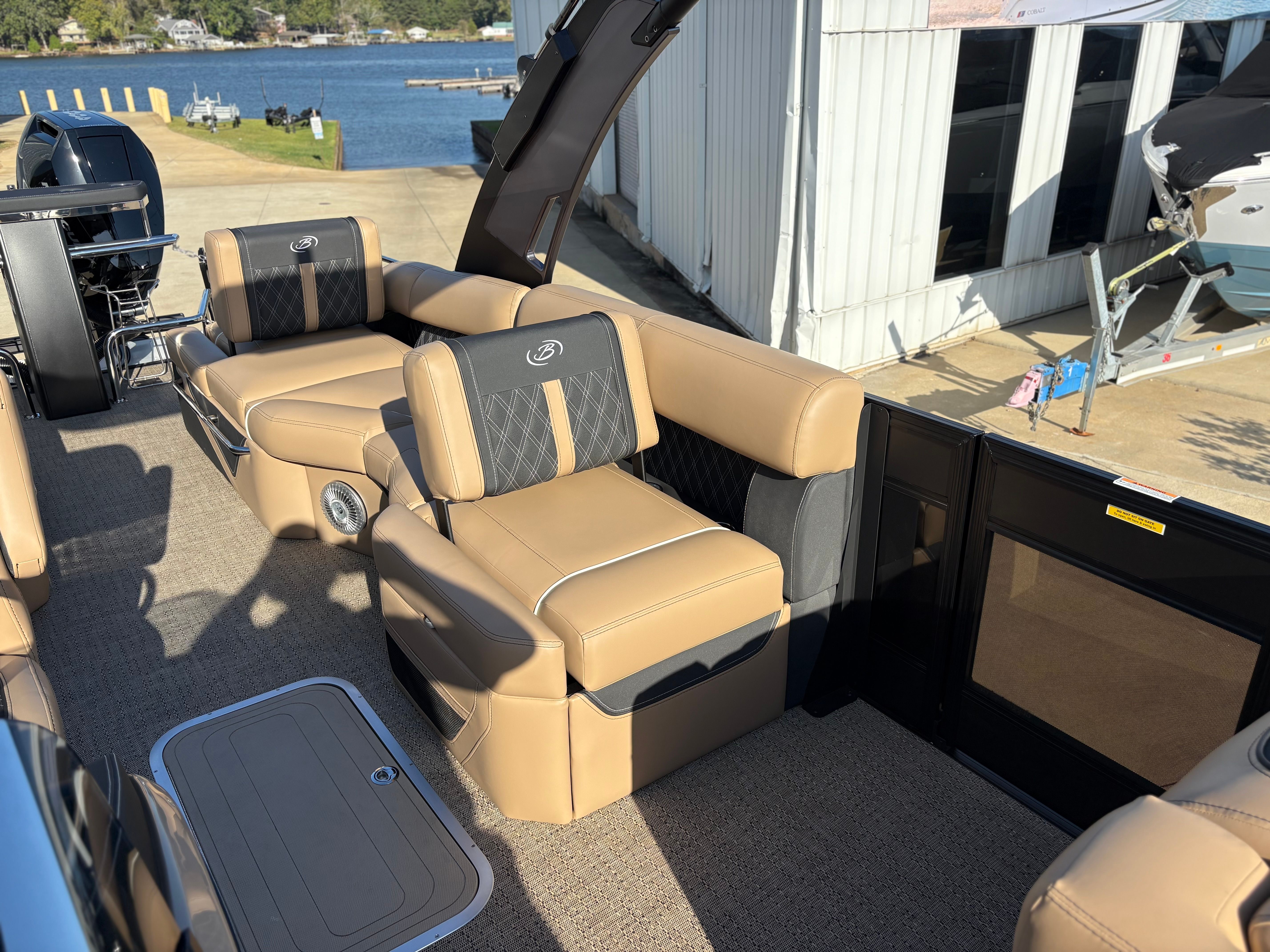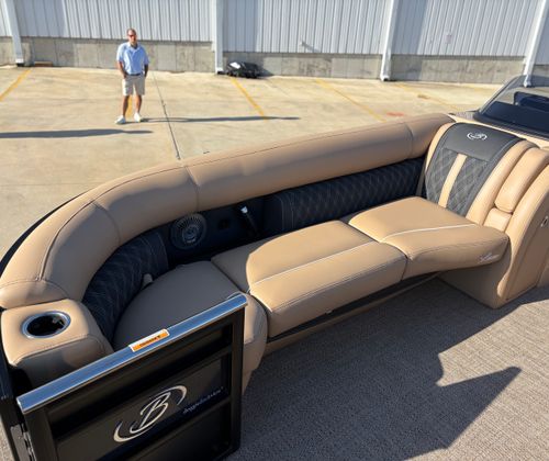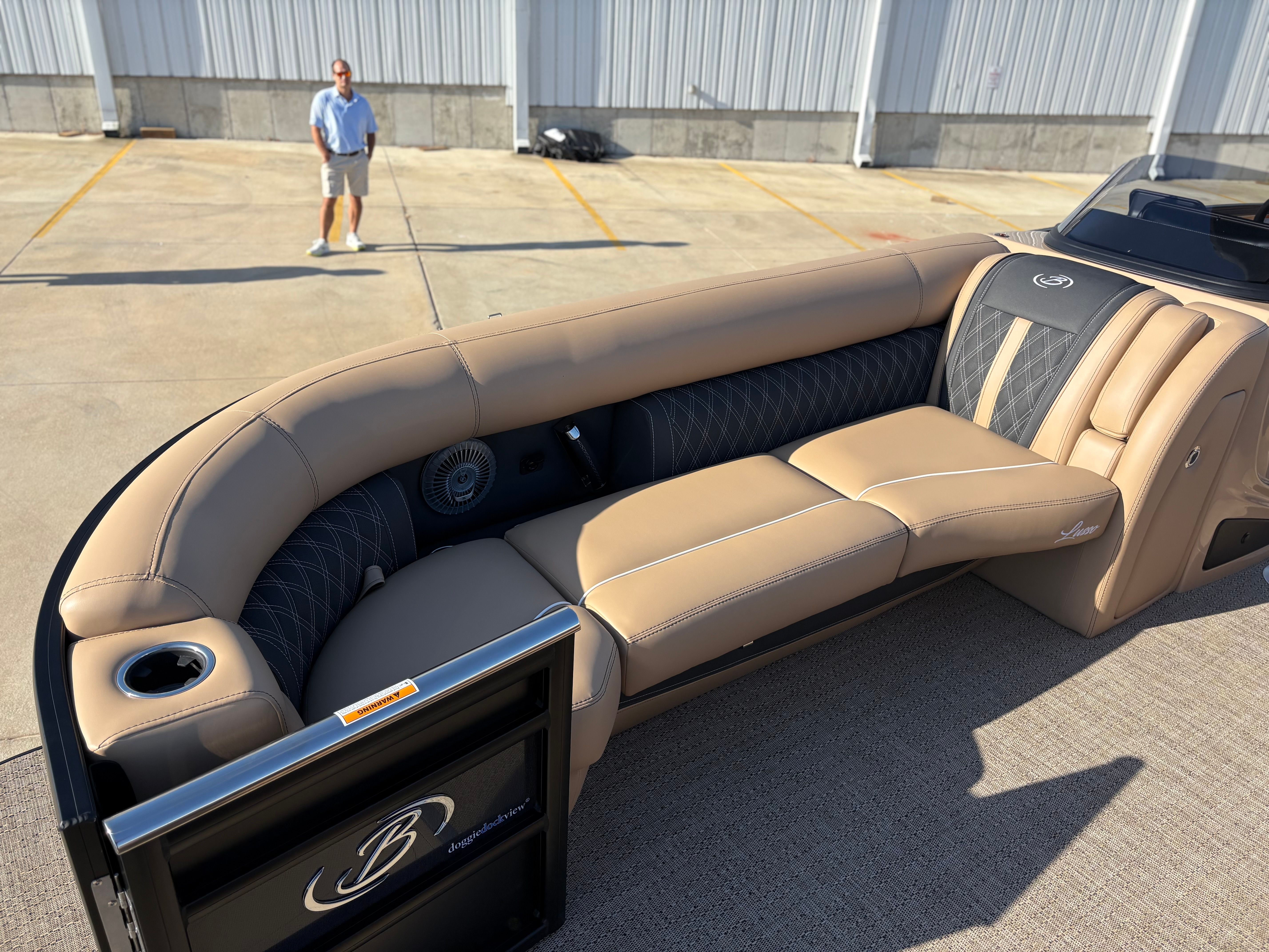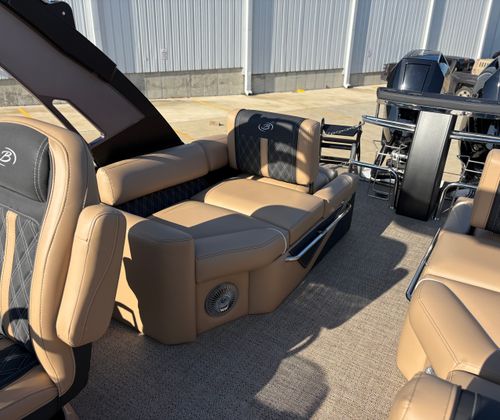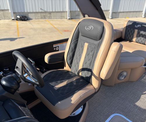 Step aboard the Barletta Lusso L25MAT and discover a world of premium features designed to enhance your boating experience. The exterior lighting package includes white underdeck and underwater lights, creating a captivating ambiance for evening cruises and dockside gatherings. The flooring is finished in luxurious Amore Tan, providing both comfort and style underfoot, while the enhanced metal jacket protectant ensures long-lasting durability and protection against the elements.The accent color in Black Diamond, paired with the sweep color in Matte Black, gives this pontoon a striking and contemporary appearance. The furniture, upholstered in Carmella Tan with Onyx accents, offers plush seating and a refined aesthetic, making every moment on board feel like a first-class experience. The on-board battery charger, specifically designed for three batteries on twin boats, ensures you have ample power for all your electronic needs, from navigation to entertainment.