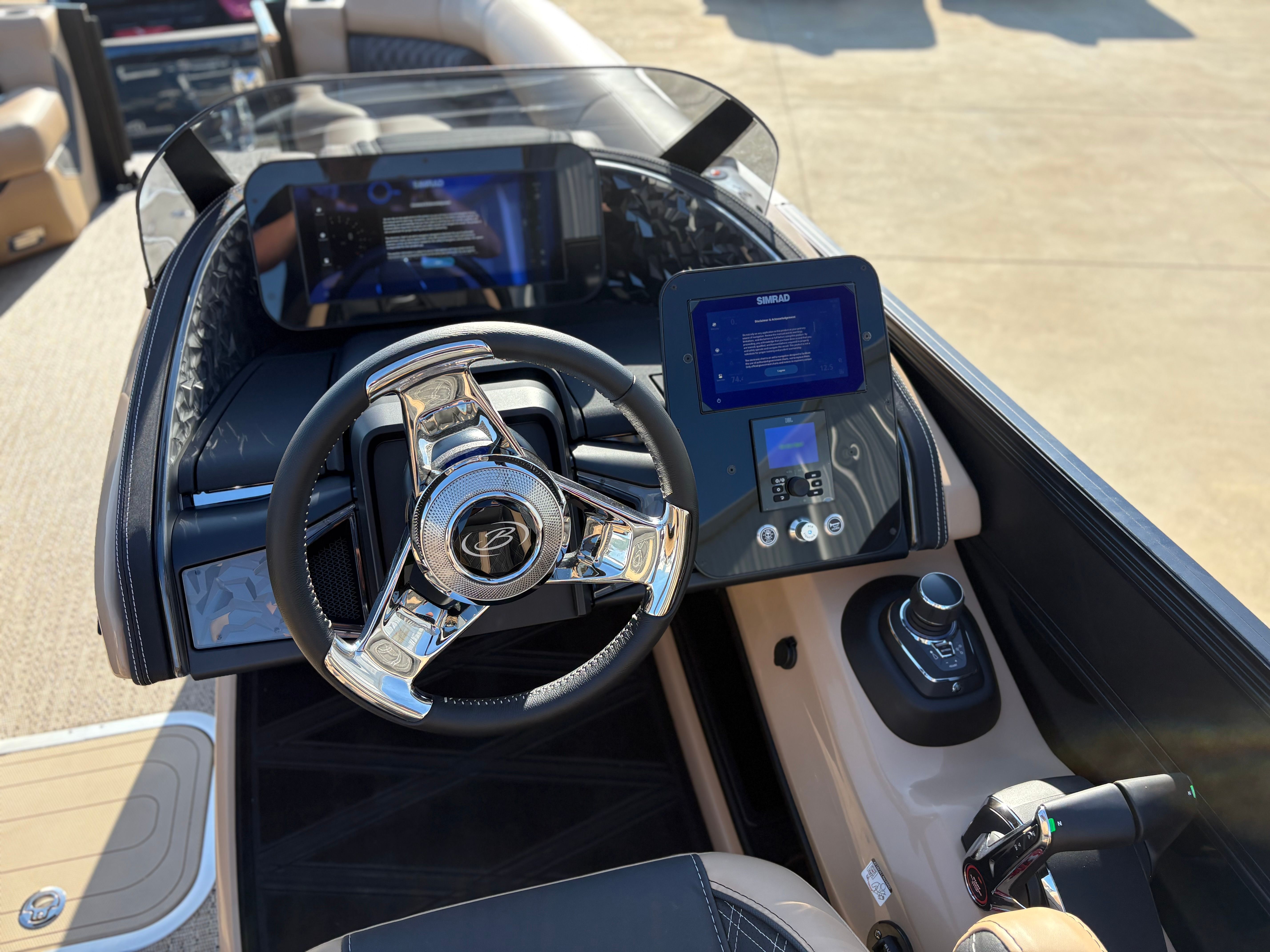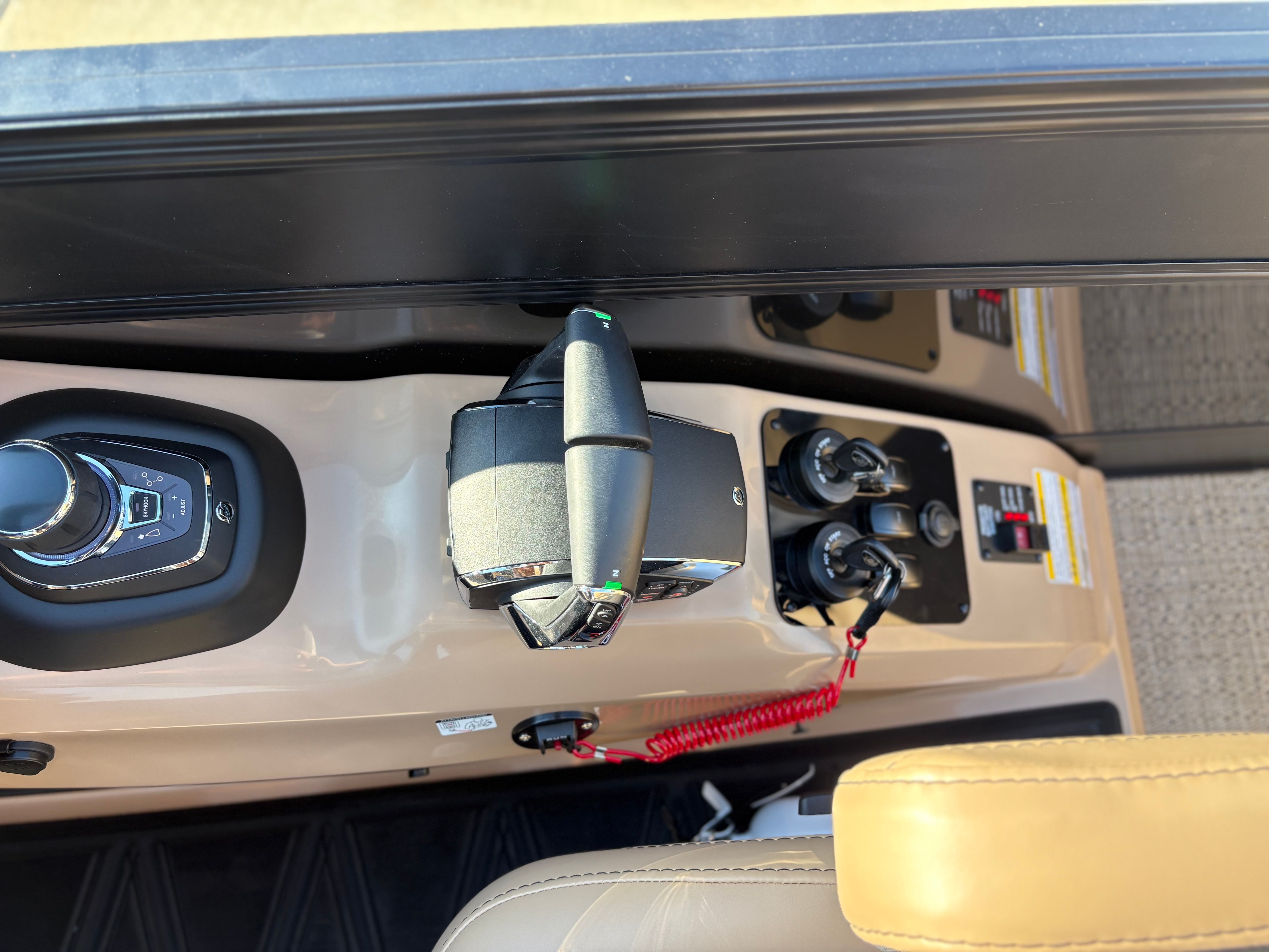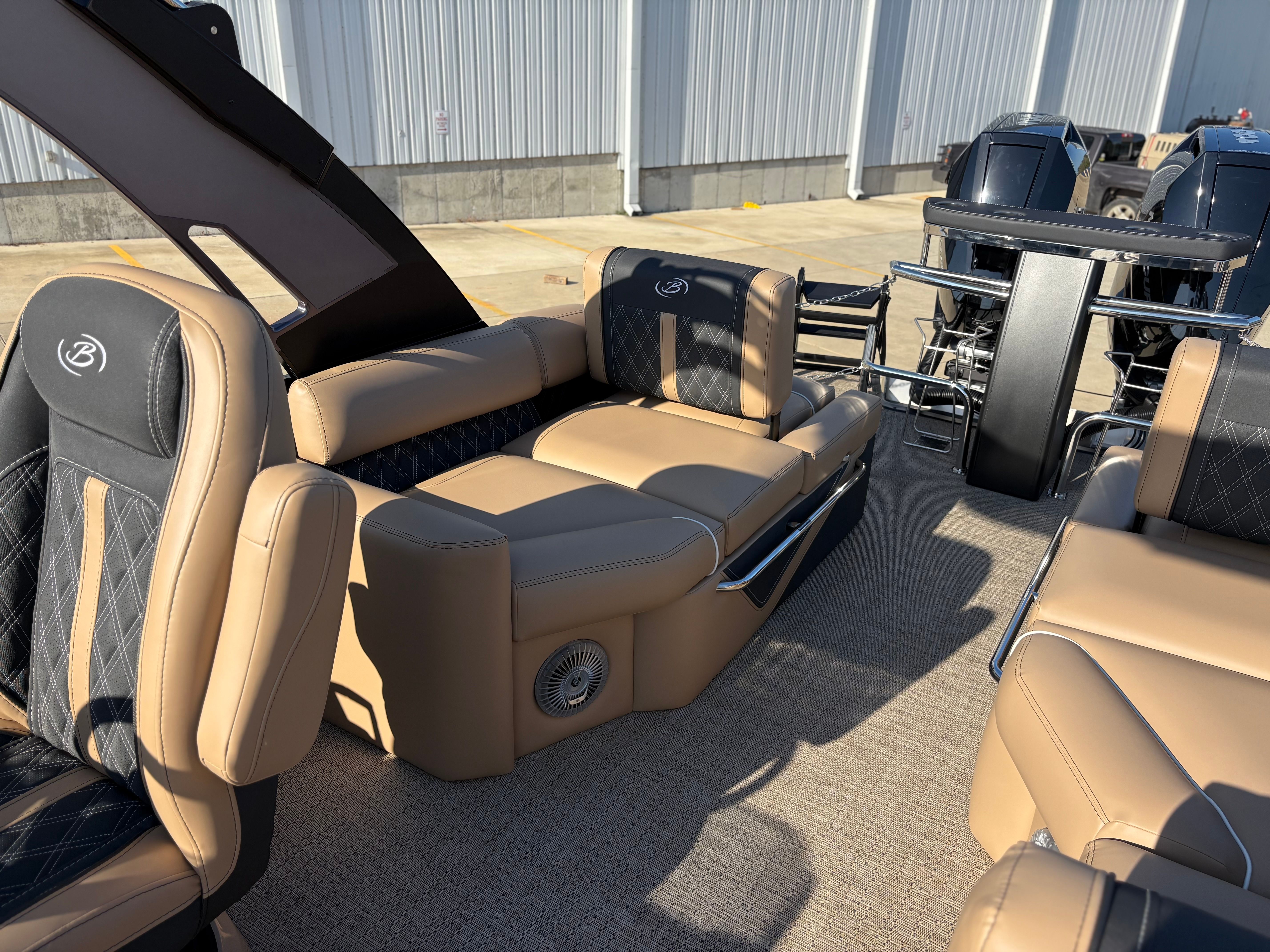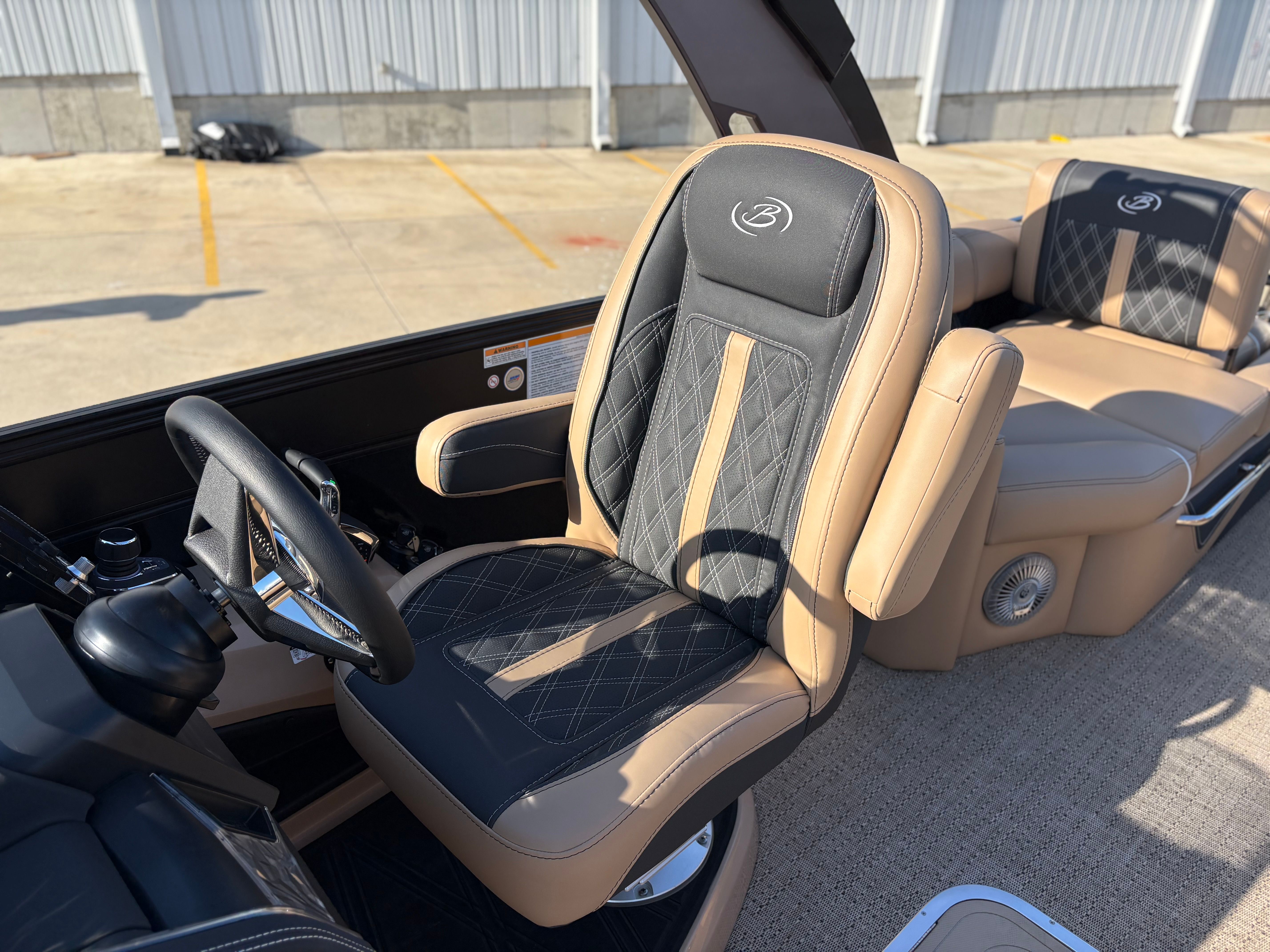 Step aboard the Barletta Lusso L25MAT and discover a world of premium features designed to enhance your boating experience. The exterior lighting package includes white underdeck and underwater lights, creating a captivating ambiance for evening cruises and dockside gatherings. The flooring is finished in luxurious Amore Tan, providing both comfort and style underfoot, while the enhanced metal jacket protectant ensures long-lasting durability and protection against the elements.The accent color in Black Diamond, paired with the sweep color in Matte Black, gives this pontoon a striking and contemporary appearance. The furniture, upholstered in Carmella Tan with Onyx accents, offers plush seating and a refined aesthetic, making every moment on board feel like a first-class experience. The on-board battery charger, specifically designed for three batteries on twin boats, ensures you have ample power for all your electronic needs, from navigation to entertainment.