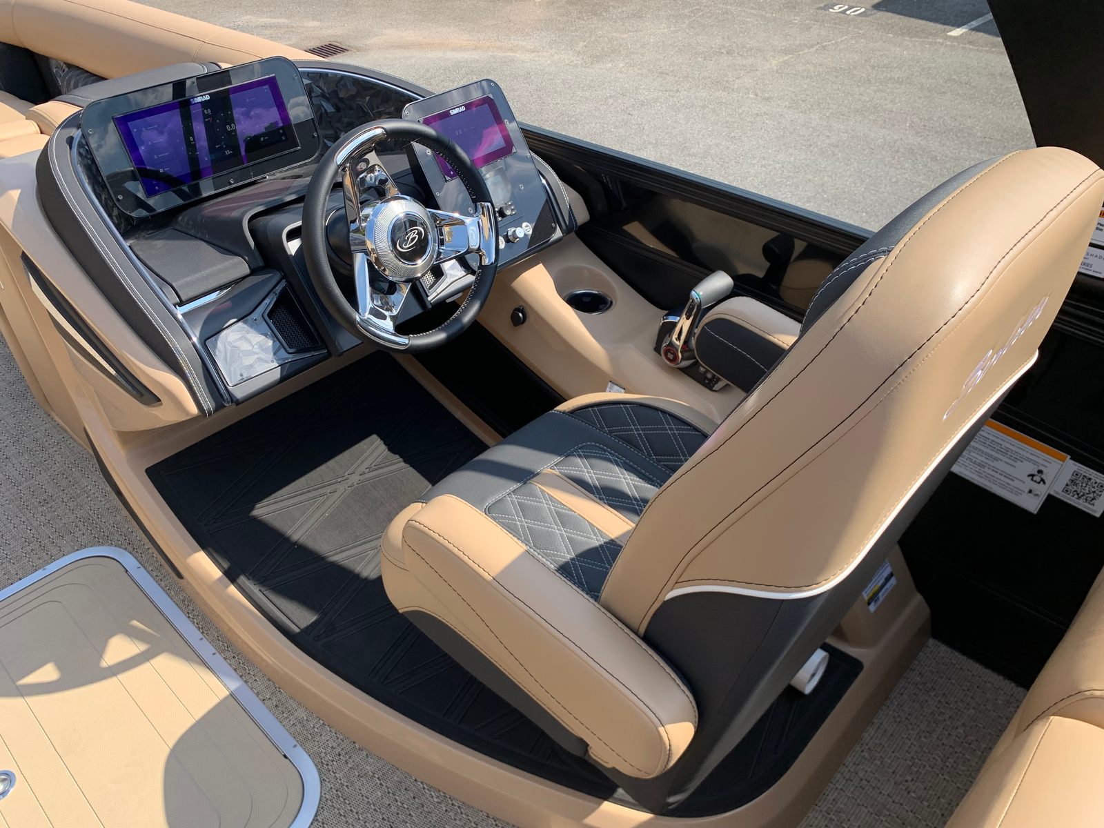 The 2026 Barletta Lusso L25QCSS is loaded with premium features designed to elevate your time on the water. The Blackout Package Lusso Railskin adds a touch of elegance and exclusivity, while the Sport Bimini (installed in place of the standard bimini) offers superior sun protection and a sporty look. Enjoy the ambiance created by white underdeck and underwater exterior lighting, perfect for evening cruises or entertaining guests after sunset. The flooring features luxurious Amore Tan material, providing both comfort and durability underfoot. The furniture is upholstered in Carmella Tan with Onyx accents, ensuring a plush and stylish seating arrangement for all passengers.