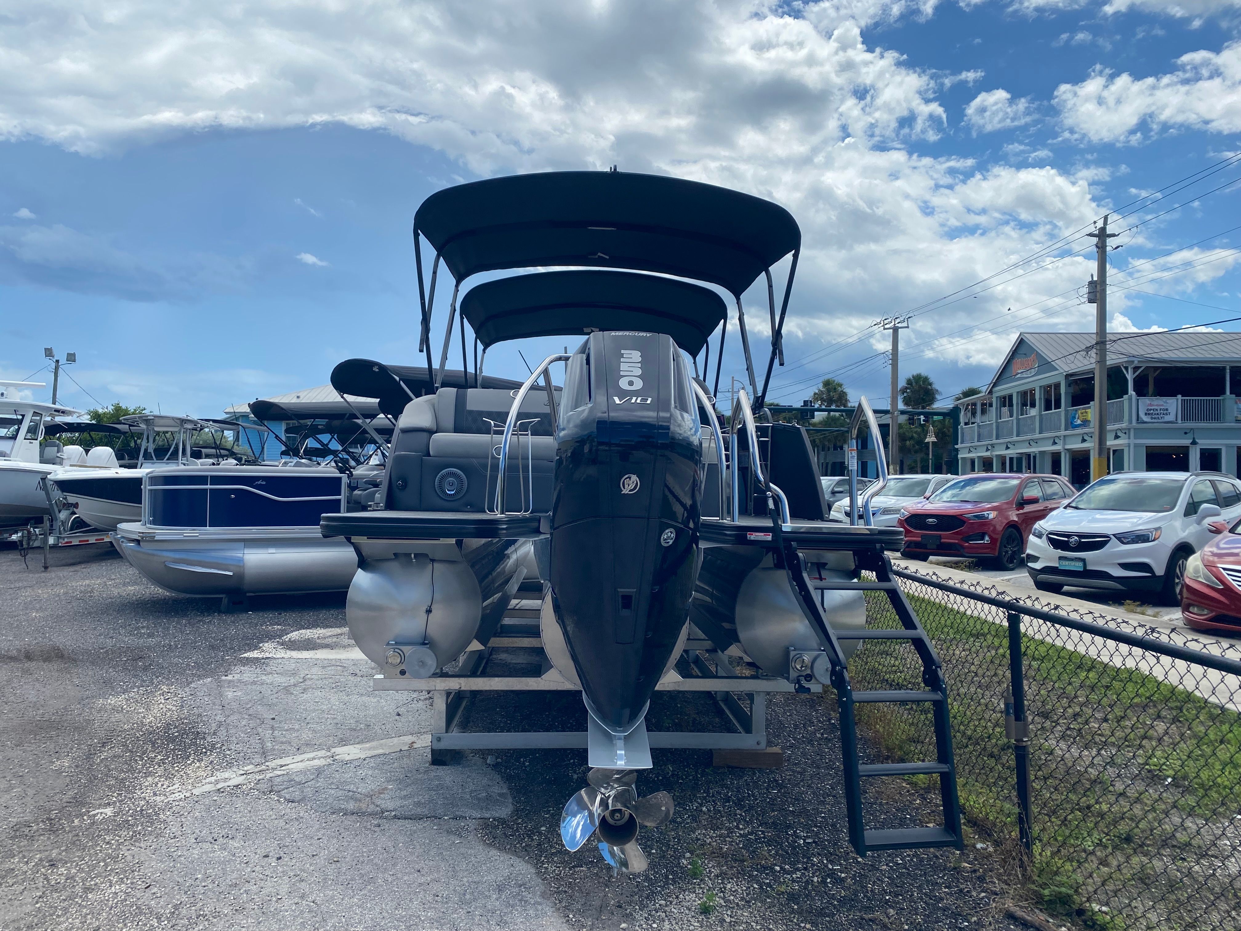 This Barletta pontoon boat is loaded with premium features that set it apart from the competition. The Coastal Edition Lusso ensures durability and resilience in a variety of water conditions, making it ideal for both freshwater and coastal adventures. The double bimini offers generous shade, allowing you and your guests to relax in comfort during sunny days. Exterior lighting, including white underdeck and underwater lights, not only enhances the boat’s visual appeal but also provides added safety and ambiance for evening cruises. The Blackout Package Lusso railskin and Gray Moonstone accent color give the boat a modern, upscale look, while the Marquesan Gray furniture with Charcoal accents delivers both comfort and elegance. The Mercury Digital Pre-Rig for V10 and AccuThruster System further enhance the Lusso L25U’s advanced technology suite, ensuring a seamless and enjoyable boating experience.