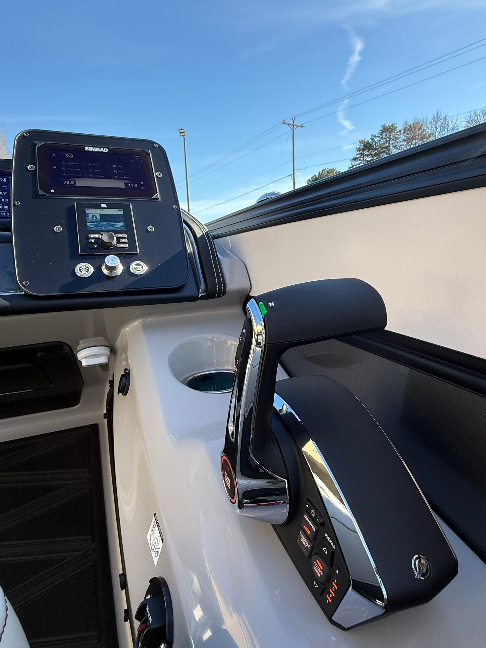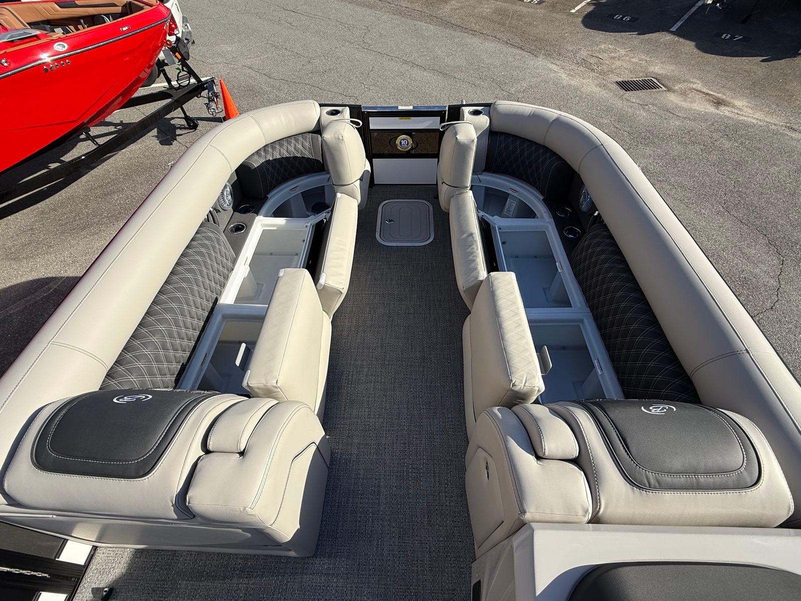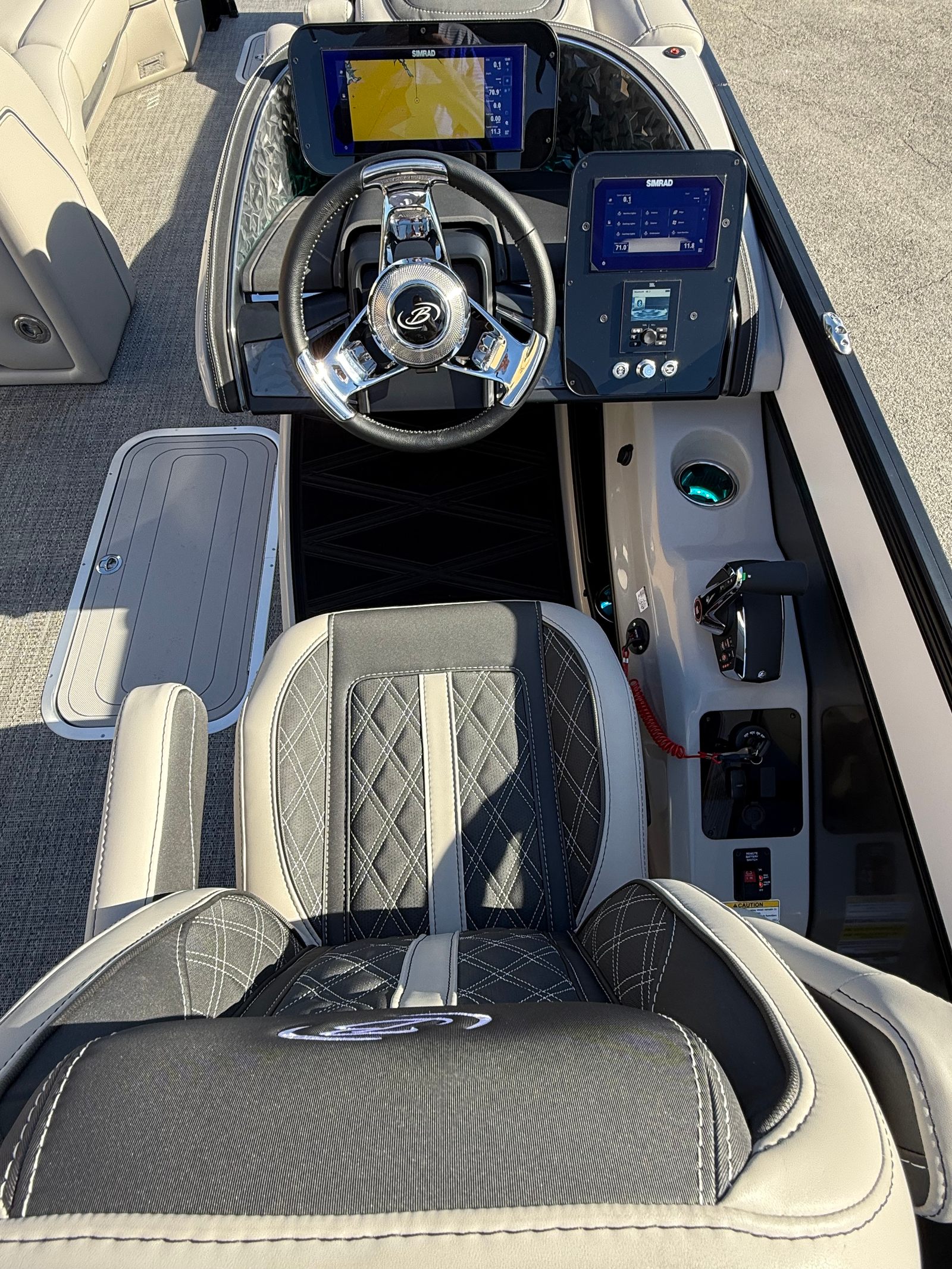 The Barletta Lusso L25UC is packed with special features that elevate your boating experience. The onboard battery charger supports two batteries, ensuring you have plenty of power for extended outings. Exterior lighting, including white underdeck and underwater lights, adds a dramatic flair for evening cruises and enhances safety during nighttime adventures. The furniture is upholstered in Marquesan Gray with Onyx accents, offering plush seating and a modern look, while the Amore Gray flooring is both stylish and durable. The Blackout Package Lusso railskin gives the boat a contemporary edge, and the sweep color in Winter White with Gray Moonstone accents ensures you’ll turn heads wherever you go. Mercury Digital DTS Pre-Rig and Vessel Link integration provide advanced connectivity and control, while hydraulic and power assist steering make handling effortless. Digital gauges keep you informed at a glance, and the rigging includes a stainless steel prop for optimal performance.