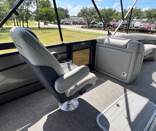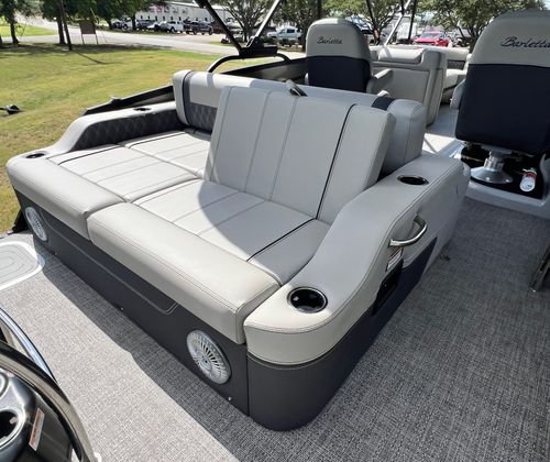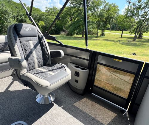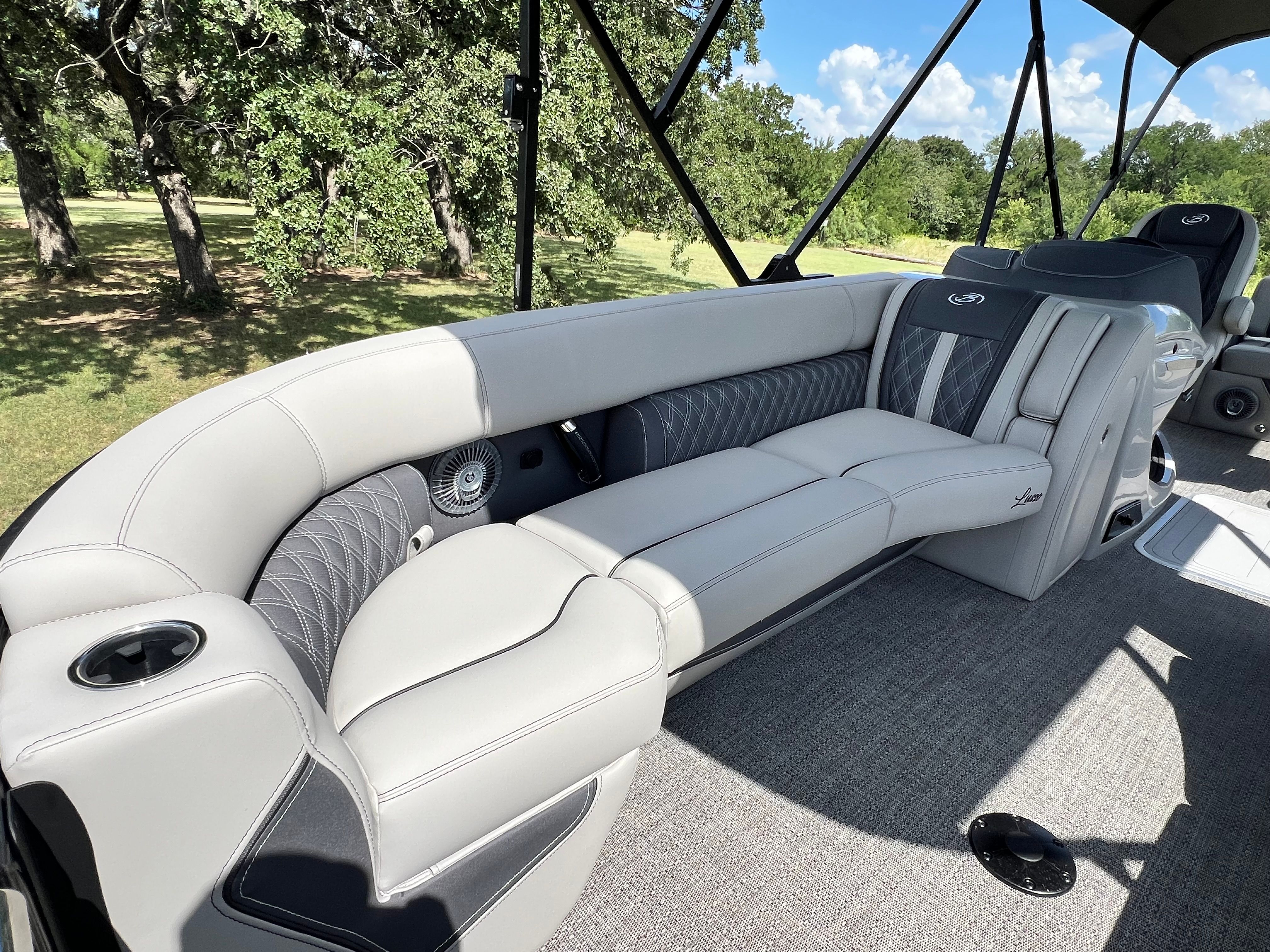 The 2025 Barletta Lusso L25UC is loaded with special features that enhance both comfort and convenience. Step inside and you will find a beautifully appointed interior, featuring a table with a pedestal and base, complete with Yeti-ready cupholders—perfect for keeping your favorite beverages secure while you relax or entertain. The furniture is finished in a sophisticated Marquesan Gray with Charcoal Accent, complemented by Amore Gray flooring that is both stylish and easy to maintain.For those who appreciate versatility and shade, the Lusso L25UC comes equipped with a double bimini, including an additional power bimini for effortless adjustment. The Blackout Package Lusso adds a bold, modern touch to the railskin, while the Metal Jacket Protectant on the exterior ensures your pontoon boat stays looking pristine season after season. The captain’s chair features an adjustable pedestal, providing customized comfort for long days on the water.