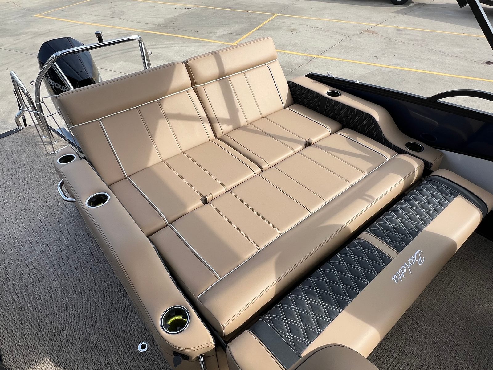 The 2026 Barletta Lusso L25UC stands out as a premier pontoon boat, measuring an impressive 27.5 feet in length. This spacious layout provides ample room for family, friends, and all your favorite water activities. The Lusso L25UC is designed with both relaxation and entertainment in mind, making it the perfect vessel for those who appreciate the finer things in life. With its striking Blue Sapphire sweep color, complemented by a Winter White accent and the Blackout Package Lusso railskin, this pontoon commands attention wherever it goes. The Carmella Tan with Onyx furniture and Amore Tan flooring create a warm, inviting atmosphere that exudes comfort and elegance.