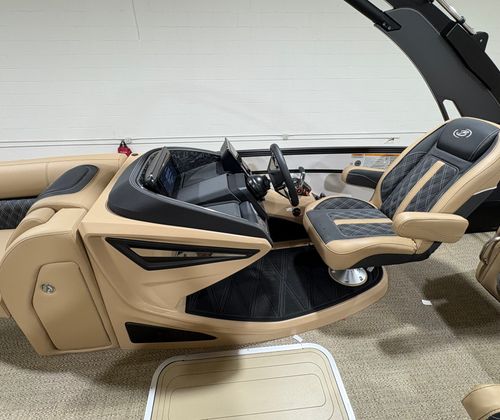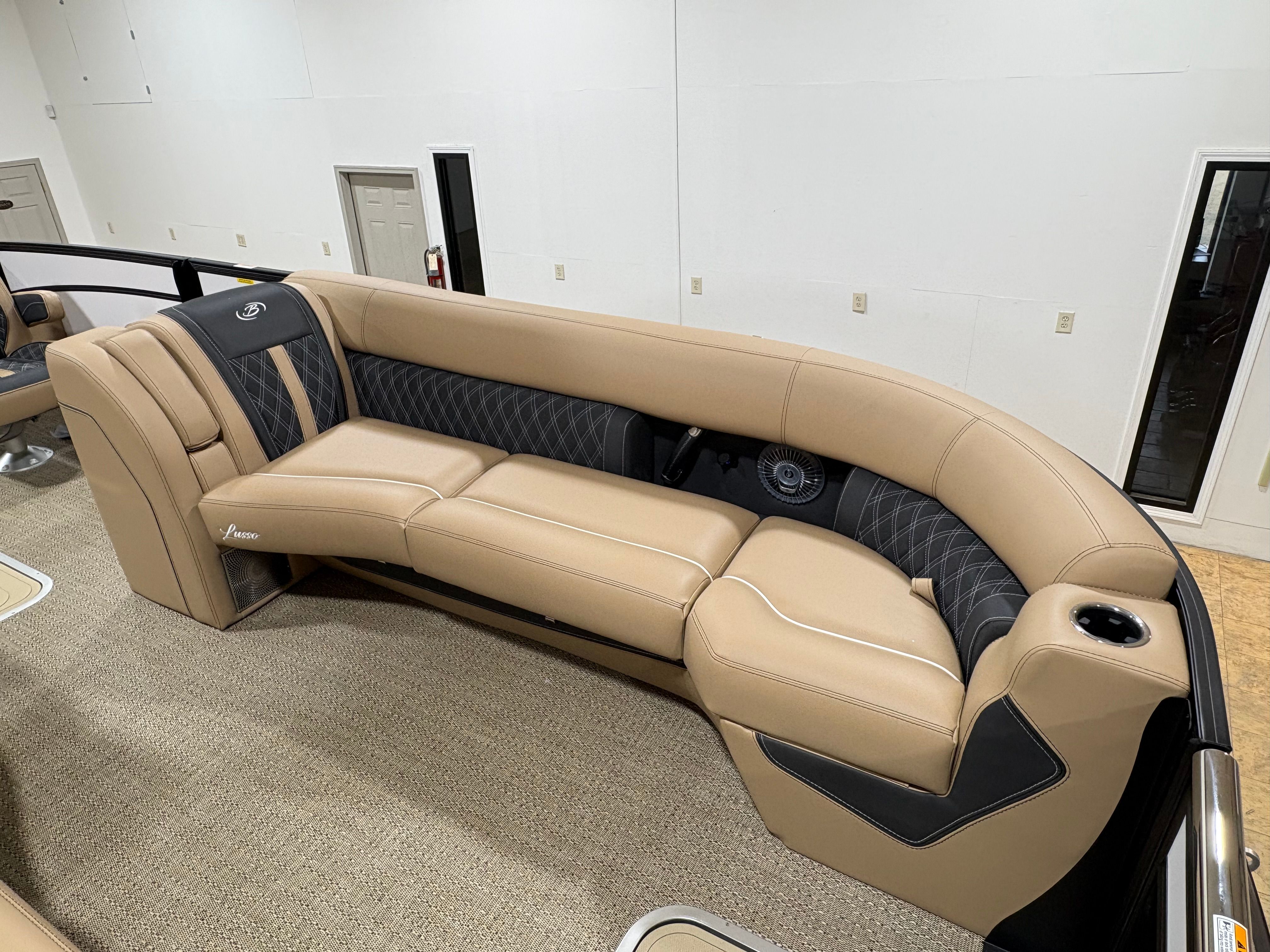 The 2026 Barletta Lusso L25UCA is a brand-new pontoon boat measuring an impressive 27.5 feet in length. Its sleek and modern profile is accentuated by the Winter White sweep and accent colors, creating a timeless and sophisticated look that will turn heads at any marina or lake. The Blackout Package Lusso railskin adds a bold touch, while the Carmella Tan with Onyx furniture and Amore Tan flooring provide a warm, inviting atmosphere for every passenger. As a new Barletta boat for sale, this Lusso L25UCA is designed to deliver both style and substance, making it an ideal choice for those who demand the best in recreational boating.