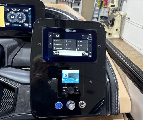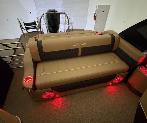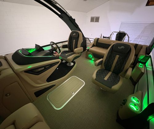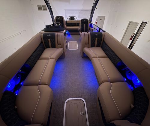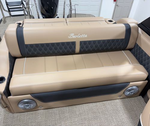 The Barletta Lusso L25UCA is packed with premium features that elevate your boating experience. The exterior lighting, including white underdeck and underwater lights, creates a captivating ambiance for evening cruises and dockside gatherings. Digital gauges provide clear, real-time information at a glance, ensuring you stay informed and in control at all times. The carefully selected Carmella Tan with Onyx furniture offers plush seating and ample space for relaxation, while the Amore Tan flooring adds a touch of elegance and comfort underfoot. The Blackout Package Lusso railskin not only enhances the boat’s appearance but also adds an extra layer of sophistication and exclusivity.